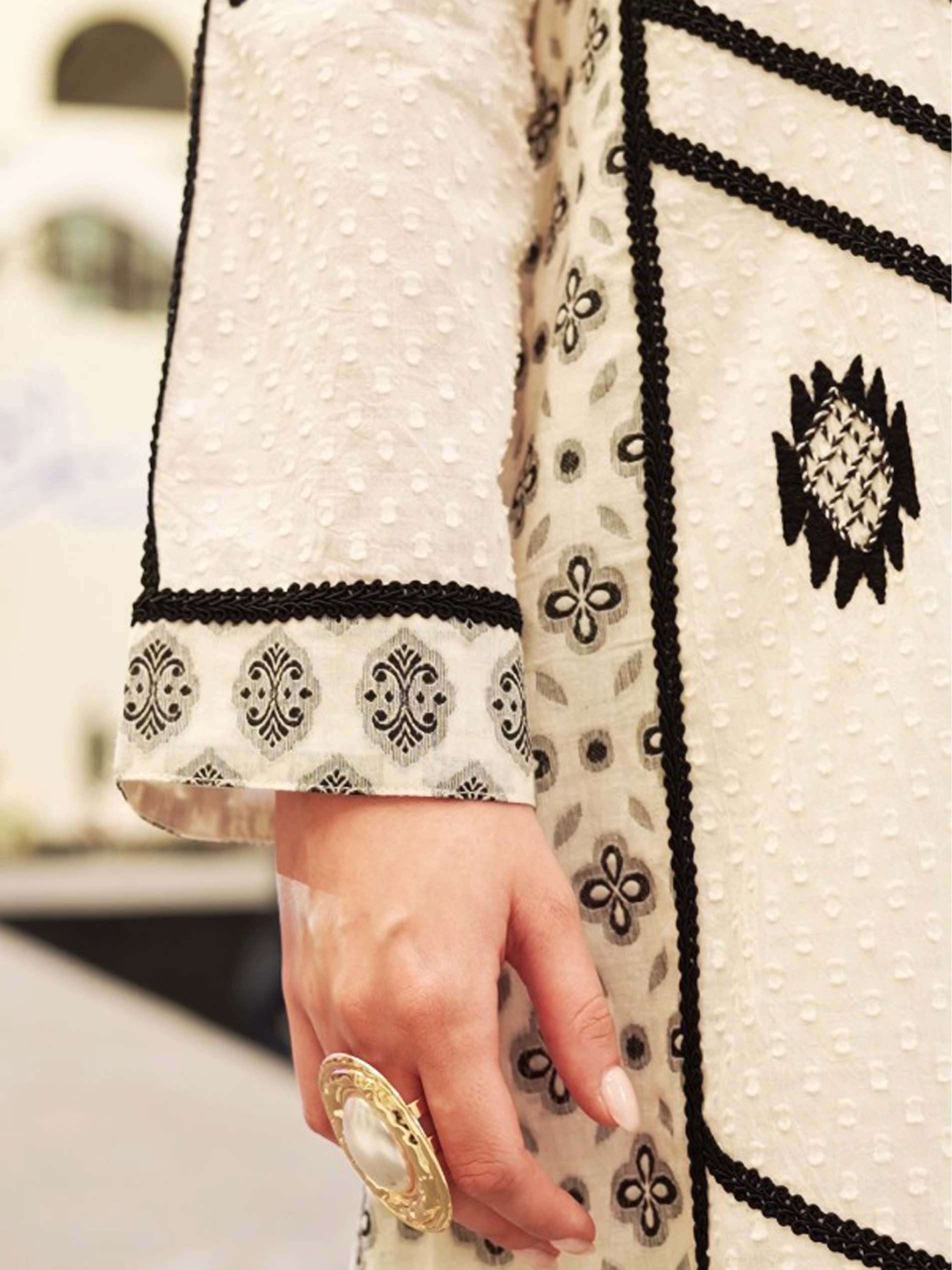 اذا كنتي من محبين اللون الرمادي الفاتح، تعتبر هذه الجلابية الاختيار الأمثل لك، فهي مصممة بنقش اسود وأكمام مميزة لاطلالة أنيقة وملفتة في رمضان.