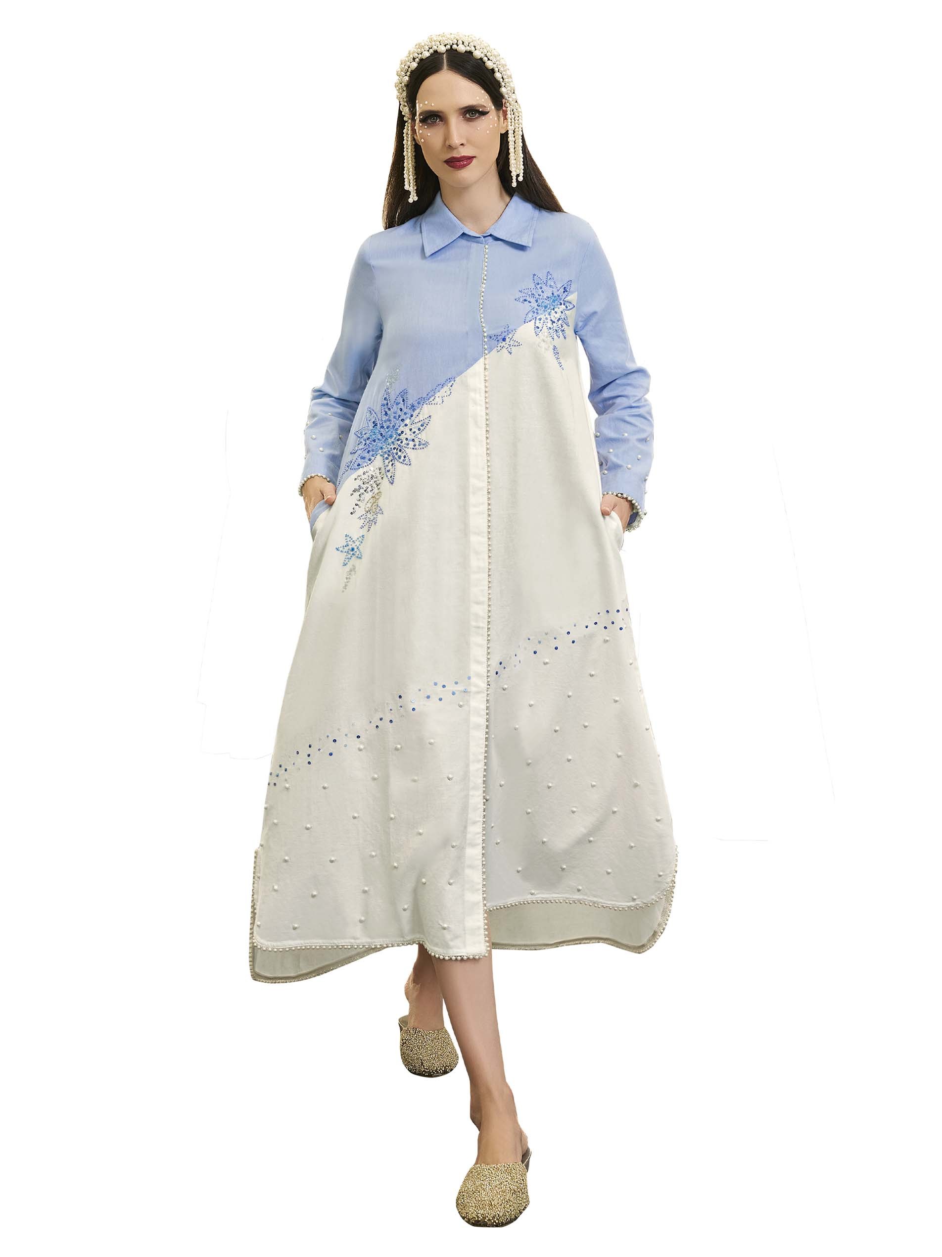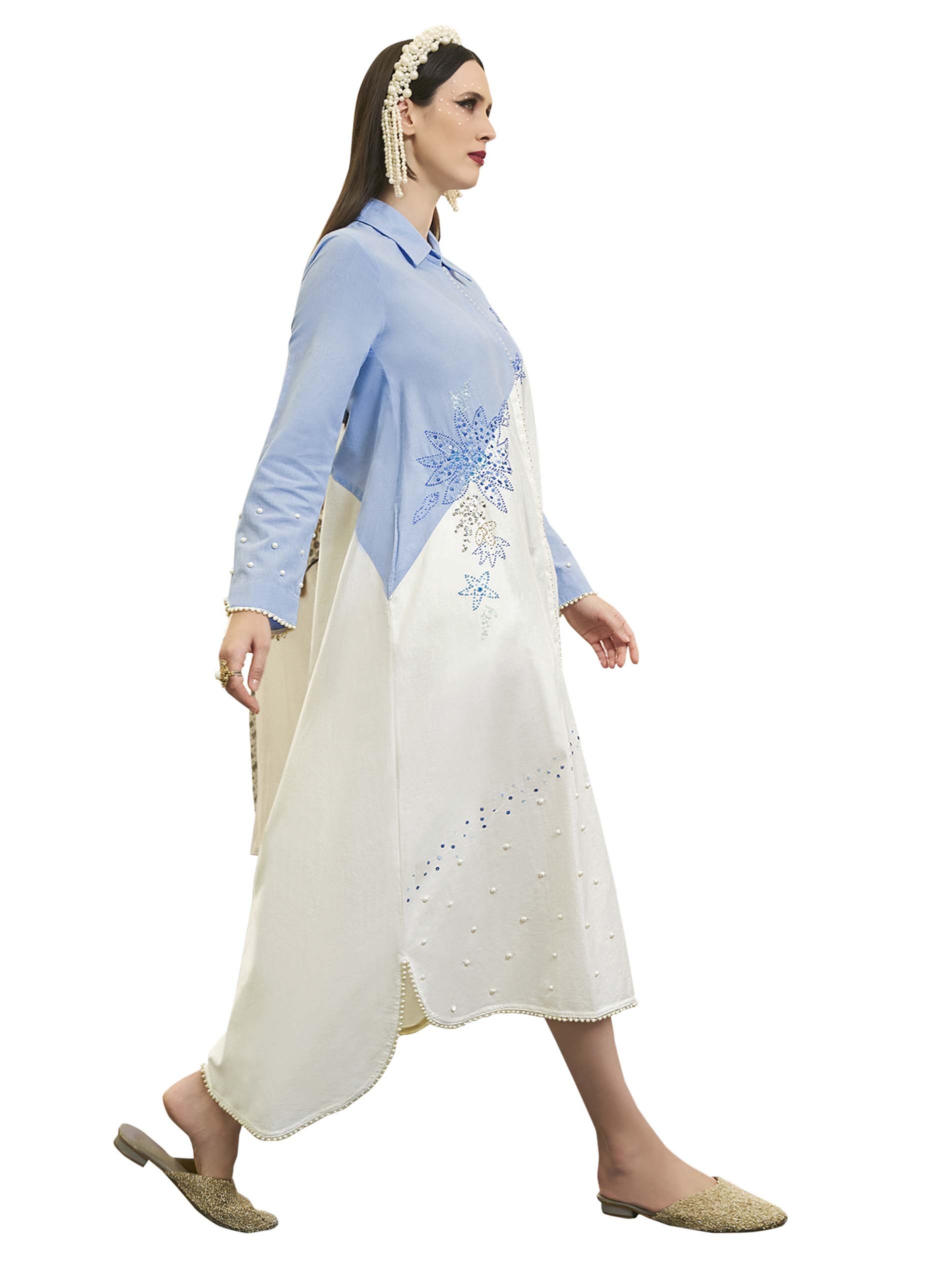 جلابية بتصميم بسيط مصنوعة من القطن باللونين الأزرق والأبيض مع تطريز بسيط على شكل نقشة الأزهار لاطلالة فريدة من نوعها في الحفلات والمناسبات.