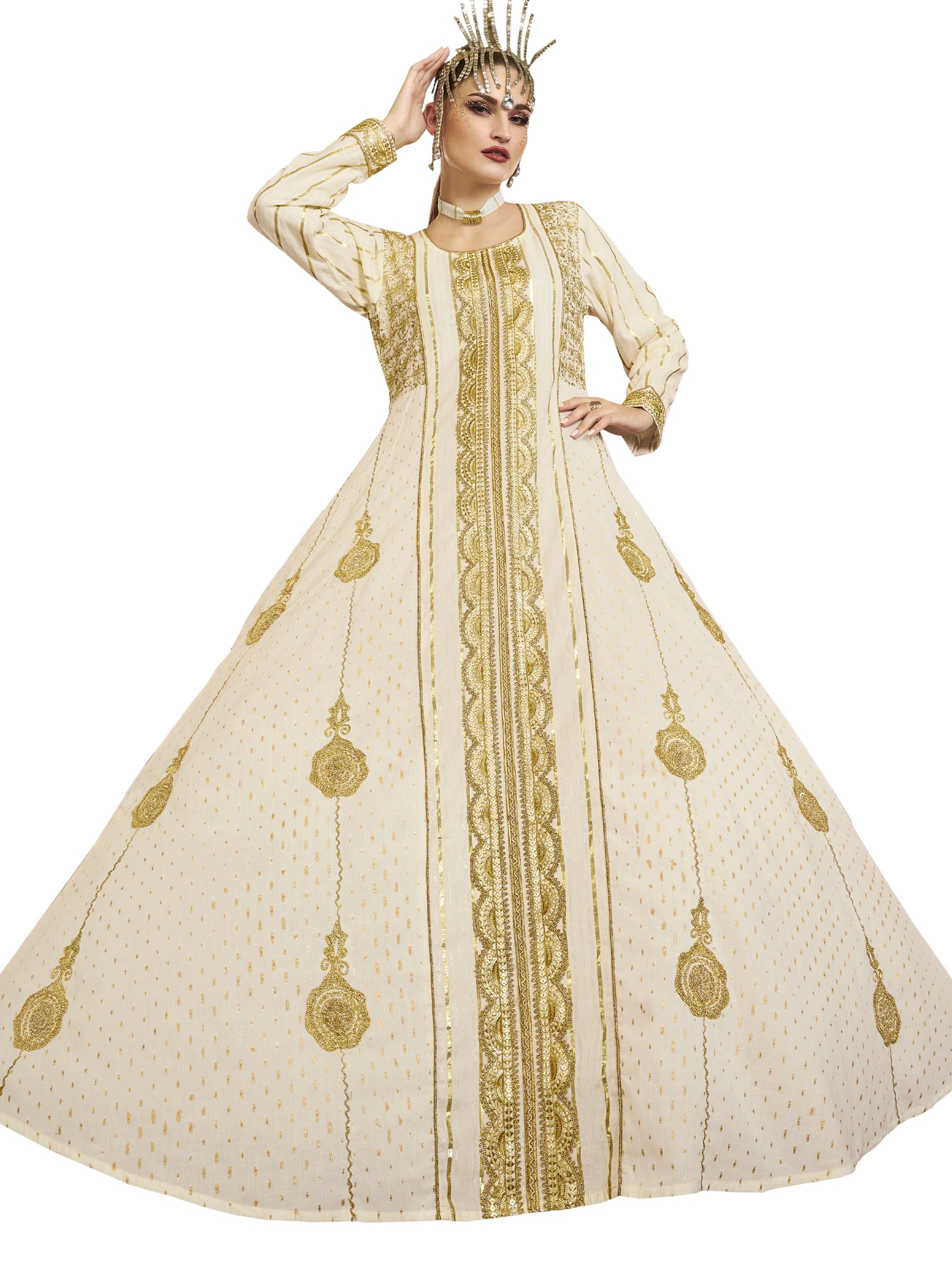 تألقي باطلالة تأسر القلوب مع هذه الجلابية الملكية البيضاء، مصممة من القطن بتطريز ذهبي فاخر.