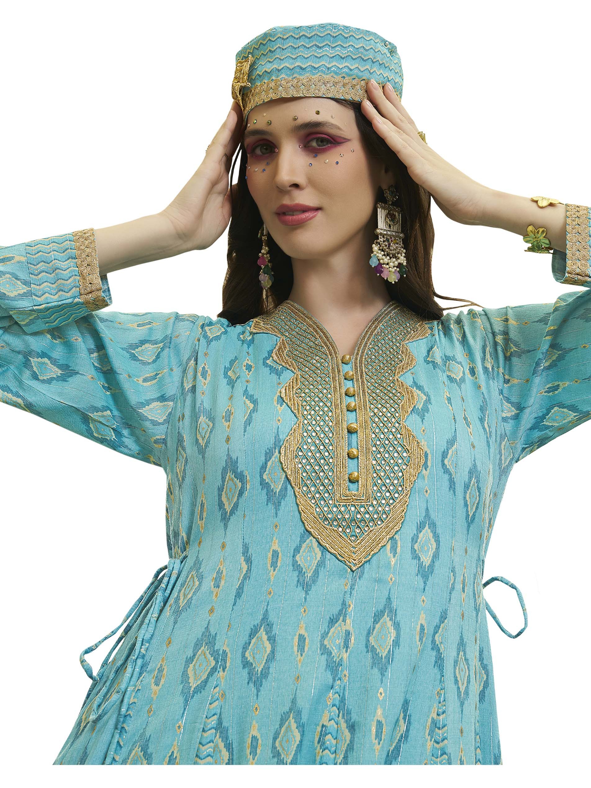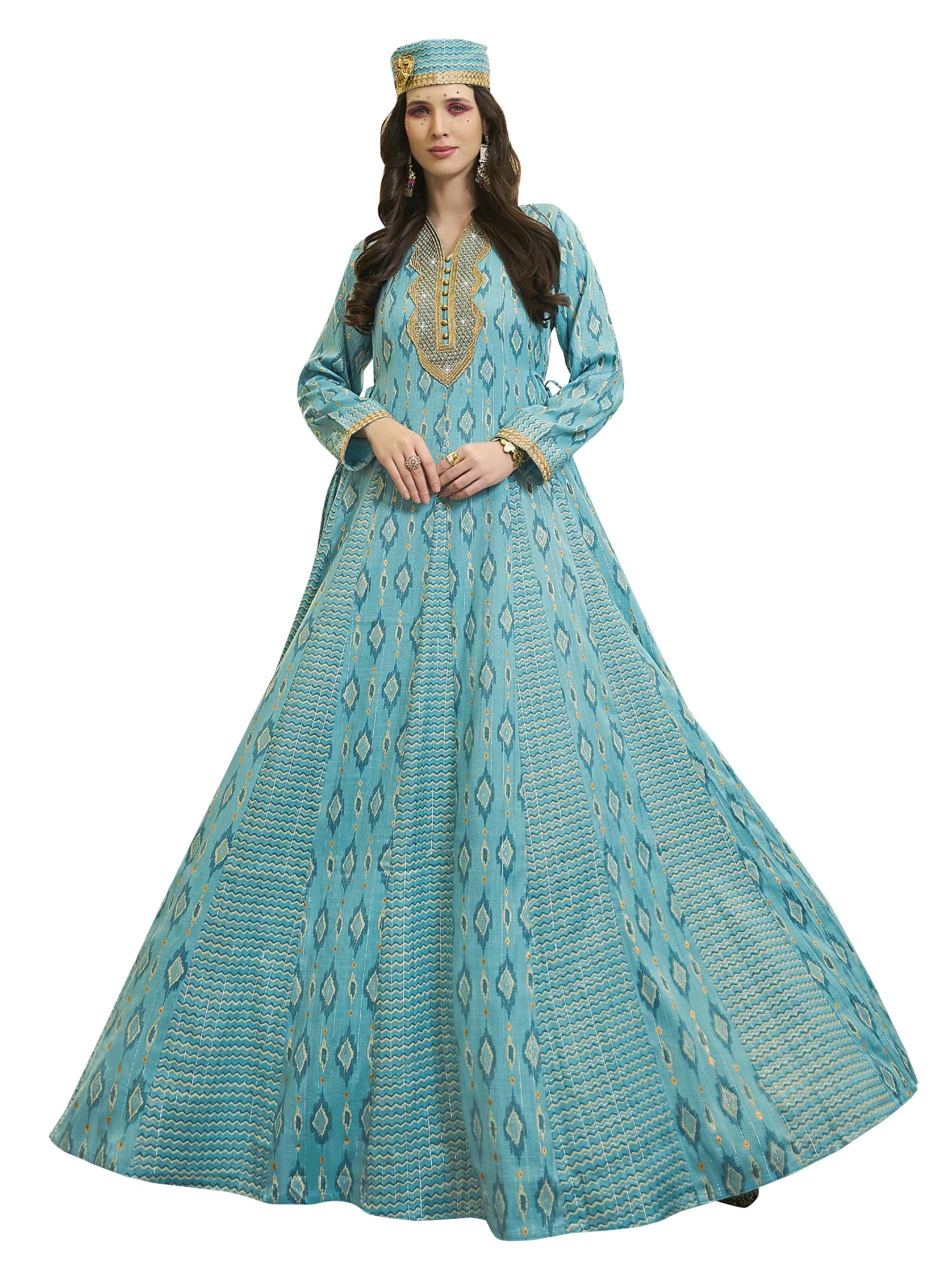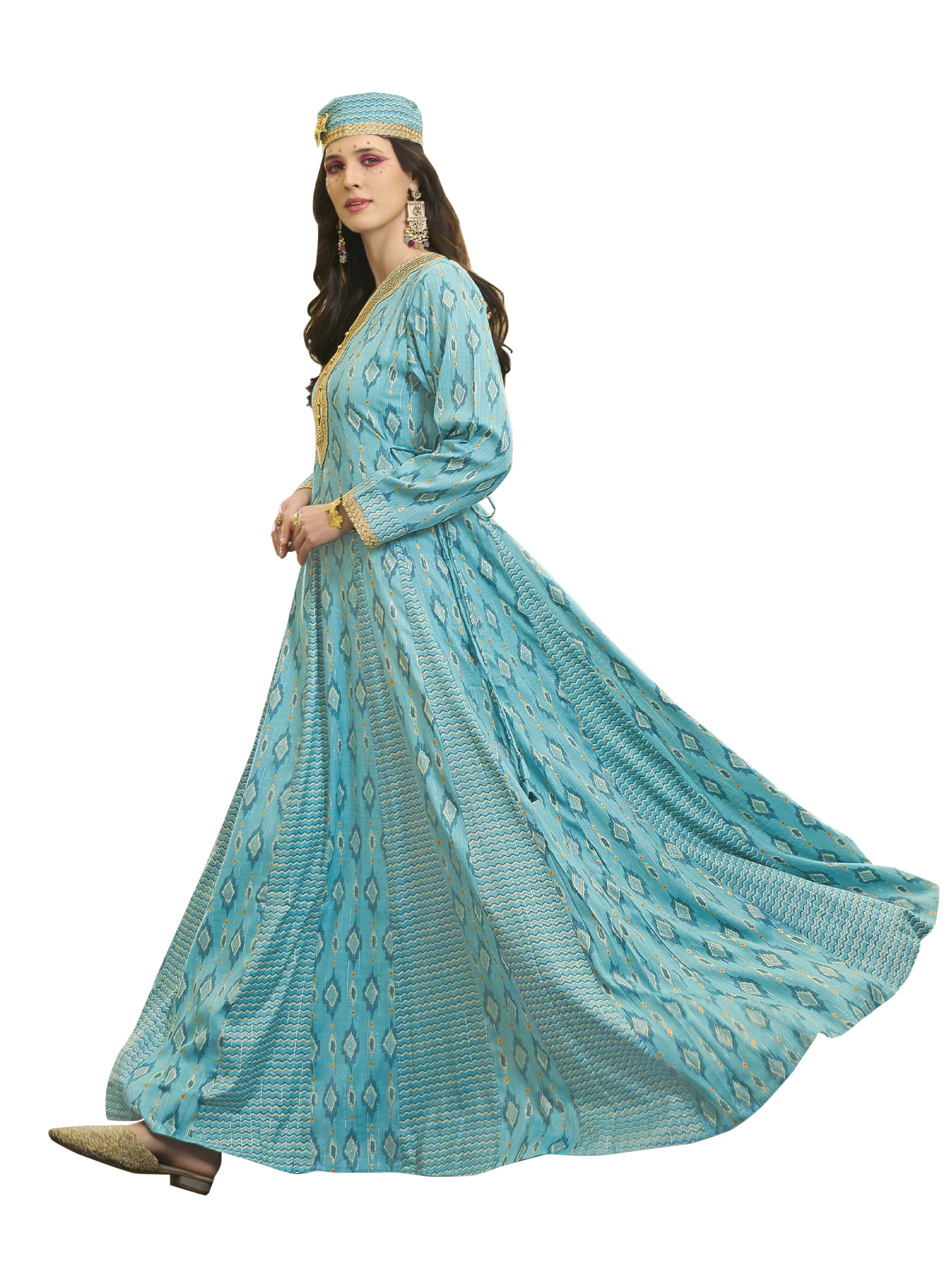 جلابية ماكسي طويلة من سارة زرقاء اللون، مصممة بنقوش متعرجة ومتداخلة مع نقوش الايكات لاطلالة مثالية في المناسبات.
