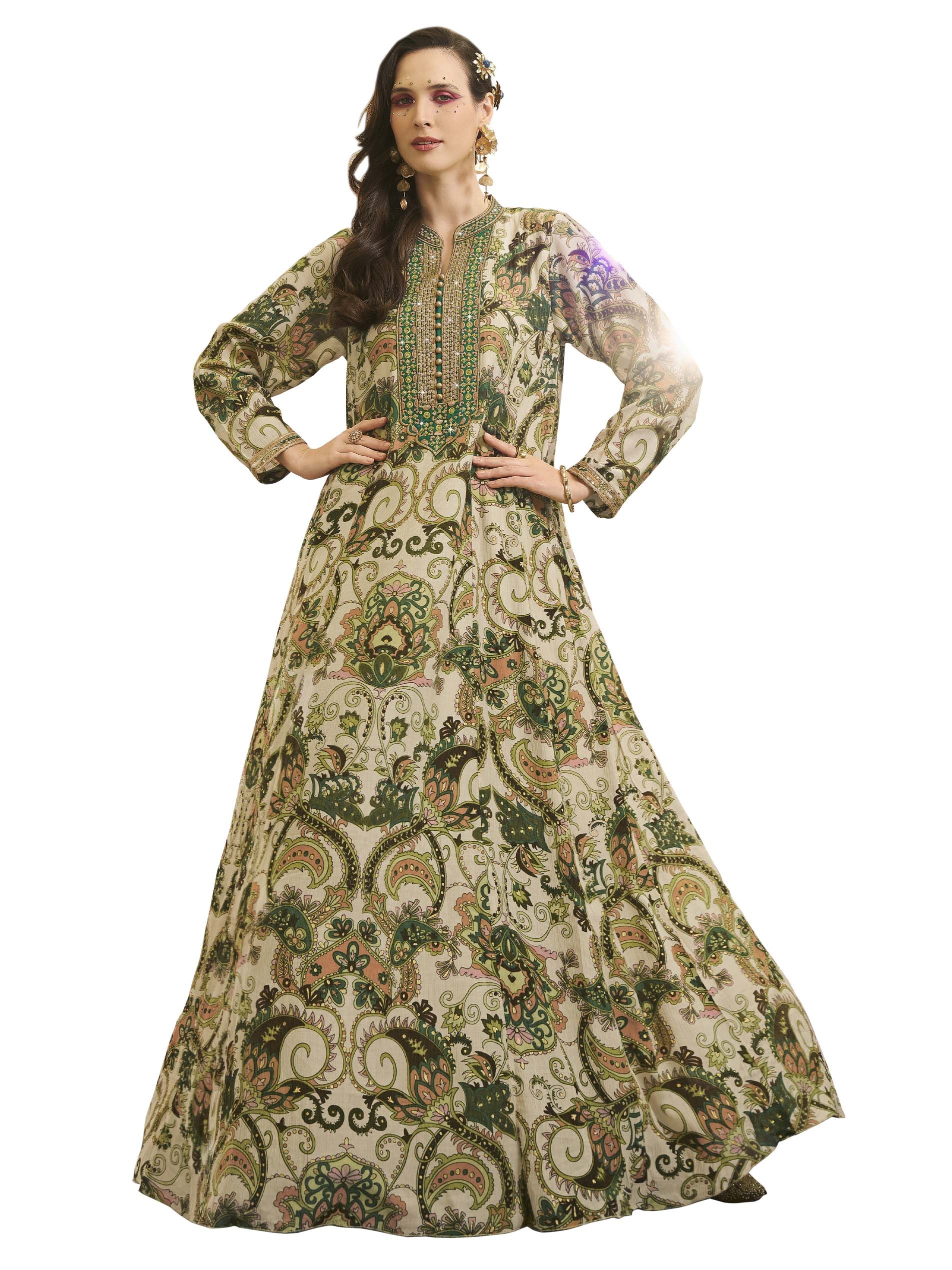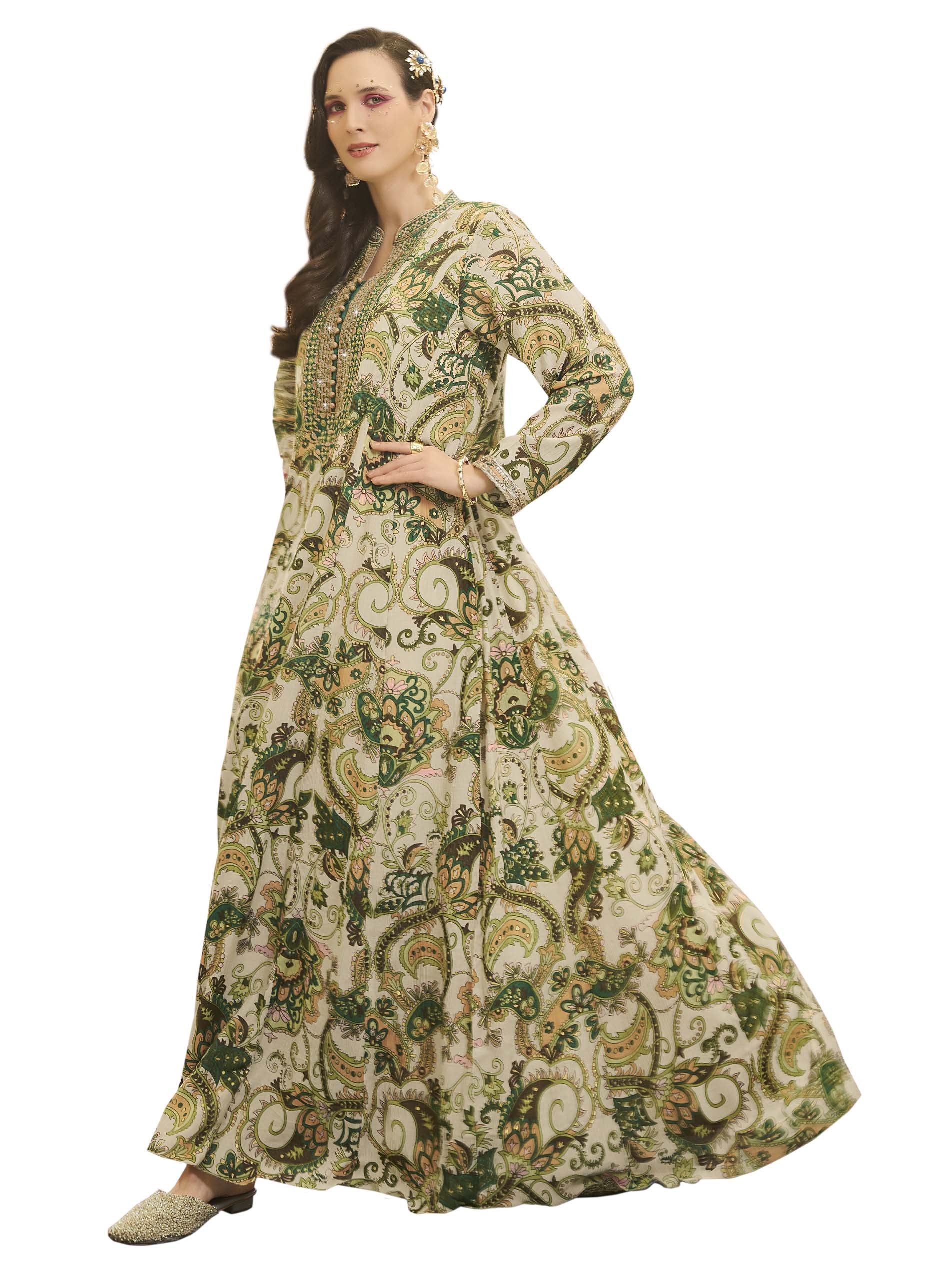 اذا كنتي من محبين التميز، هذه الجلابية المبهجة تعتبر الاختيار الأمثل لك، فهي مصممة من القطن بنقوشات ملونة وفريدة من نوعها، يضفي عليها اللون الزيتي لاطلالة فريدة من نوعها في رمضان.