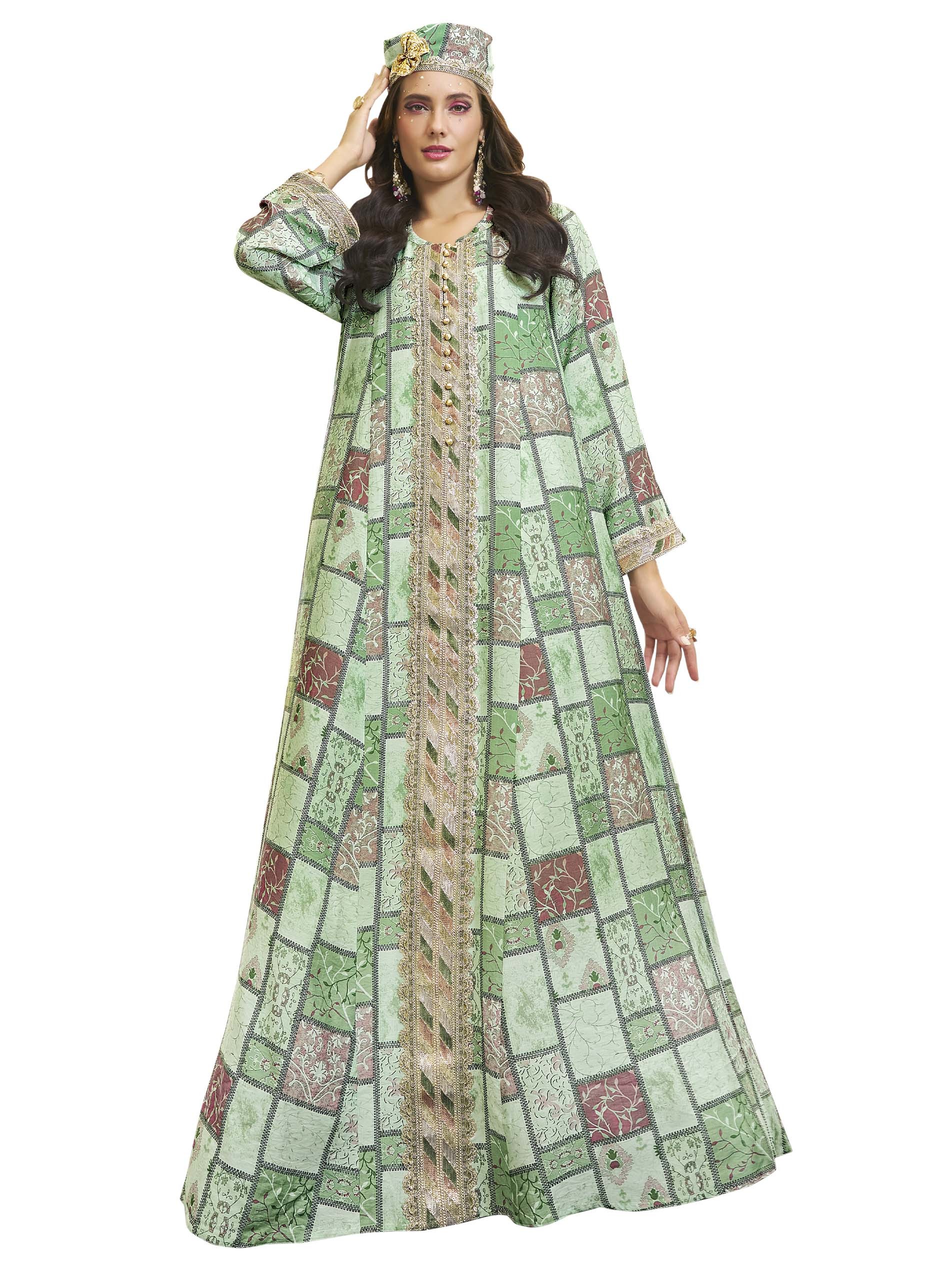 تألقي في جلابية قطنية بنقشة مربعات، مصممة باللونين الأخضر والزهري مع أكمام طويلة وأزرار أمامية على الصدر.