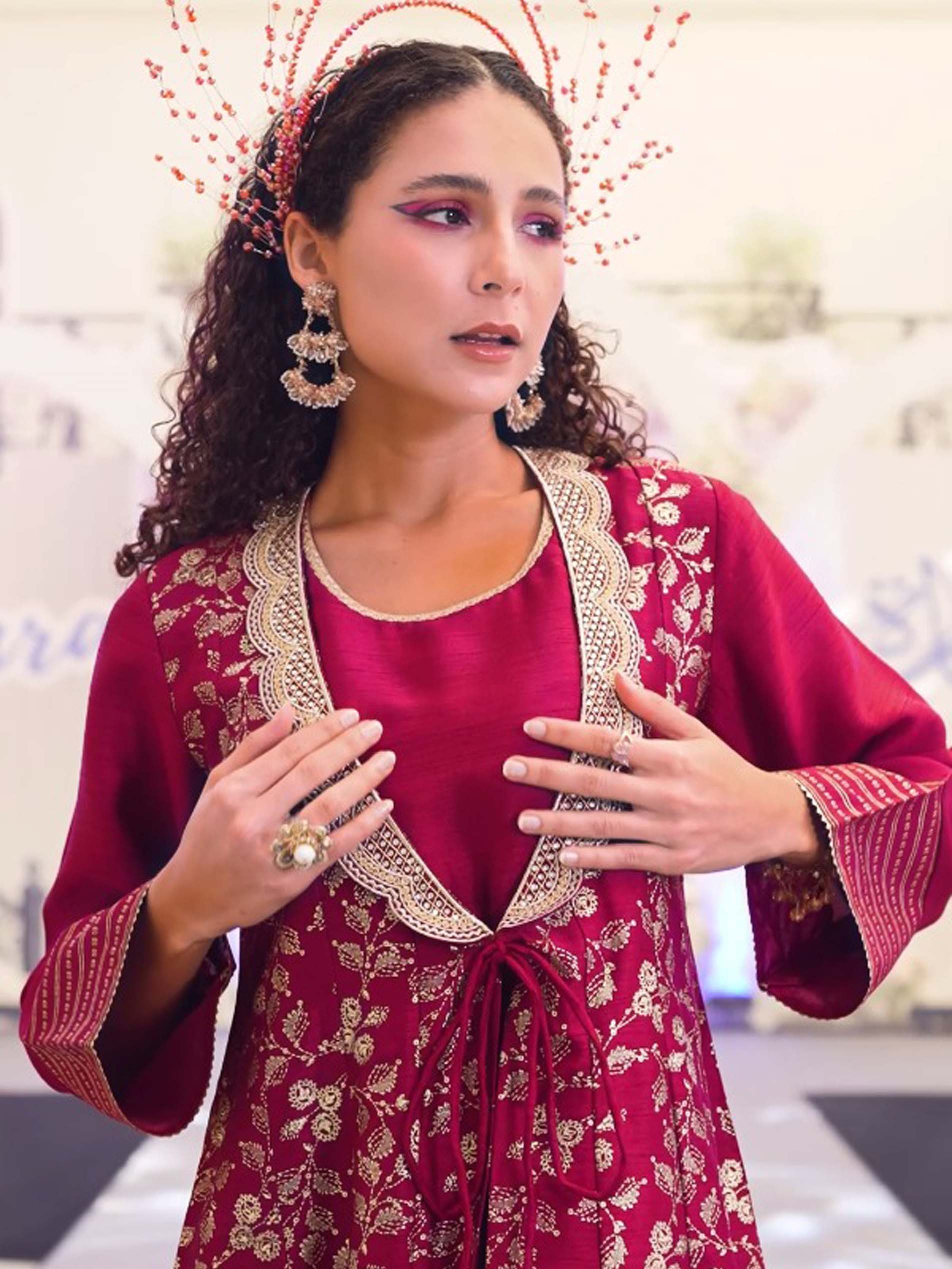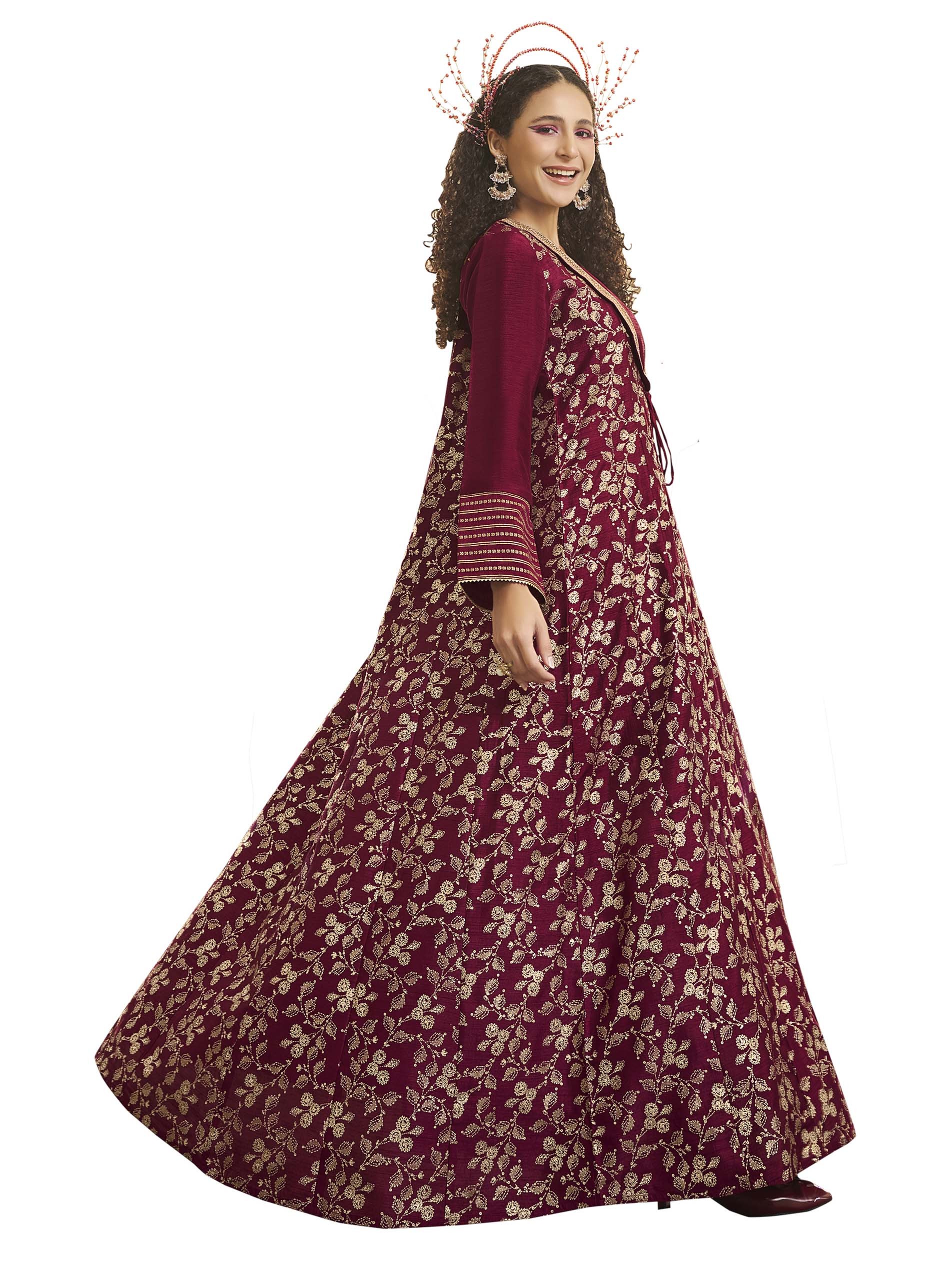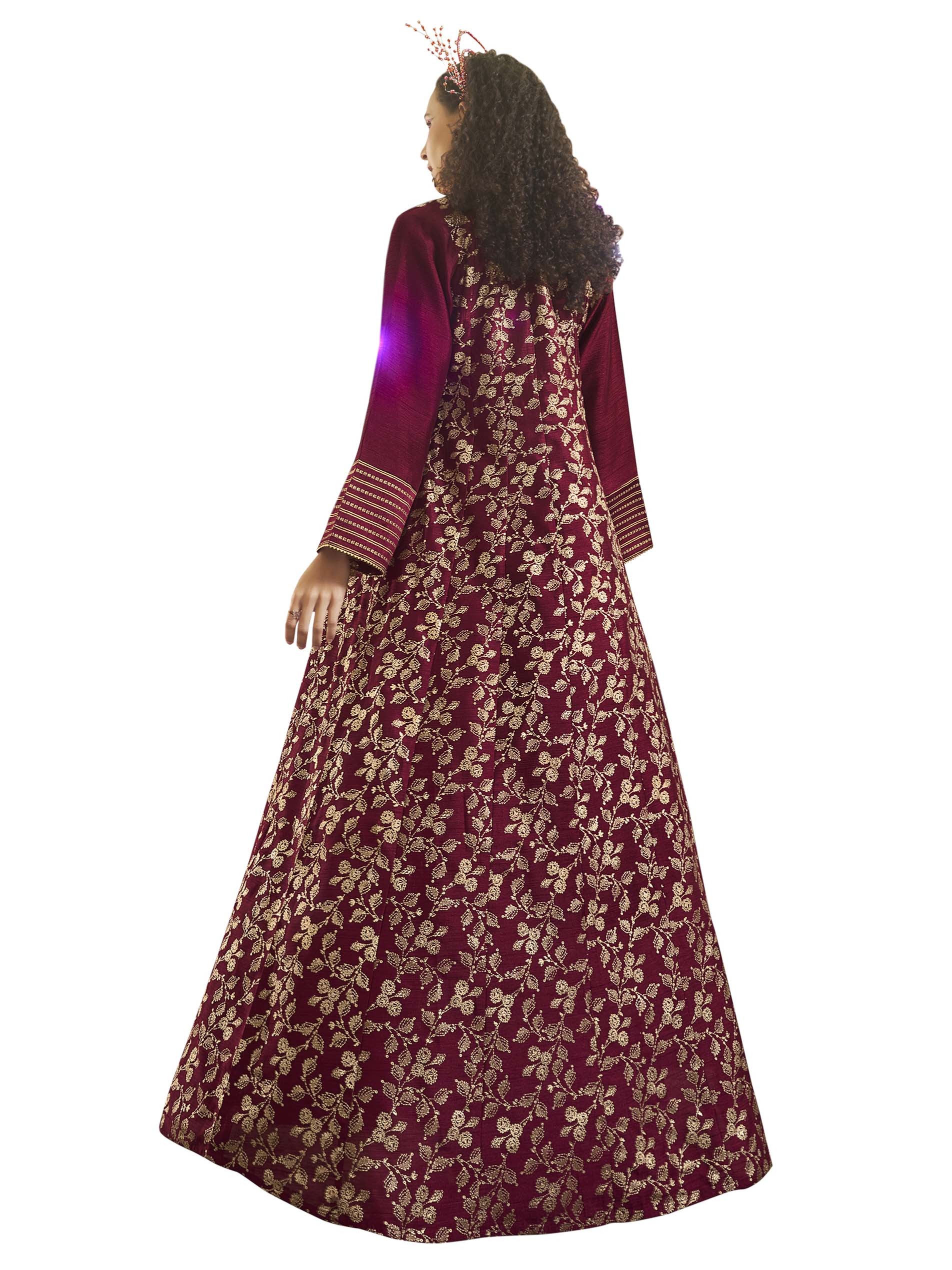 جلابية ماكسي طويلة باللون النبيتي ذات تصميم عصري، مصممة من خامة الساتان و مزودة بنقشة الزهور البيضاء مع أكمام طويلة وفتحة رقبة مميزة.