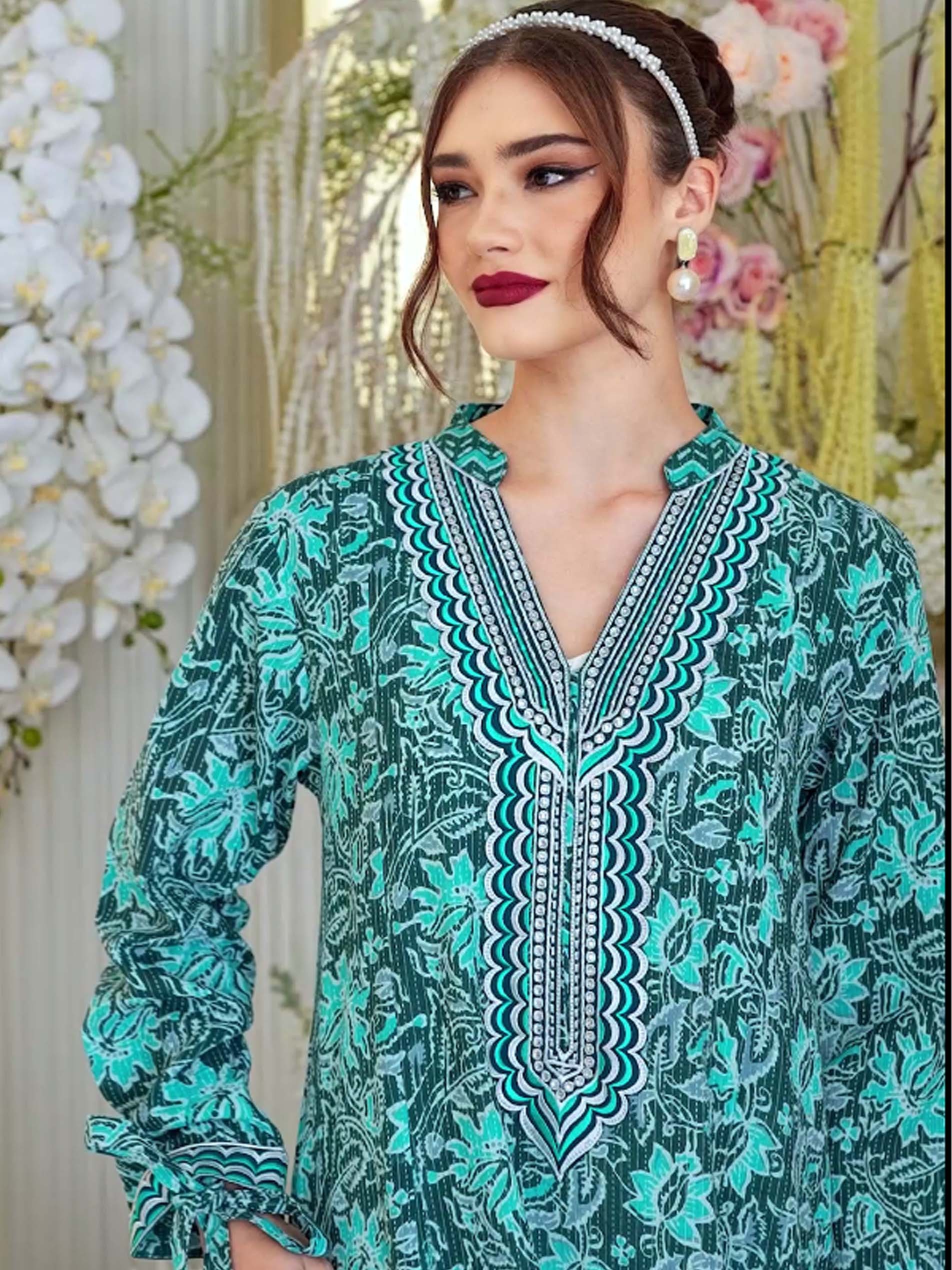 جلابية ماكسي طويلة من القطن، مصممة باللونين الأزرق والكحلي مع نقشة الزهور وتطريز على الصدر مرصع بالكريستال لاطلالة فريدة من نوعها في المناسبات.
