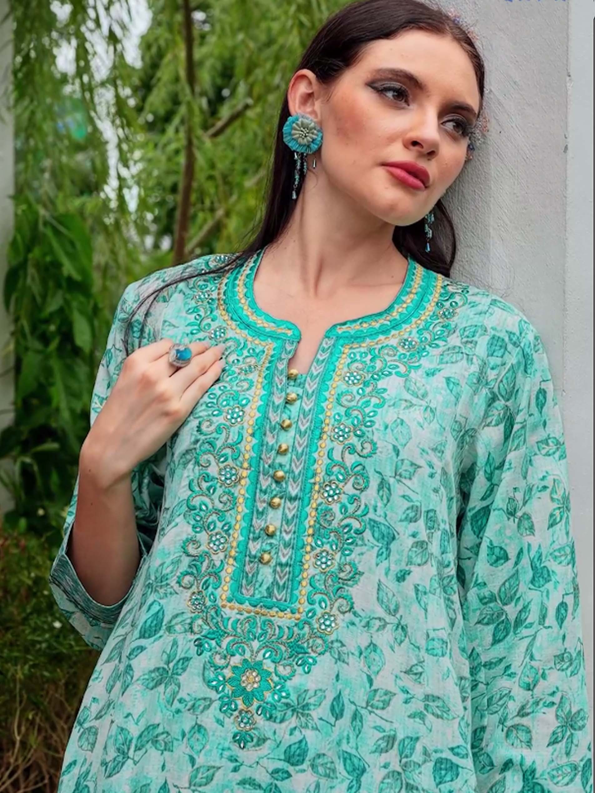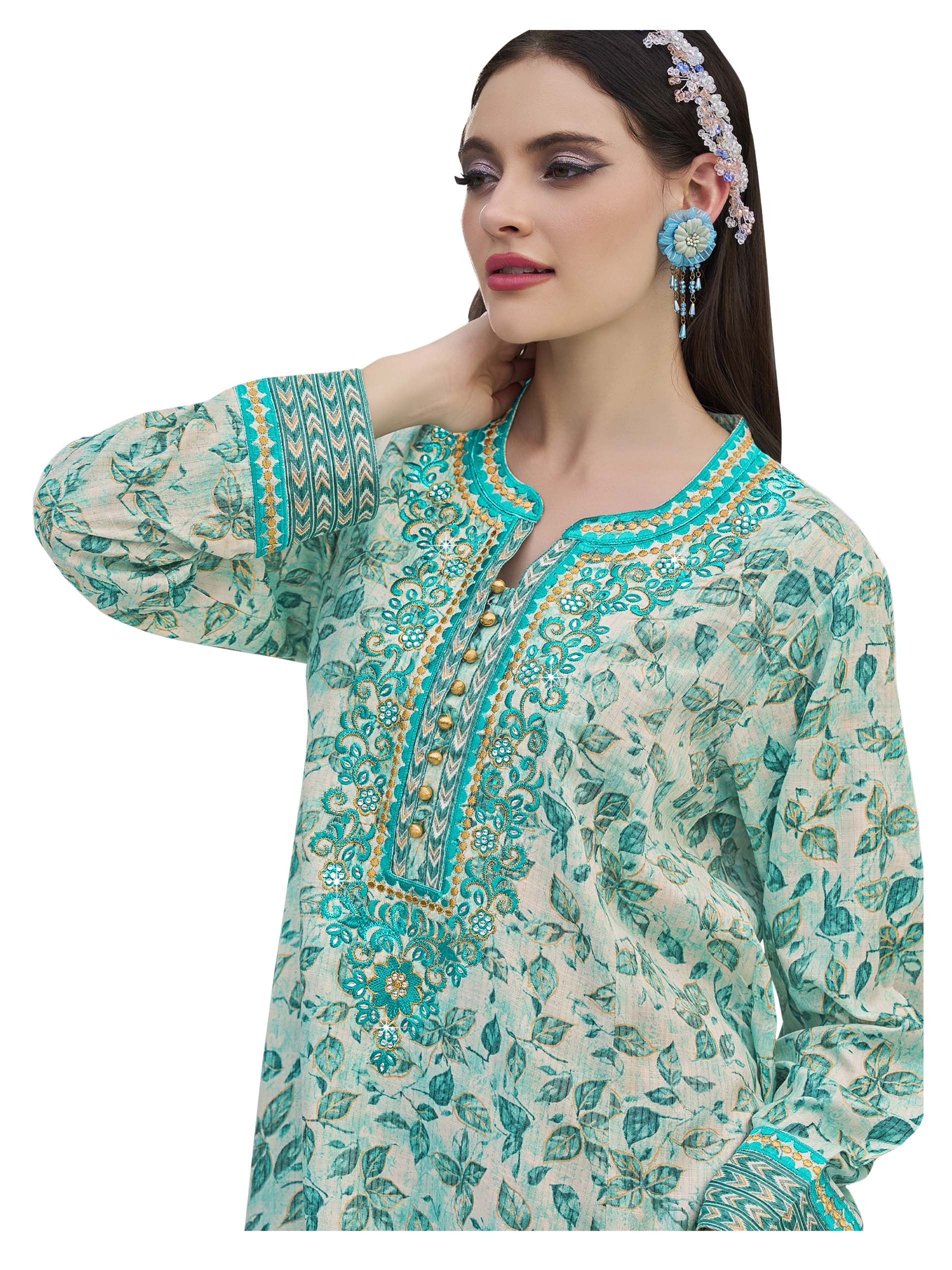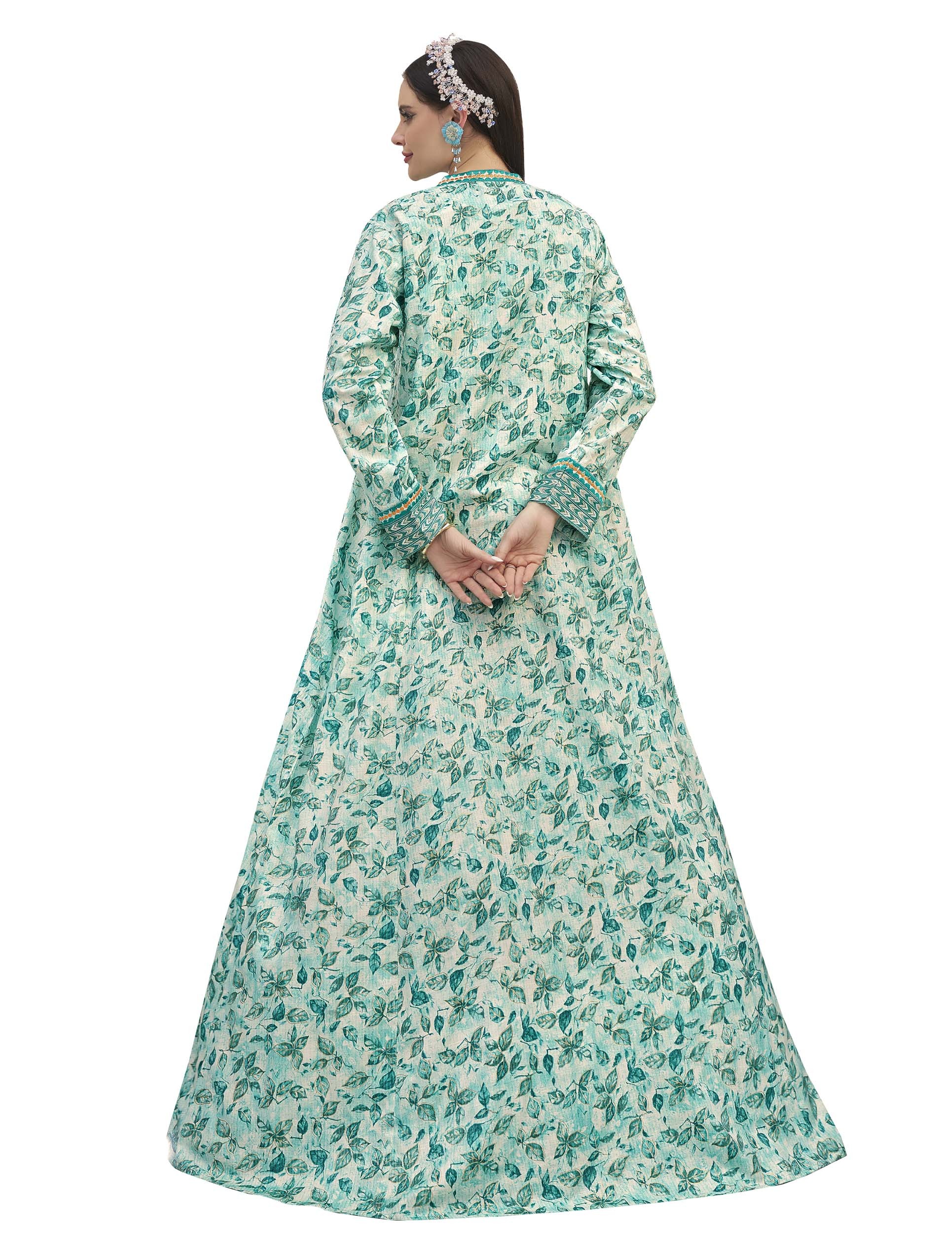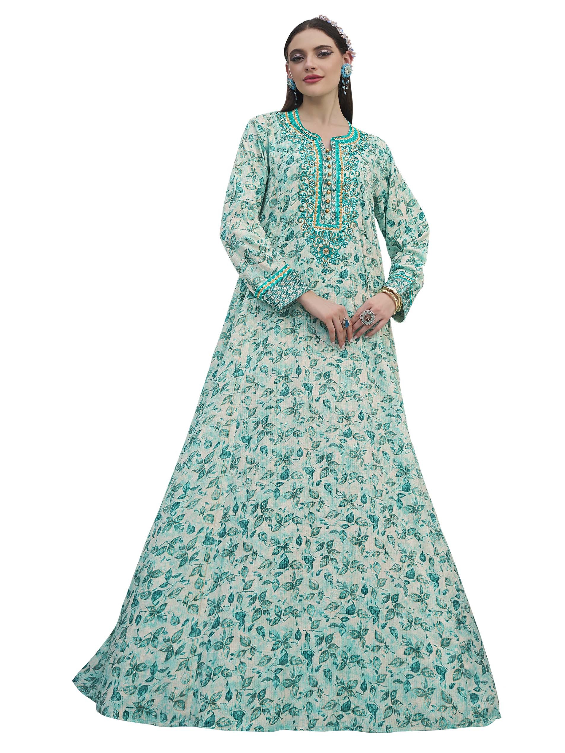 الأزرق يليق بك! تألقي في جلابية من القطن مصممة بطبعة الزهور الزرقاء مع أكمام طويلة وتطريز على الصدر مع أزرار أمامية.