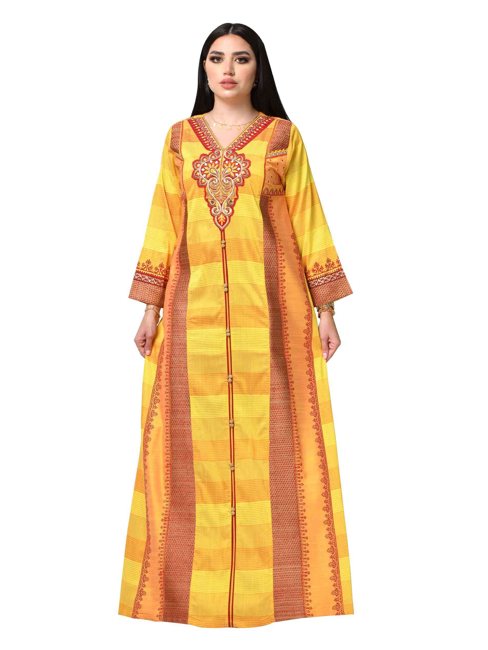 Yellow is the colour of happiness, and yellow in multiple prints is a reminder of the various joys life brings in the form of different colours of blessings and bounties. Look graceful and prosperous in a full length yellow jalabiya tailored in PST fabric lending it a fascinating fall. The V neck and full sleeves compliment the A-line hemline making it a stunning piece of casual wear.