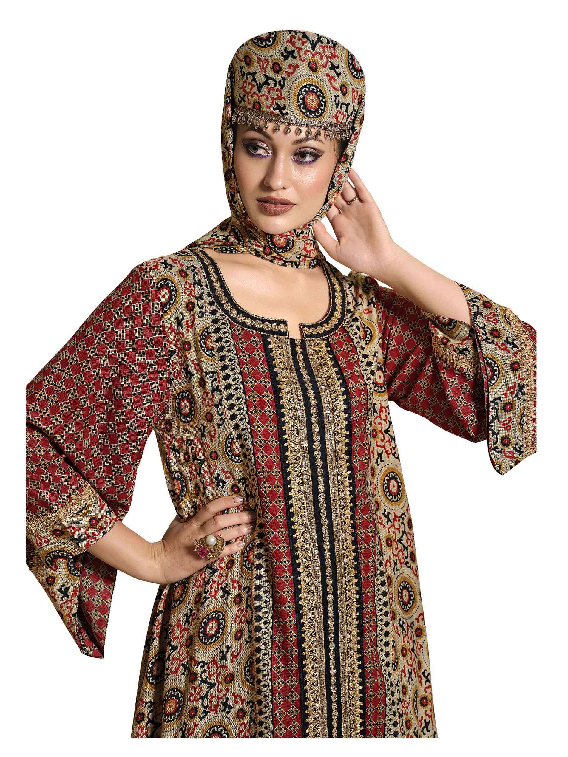 Inspired by ancient stories and symbols this full length earthy jalabiya shall take you back in time with its brown colour and aboriginal print. Yet, it is stunningly modern in its styling defined by 3/4th sleeves, A line cut and notch neck. Look rustic, look beautiful, look with the times, yet charmingly grounded.