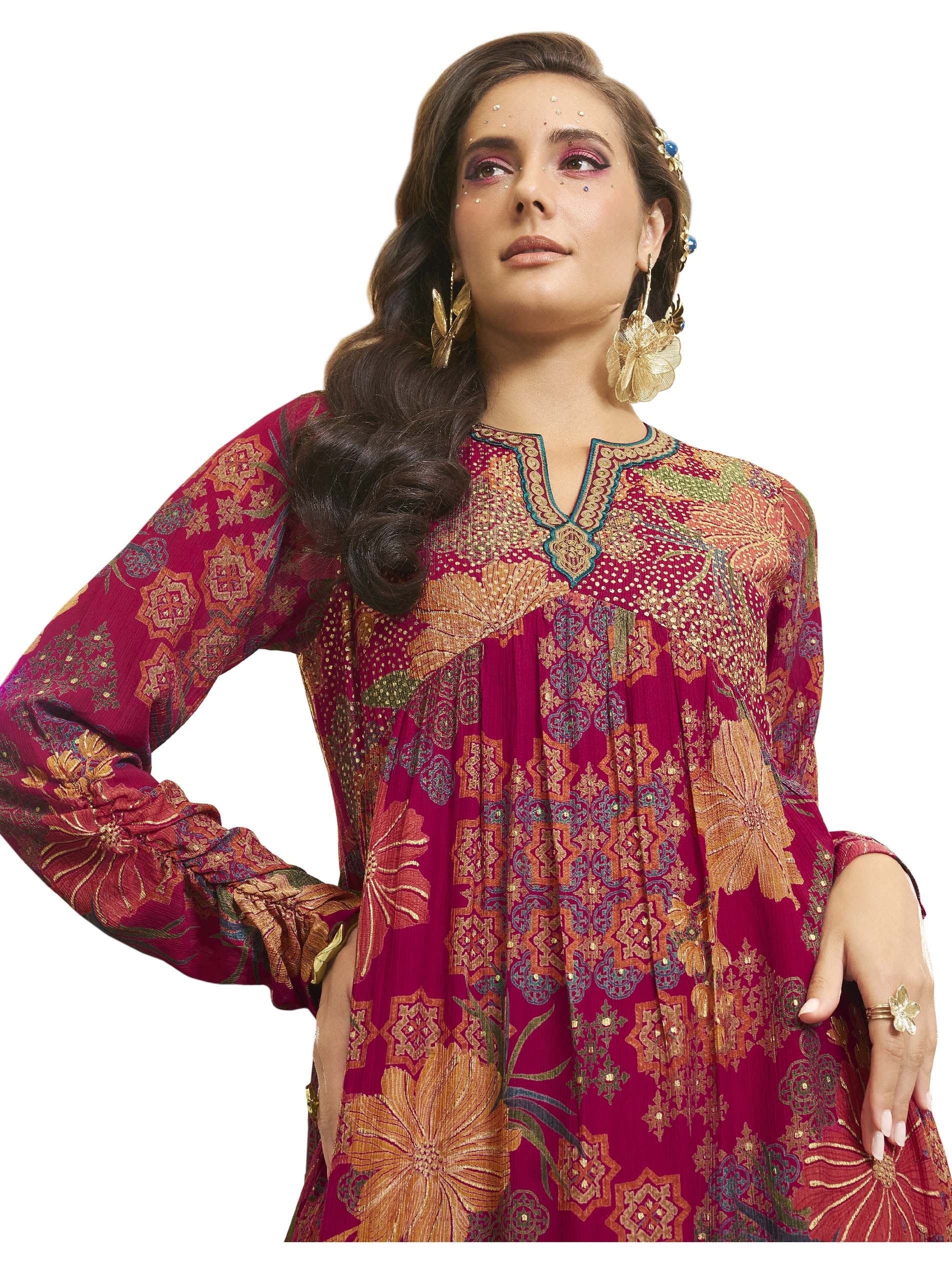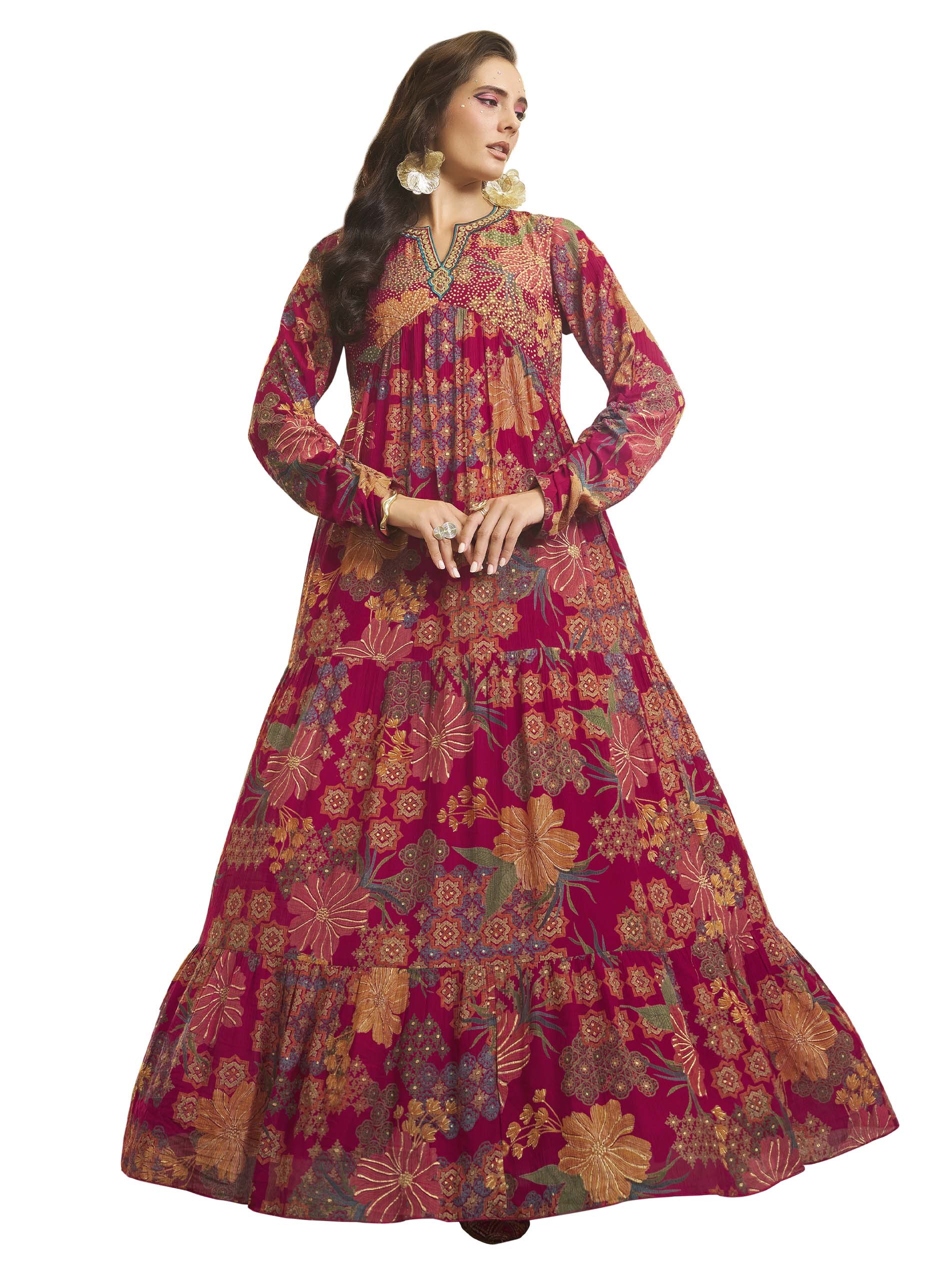 Long sleeve pink crepe jalabiya, designed with colorful floral pattern for a delightful ramadan look.