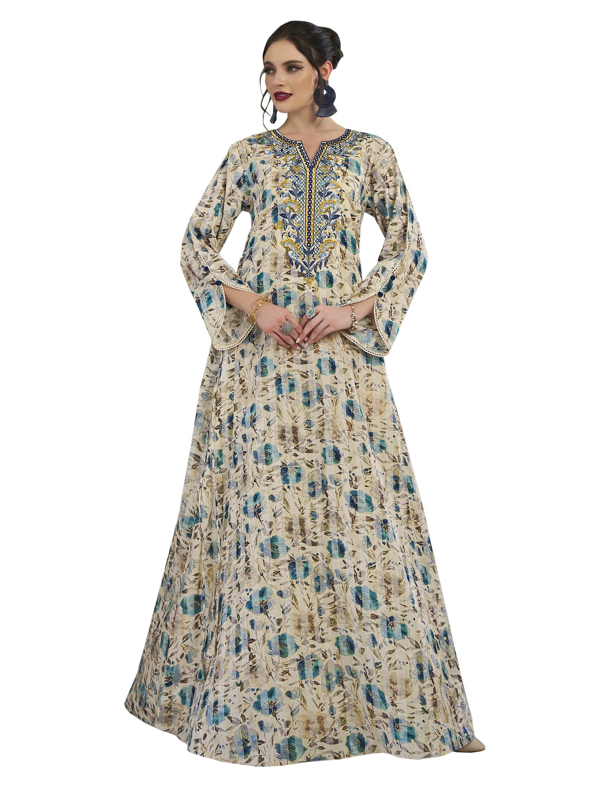 You must add this artistic piece to your wardrobe to highlight your feminity! This long sleeve gray and blue floral cotton jalabiya is desgined with blue and gold artwork on the chest for a unique look in occassions.
