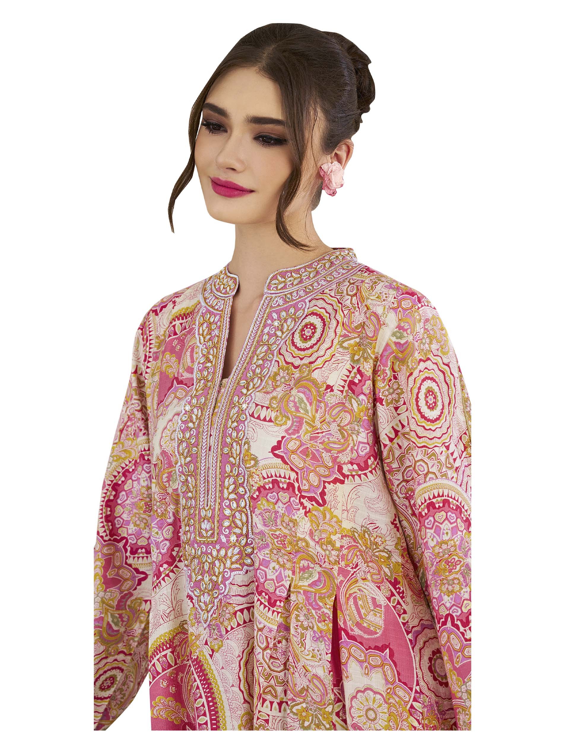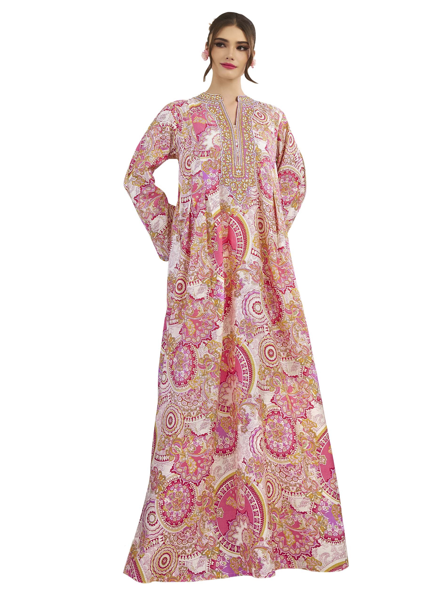 Step into luxury with our long sleeve maxi jalabiya that comes in white and pink colors, featuring intricate gold artwork and detailed chest embroidery.