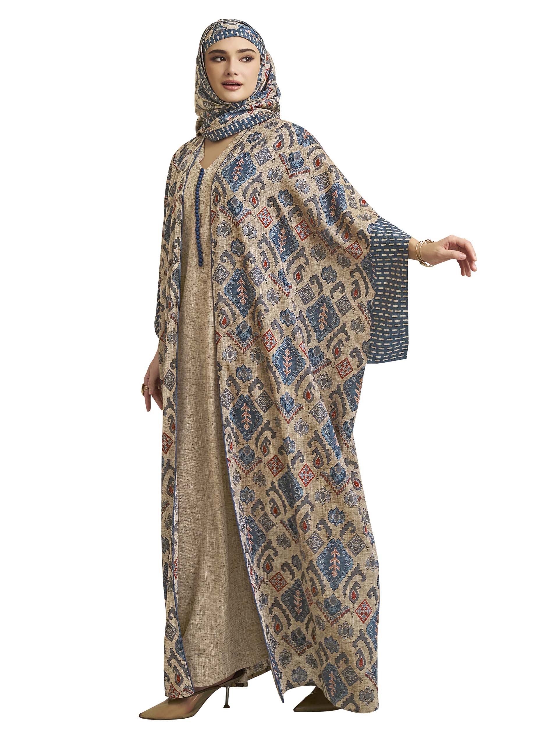 An A-line cotton jalabiya, designed with a plain gray layer and the design is completed with another open layer with multiple patterns and chest blue front buttons.