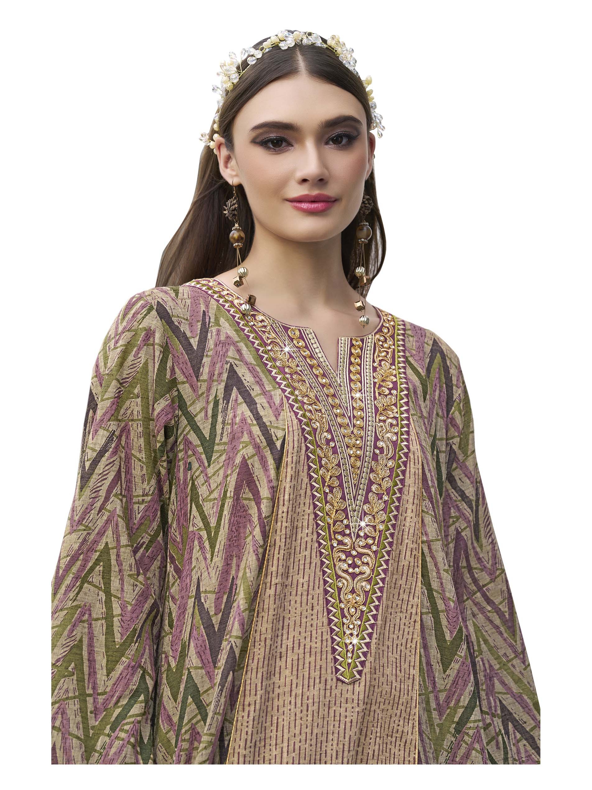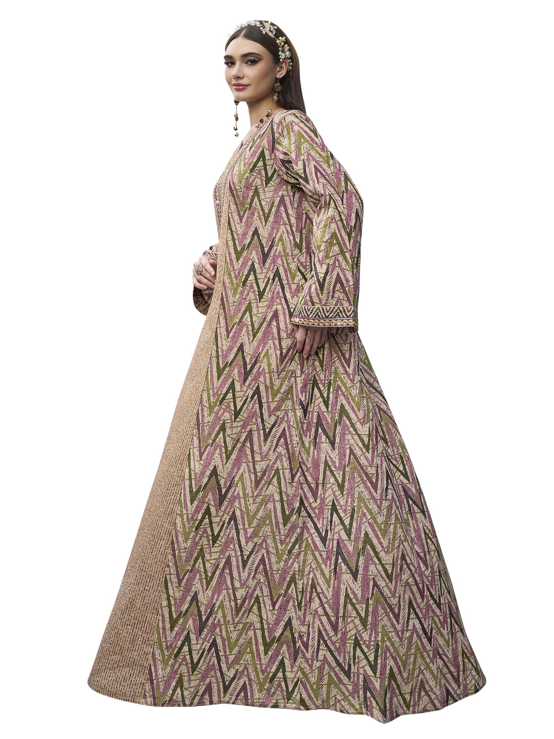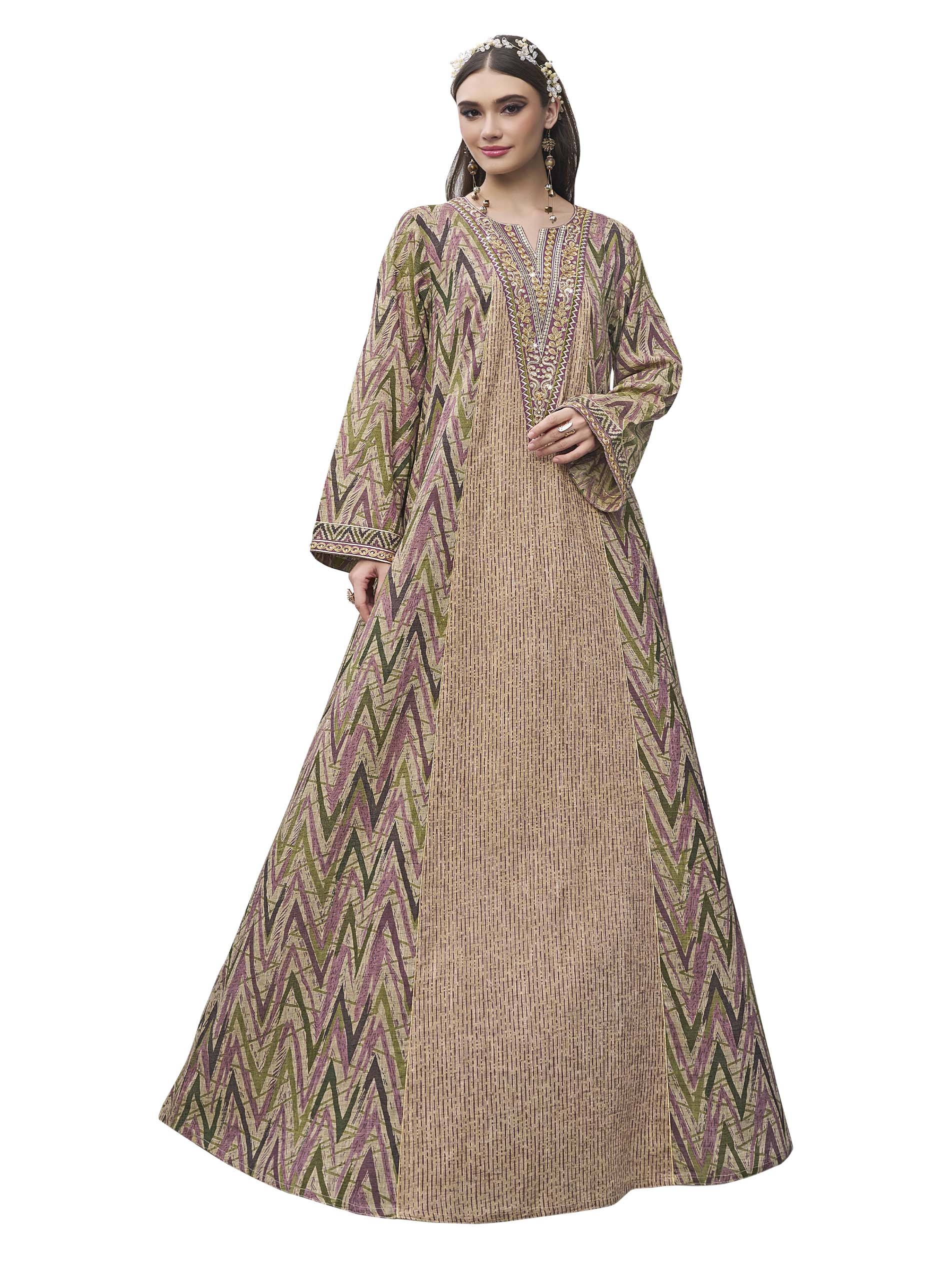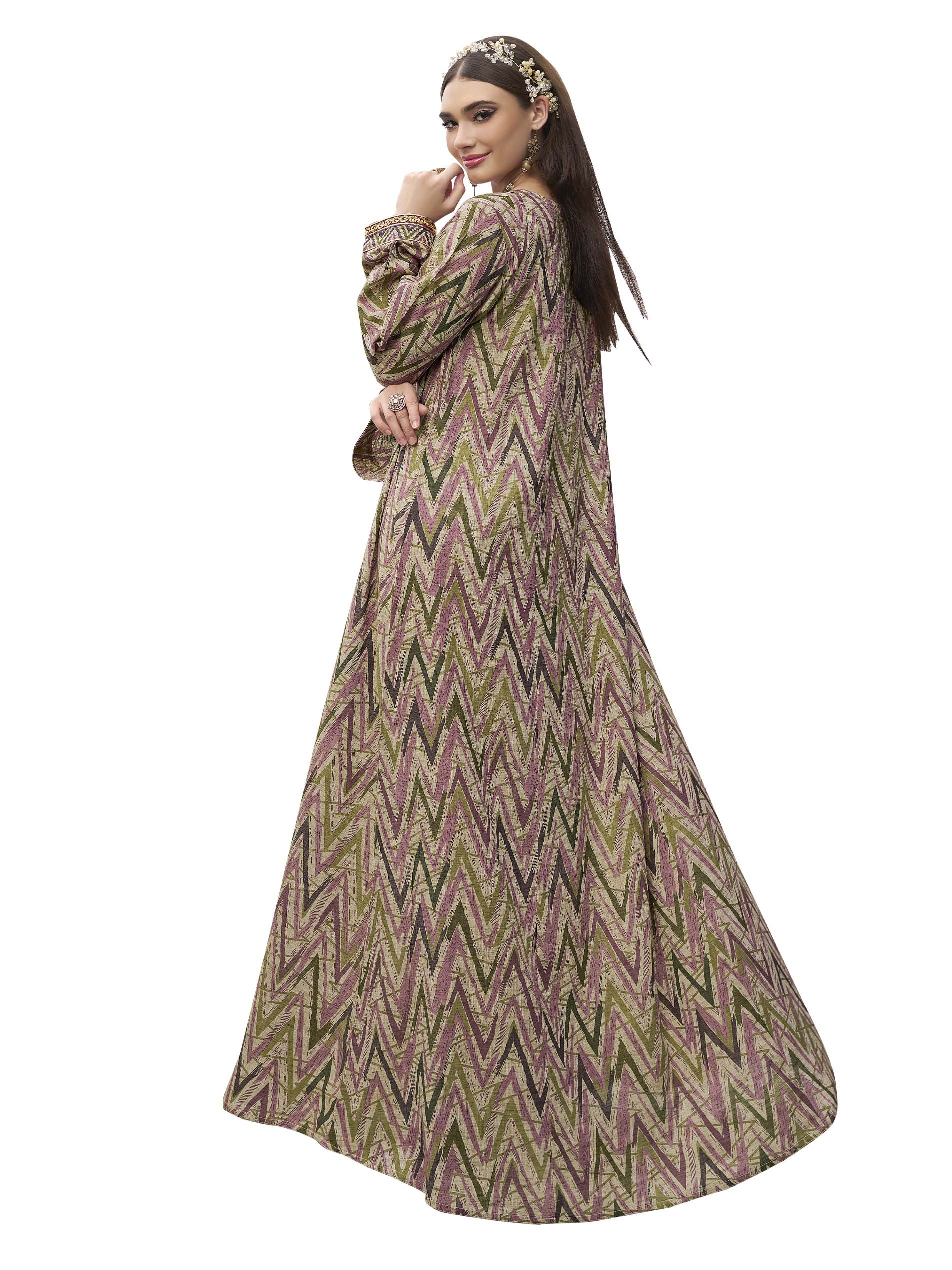 Long sleeve soft cotton jalabiya, designed with an ikat pattern, and crystal-studded embroidery on the chest for a charming look at all occassions.