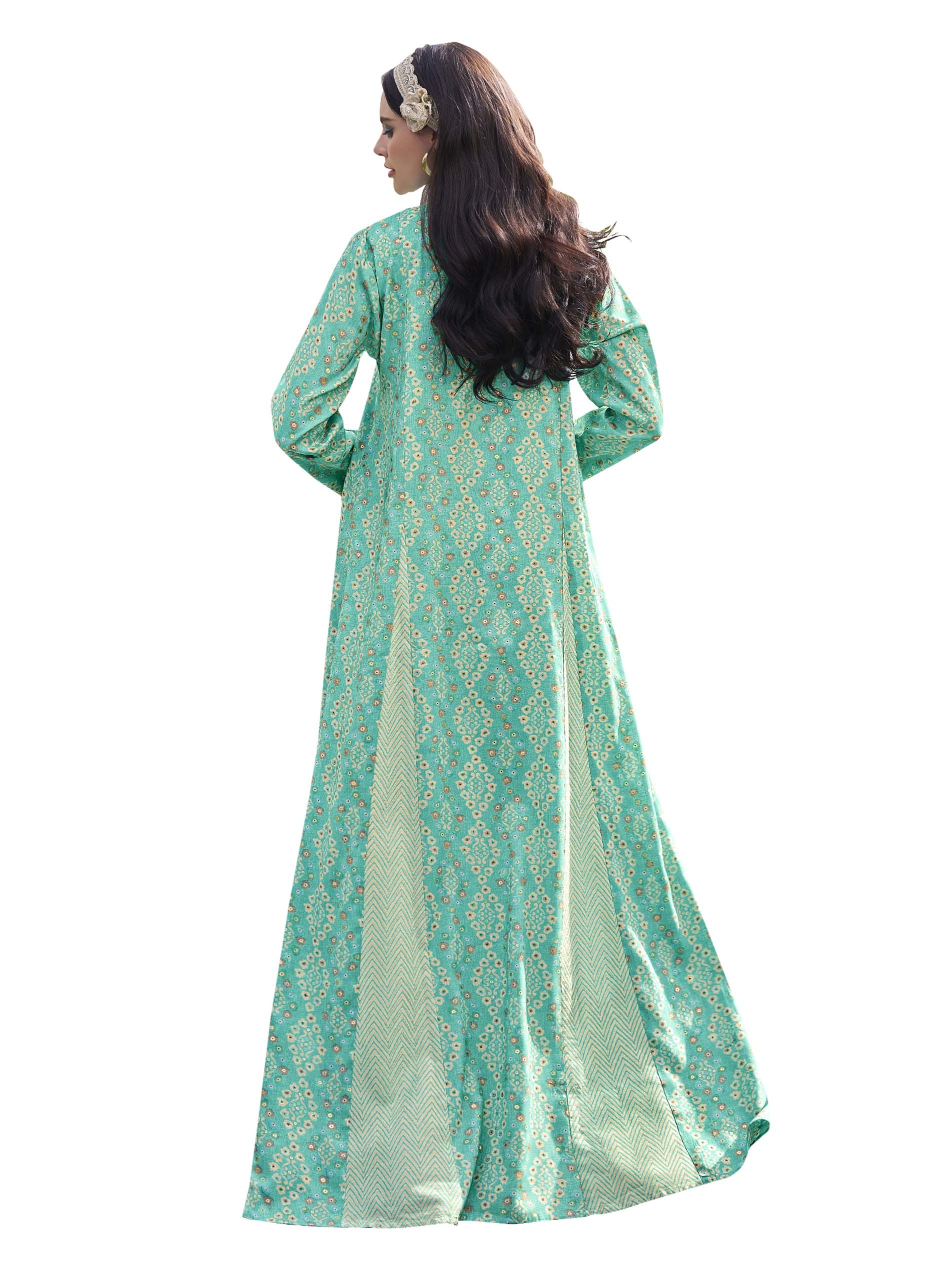 Shine is this sky blue cotton jalabiya, designed with white floral & zigzag pattern, completed with chest gold artwork and front buttons.