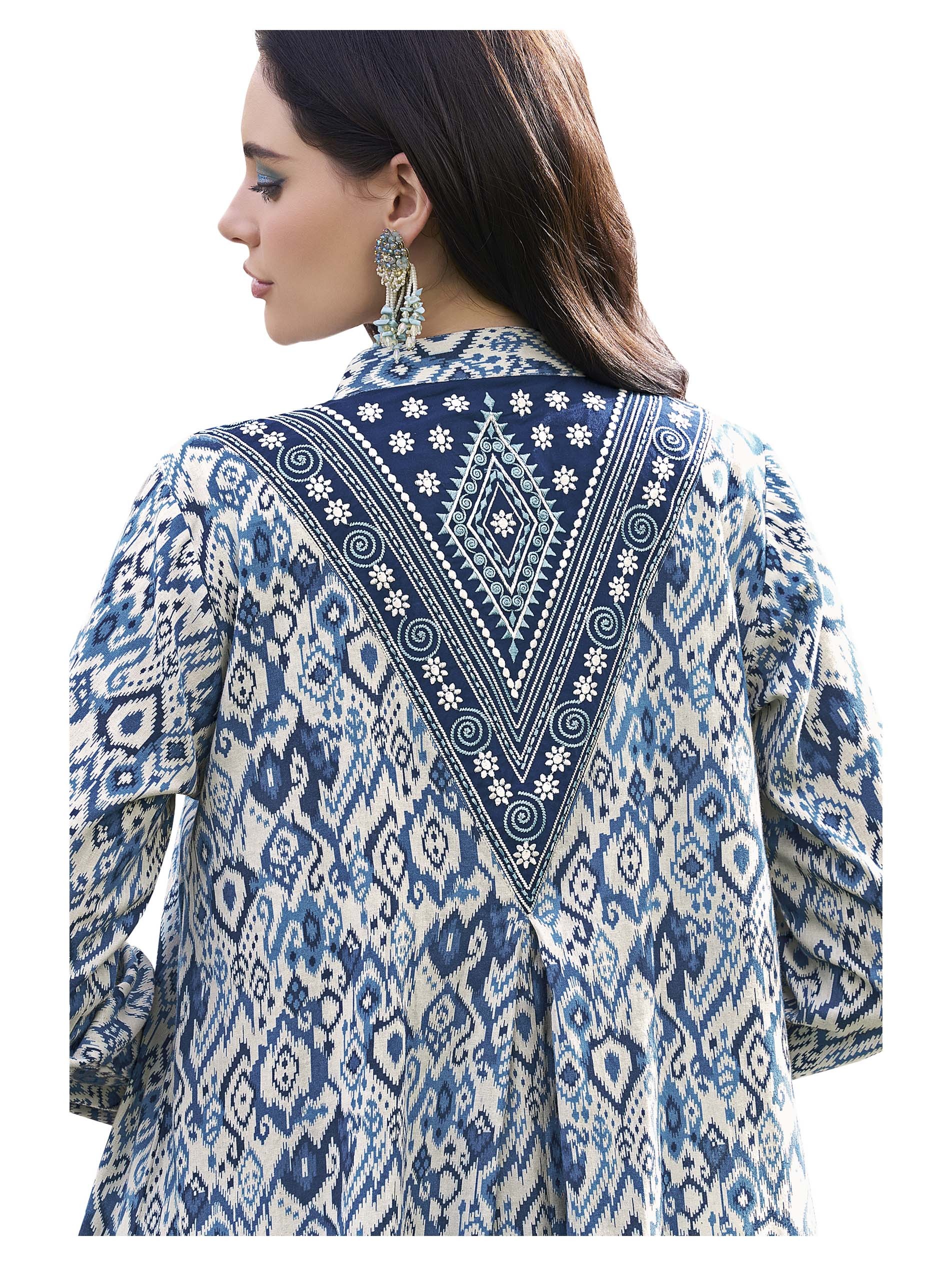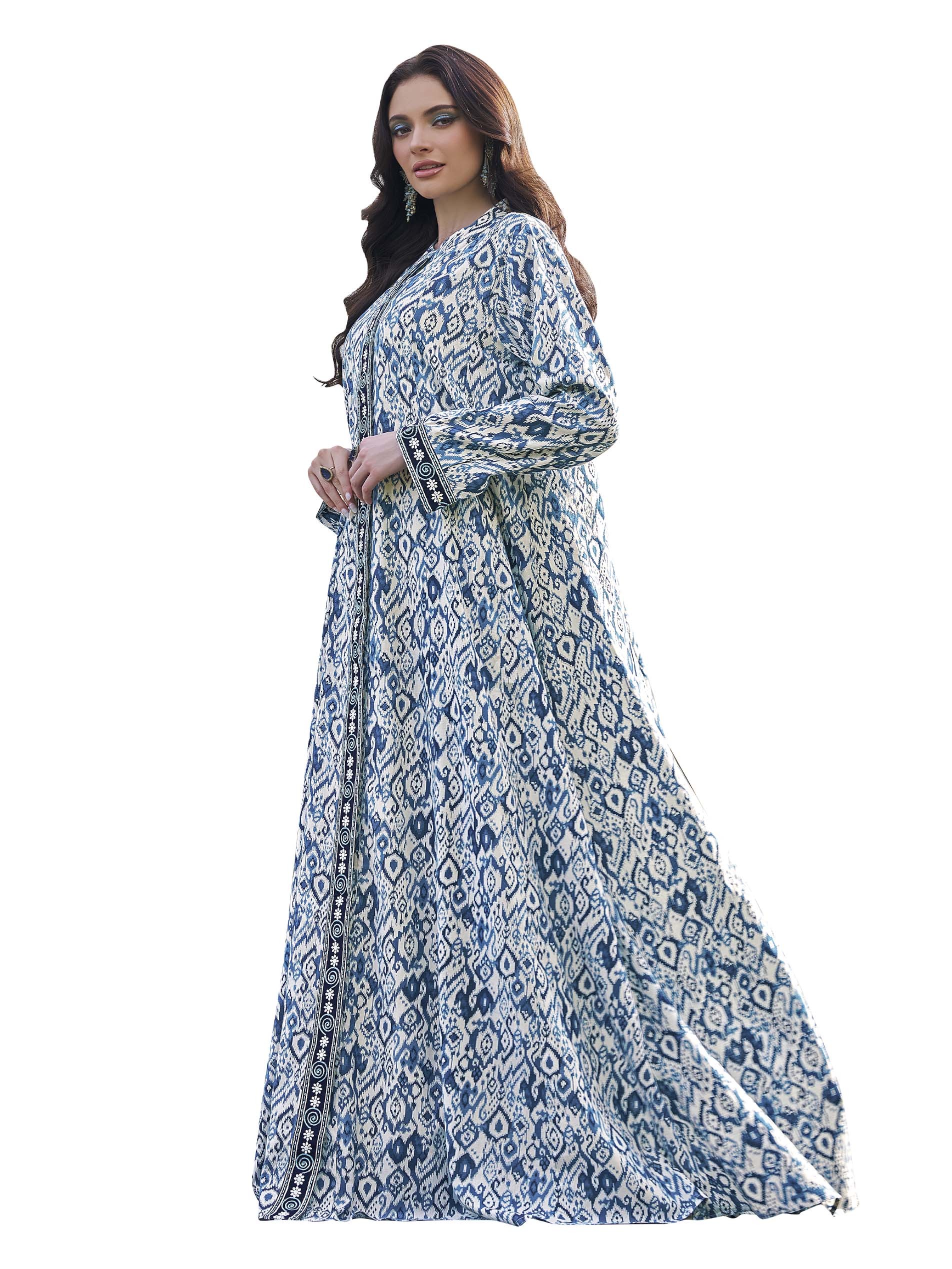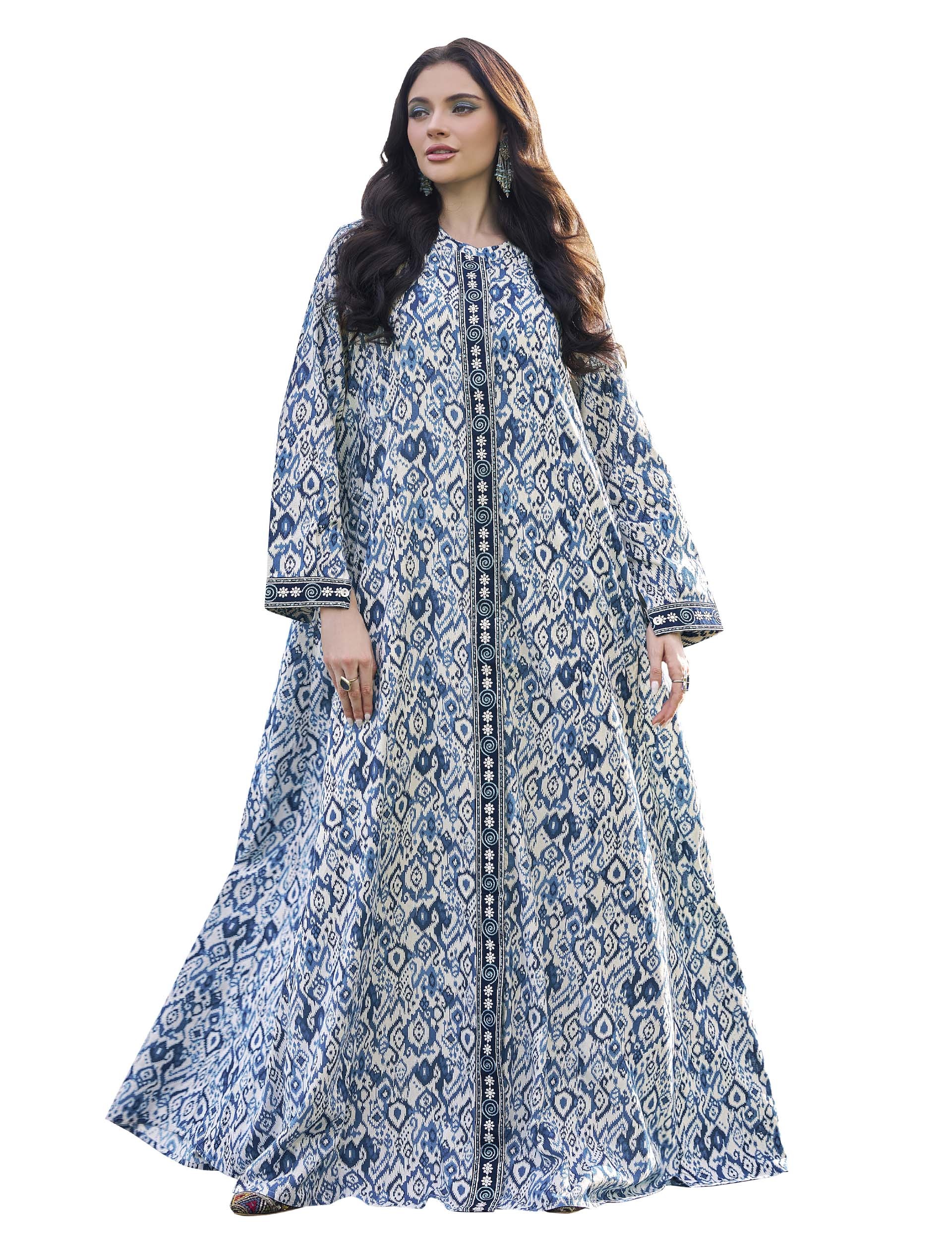 Sara's long sleeve cotton jalabiya with blue and white pattern designs offer you with the feeling of comfort, charm and elegance.