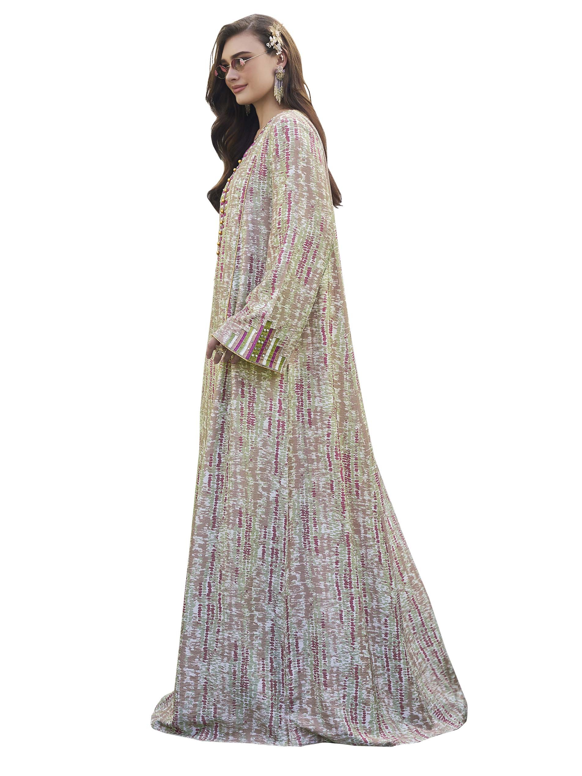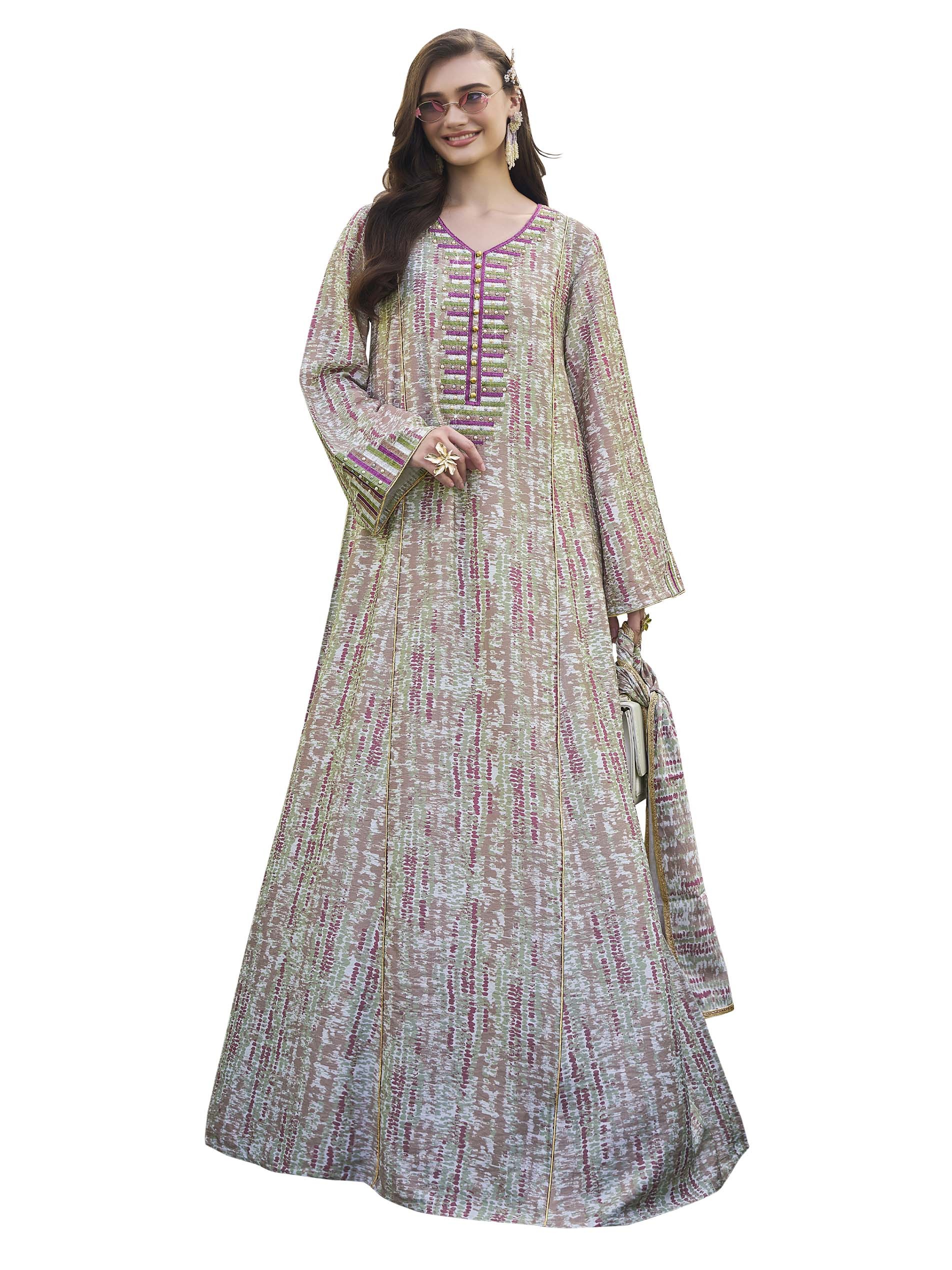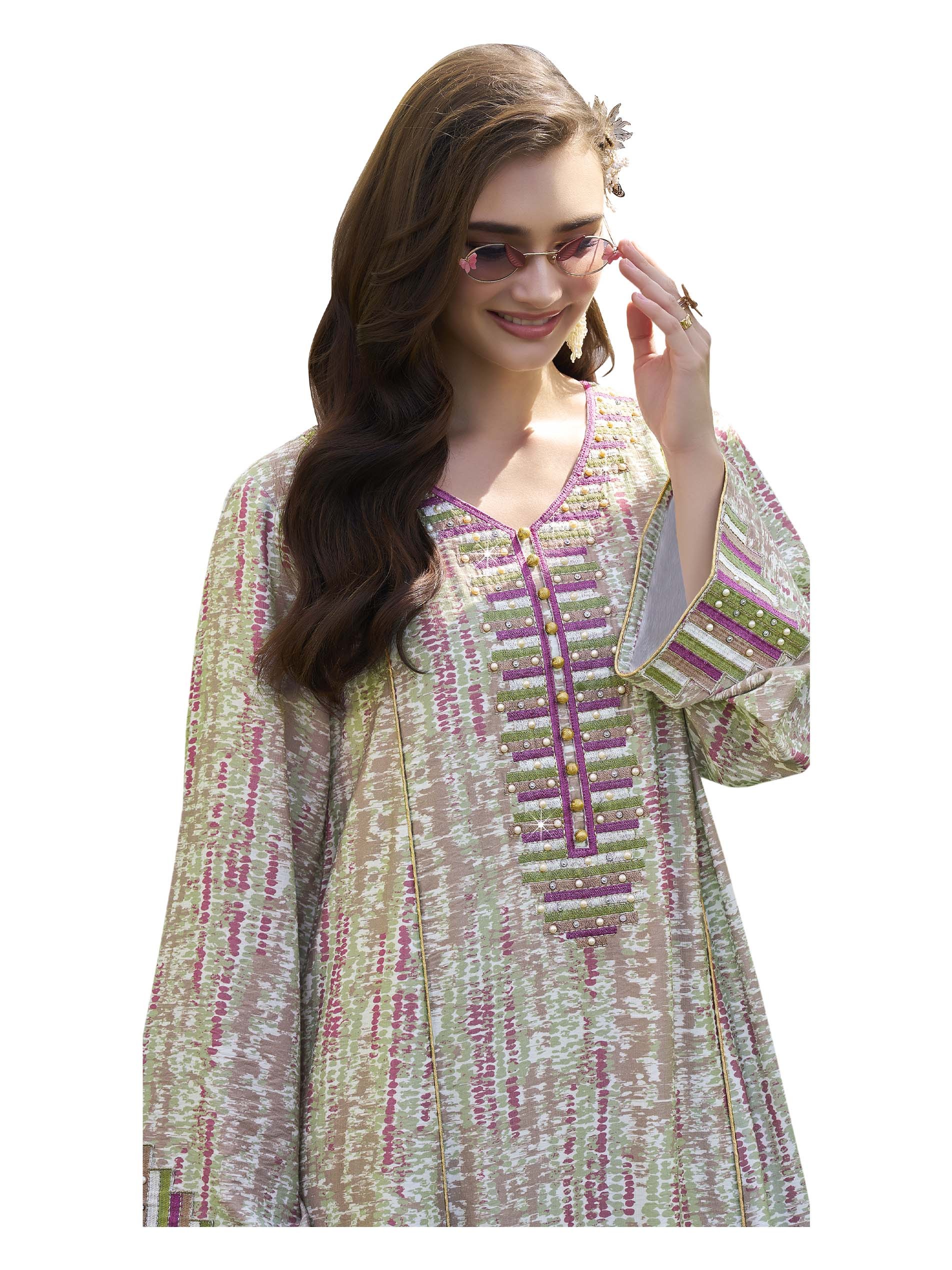 Long sleeve cotton jalabiya, featuring spectacular design and chest emboridery with green and purple color with gold buttons.