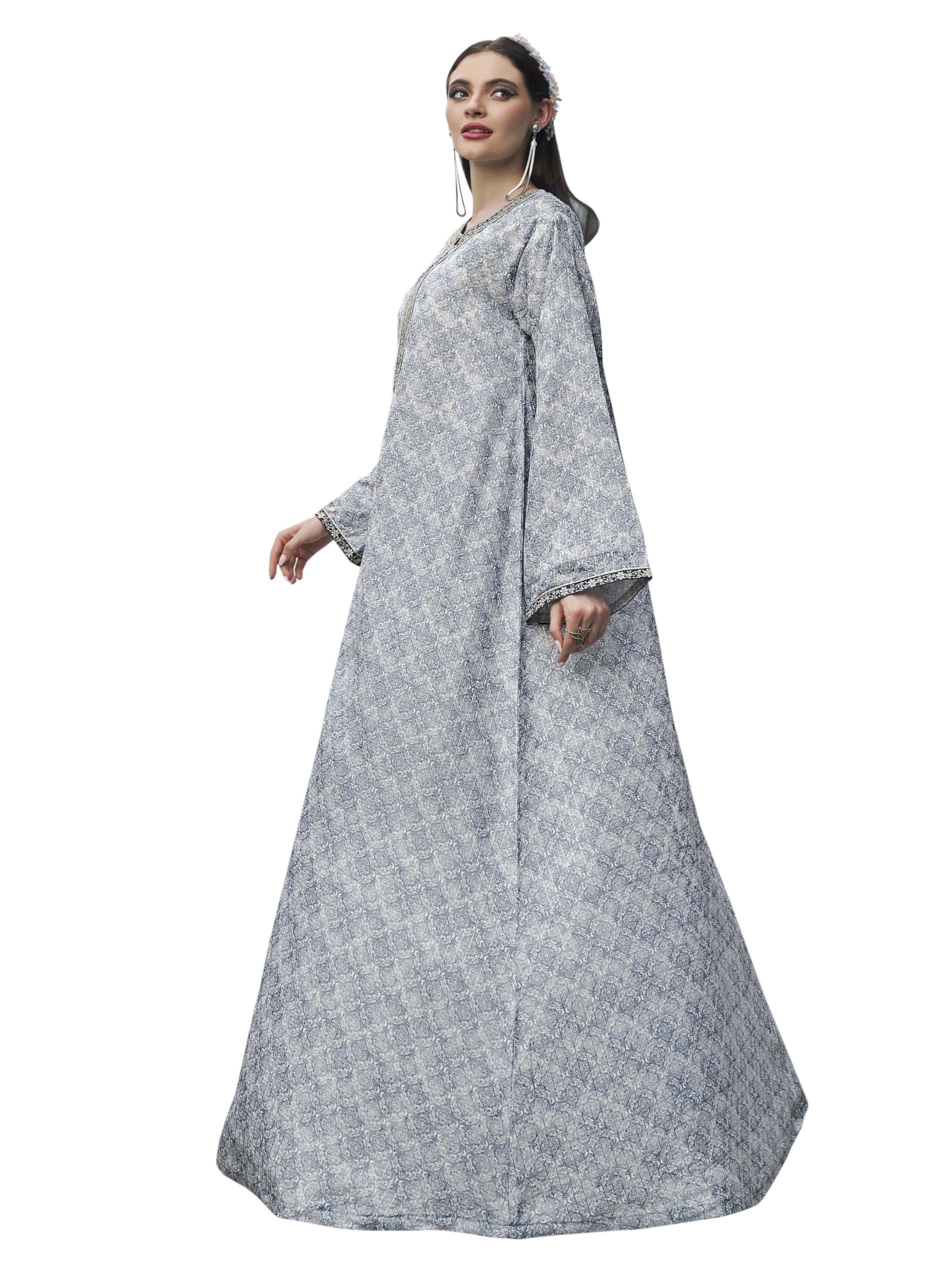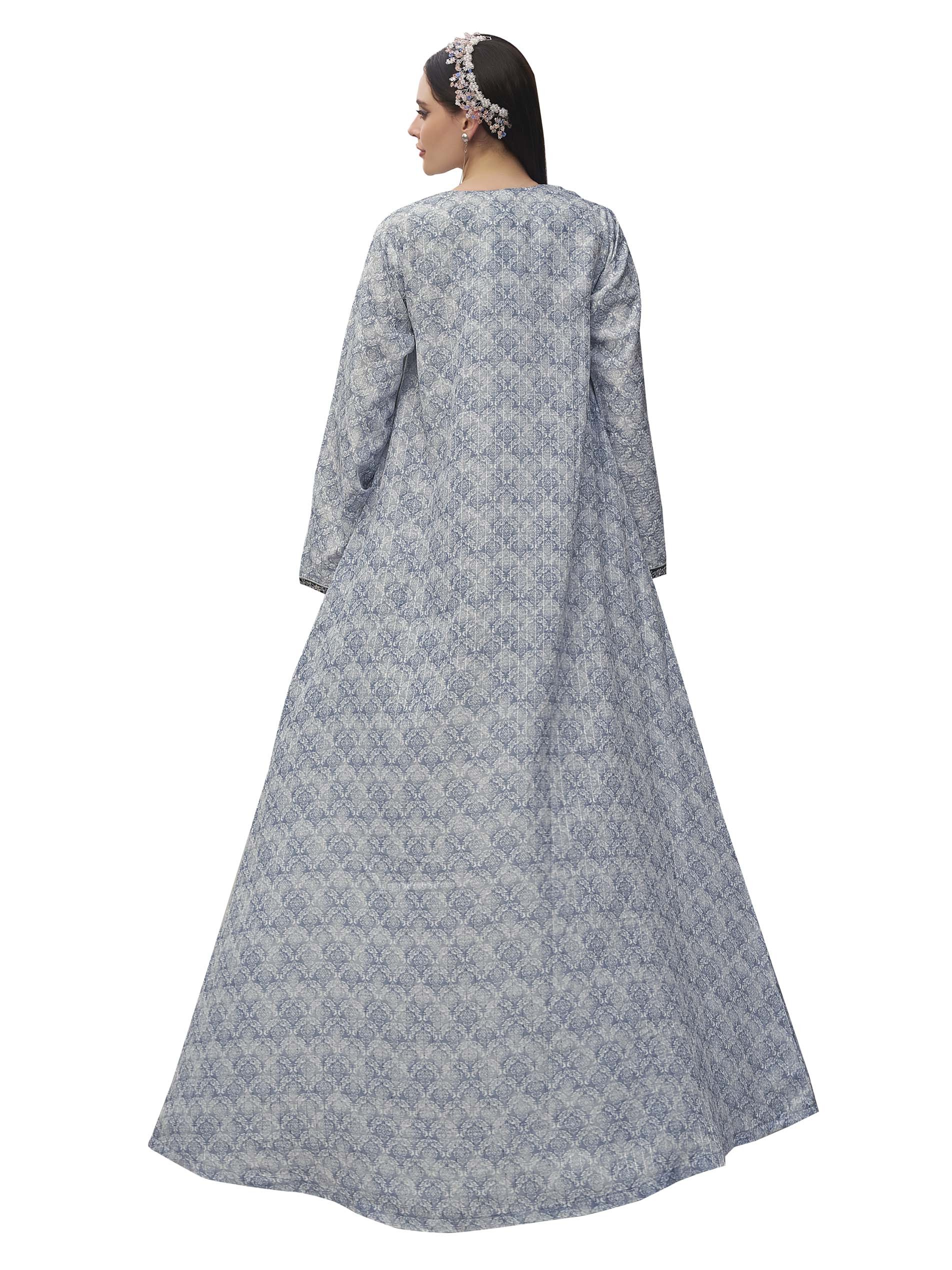 This long sleeve cotton jalabiya is the perfect choice for simplicity lovers, designed with blue and white floral print and spectacular chest embroidery.