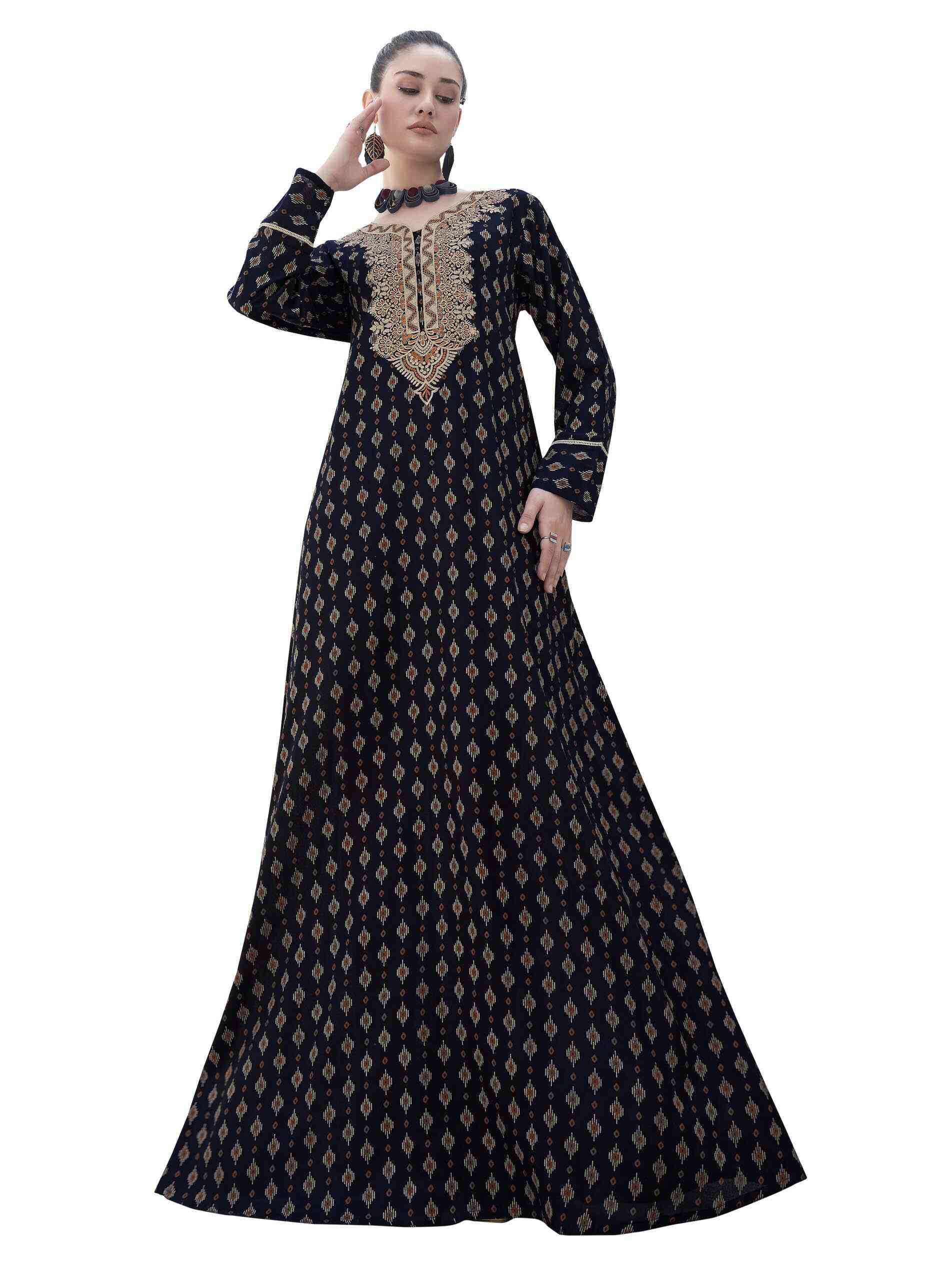 جلابية منقوشة من البوليستر / الرايون / القطن سوداء اللون مع أكمام طويلة وفتحة رقبة على شكل حرف V مصممة من الدانتيل باللون الكريمي ودرجات البني والذهبي لتمنحك الشعور بالراحة في فصل الصيف.