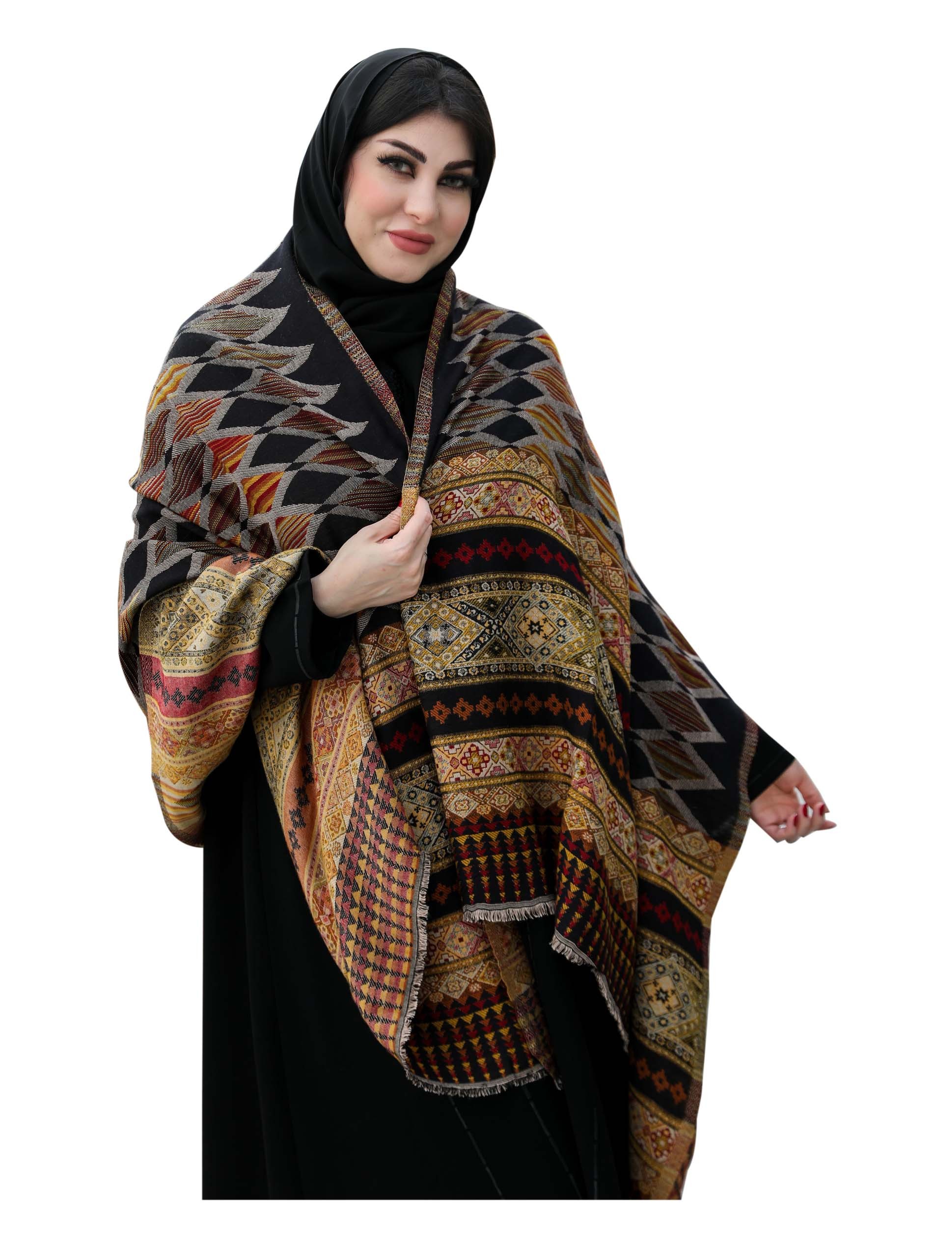 شال كشميري بطبعات متنوعة وألوان تتنوع بين الأسود والرمادي والأصفر والأحمر مع لمسة من اللون البرتقالي.