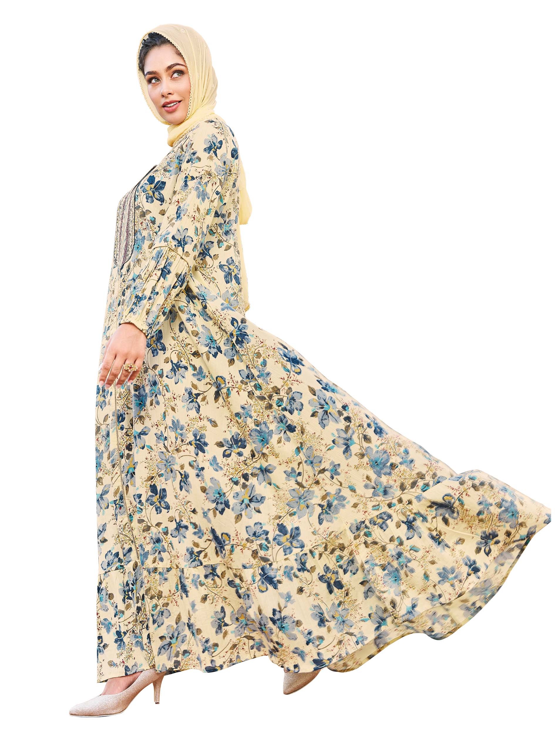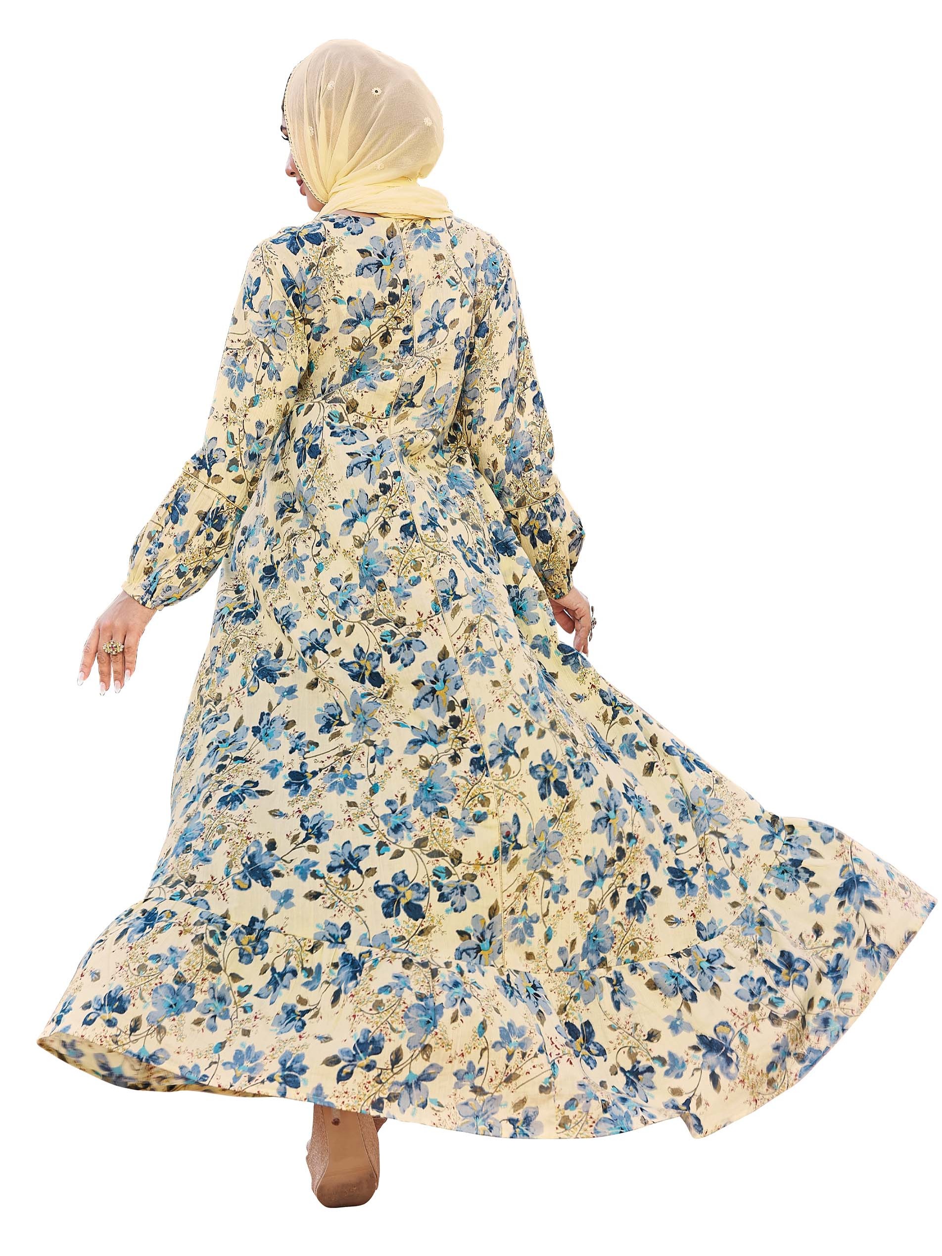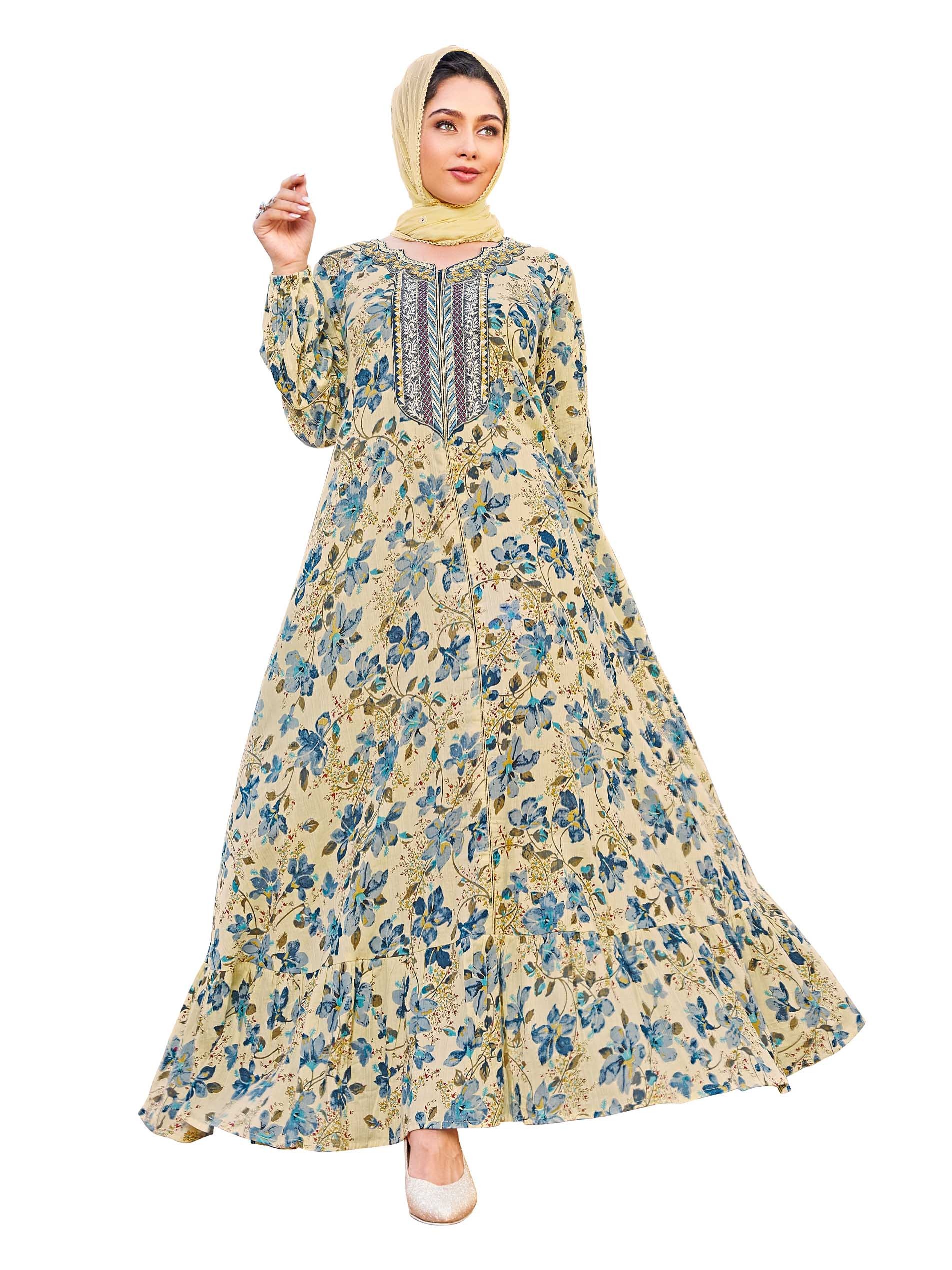 جلابية طويلة وواسعة صفراء اللون مصممة بطبعة الأزهار الزرقاء ويتخخلها طبعة أوراق شجر باللون الأصفر. ويكتمل التصميم بطريز مميز على الصدر باللون الأبيض والأزرق والنبيتي والأصفر.