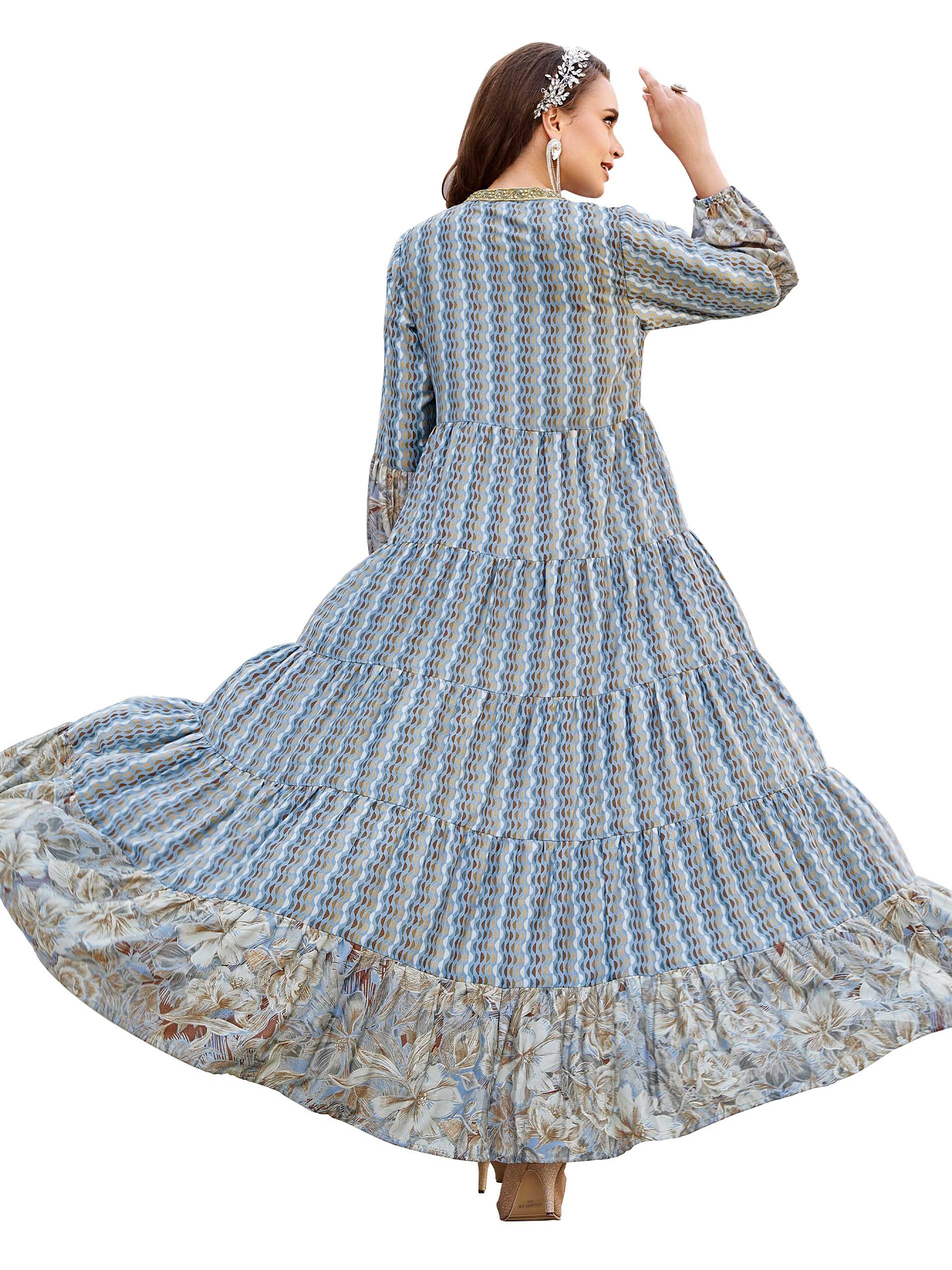 جلابية باللون الأزرق السماوي مصممة بخطوط متعرجة مع أكمام طويلة وفتحة رقبة على شكل حرف V مطرزة باللون الذهبي. ويكتمل التصميم بأطراف من نقشة الزهور لتتألقي بثقة في مناسباتك.