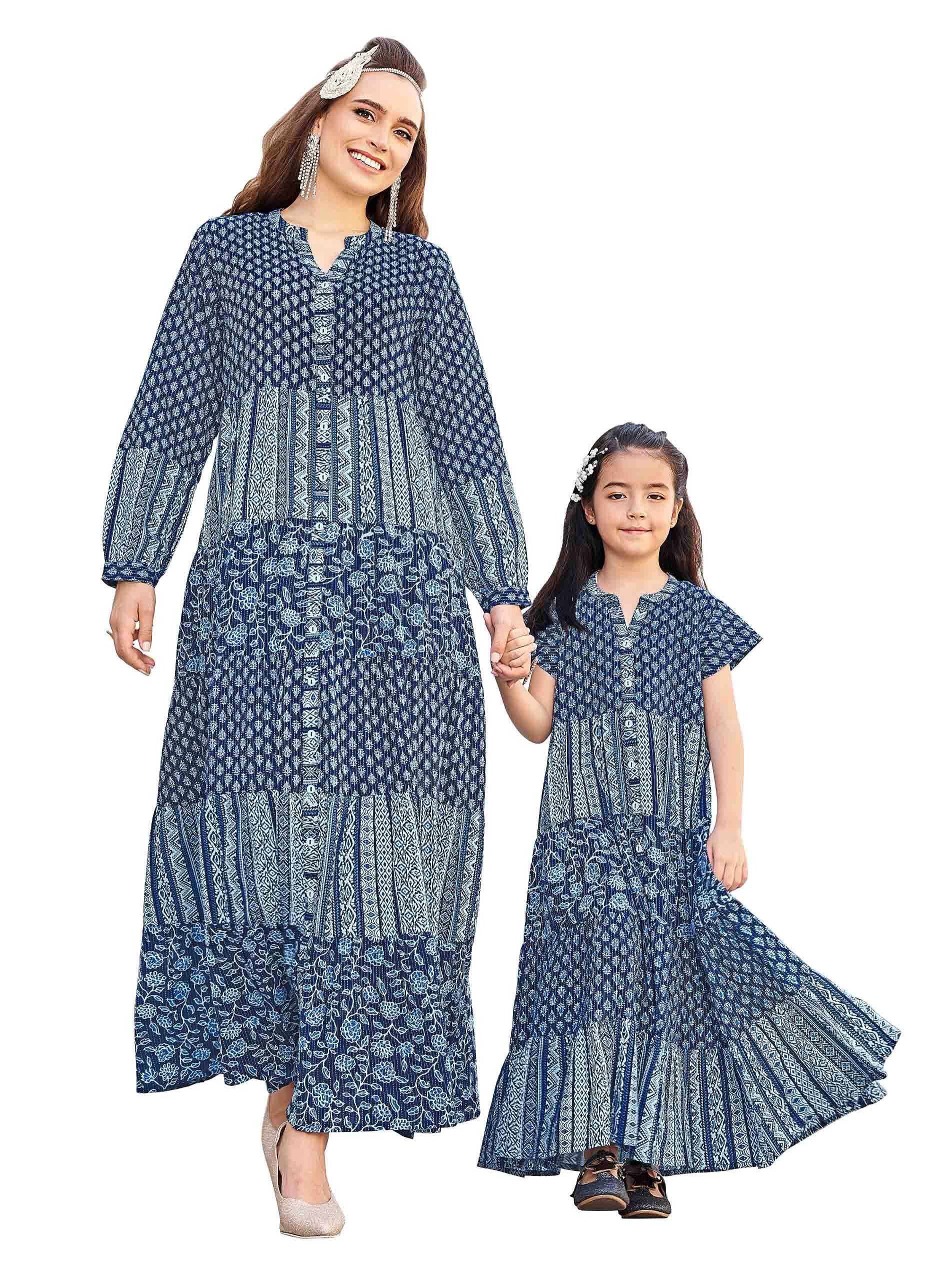 تألقي مع ابنتك بنفس الاطلالة باختيارك لجلابية نصف كم زرقاء اللون مصممة بأنماط مميزة باللون الأبيض مع أزرار أمامية لاطلالة تخطف الأنظار في المناسبات