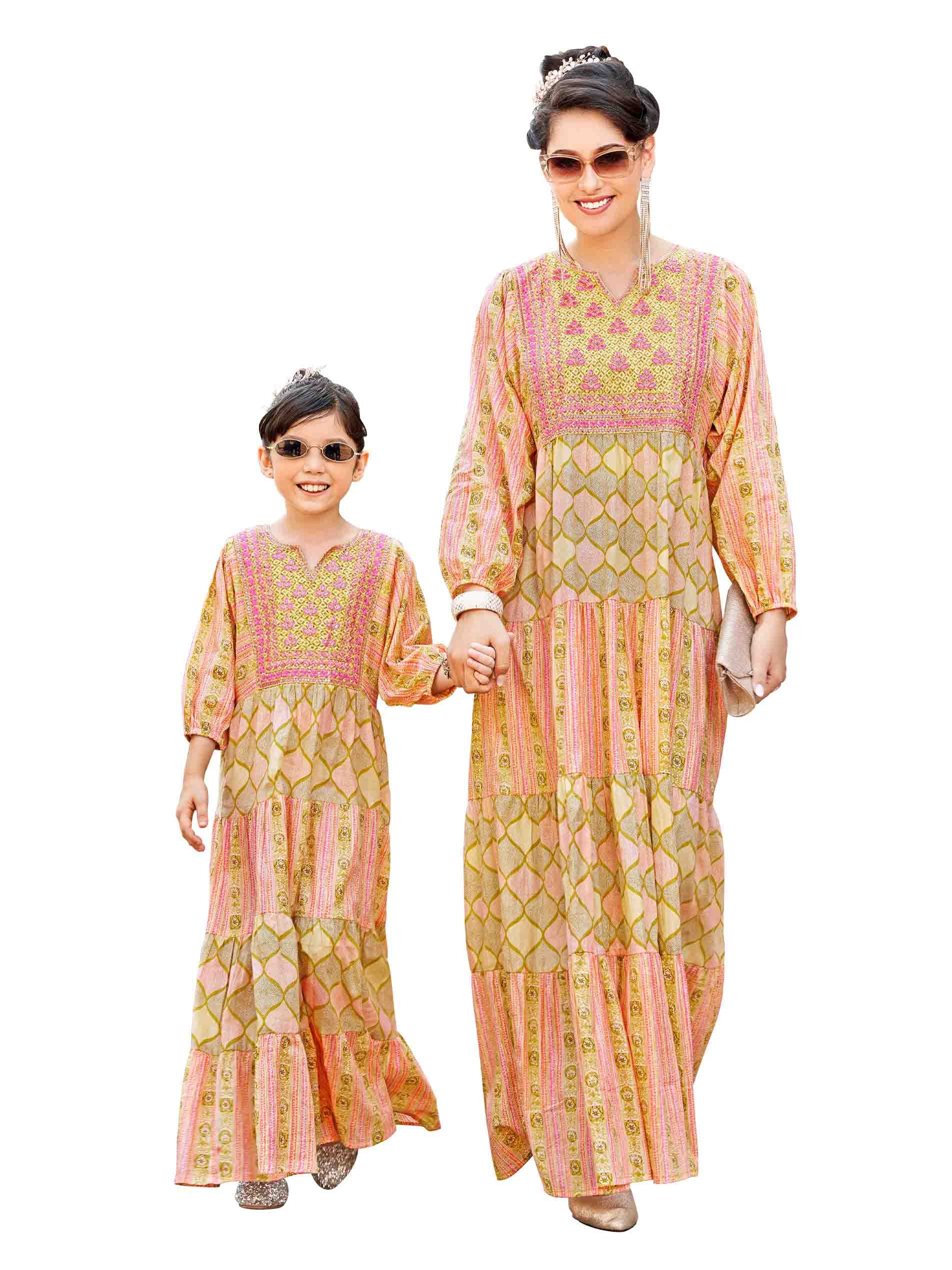 لوك الأم والبنت بجلابية رائعة من القطن صفراء اللون مصممة بأنماط متعددة لاطلالة مبهجة في المناسبات الخاصة.