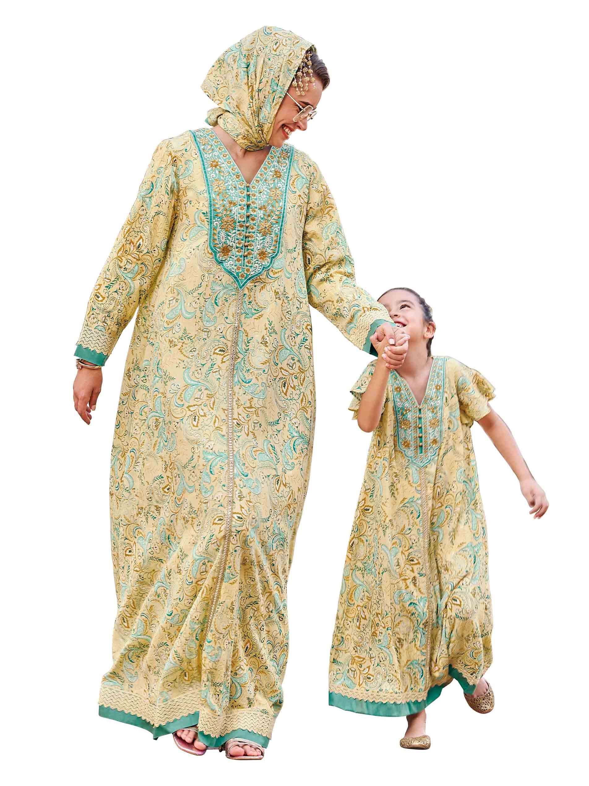 جلابية نصف كم صفراء اللون مصنوعة من القطن بنمط مزخرف باللونين الأصفر والأزرق. ويكتمل التصميم بطية صدر مشجرة مع أزرار أمامية.
