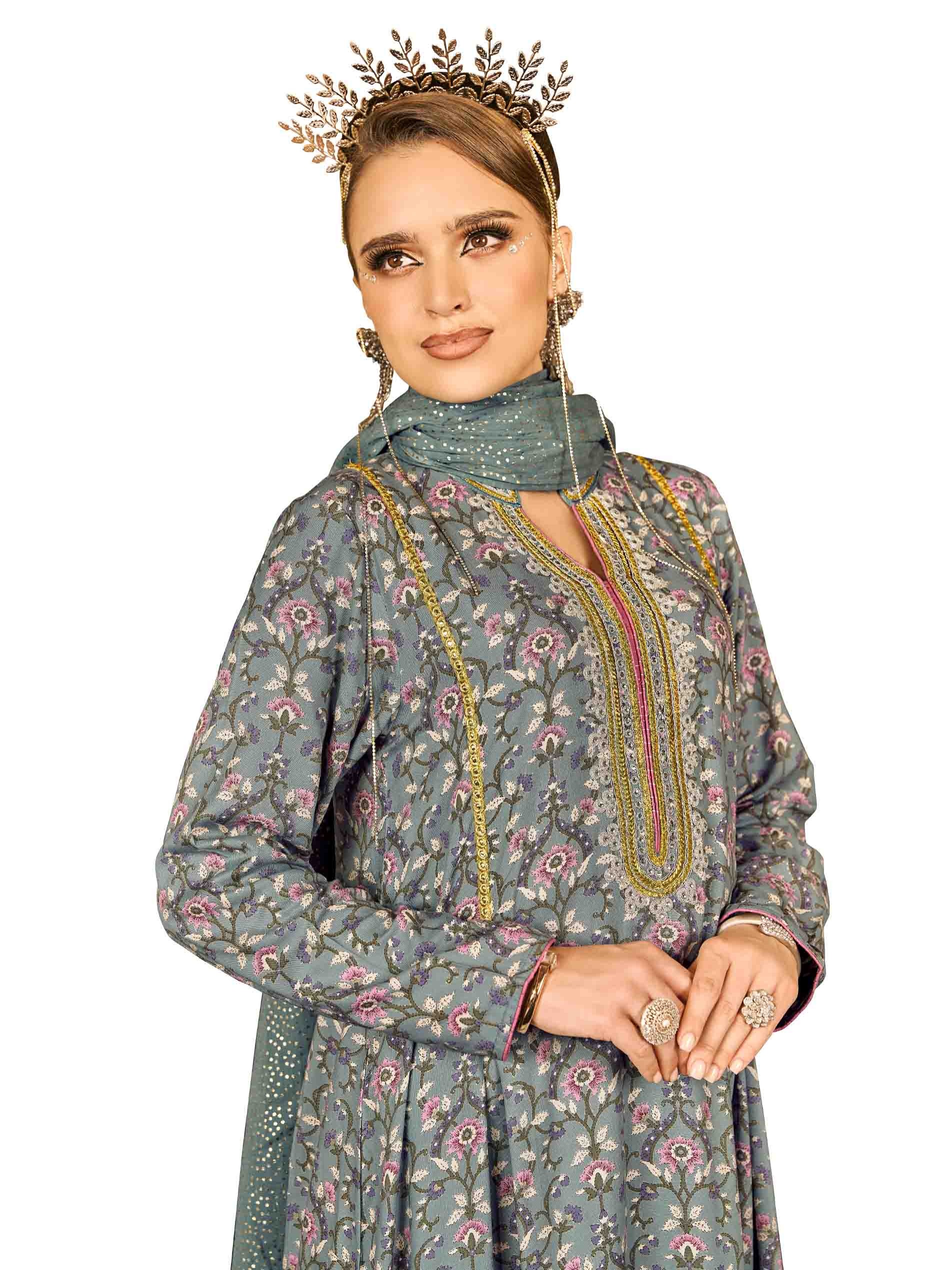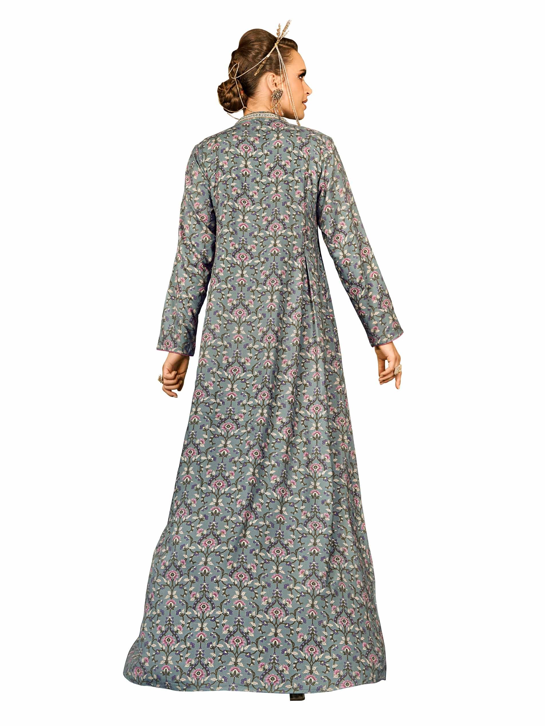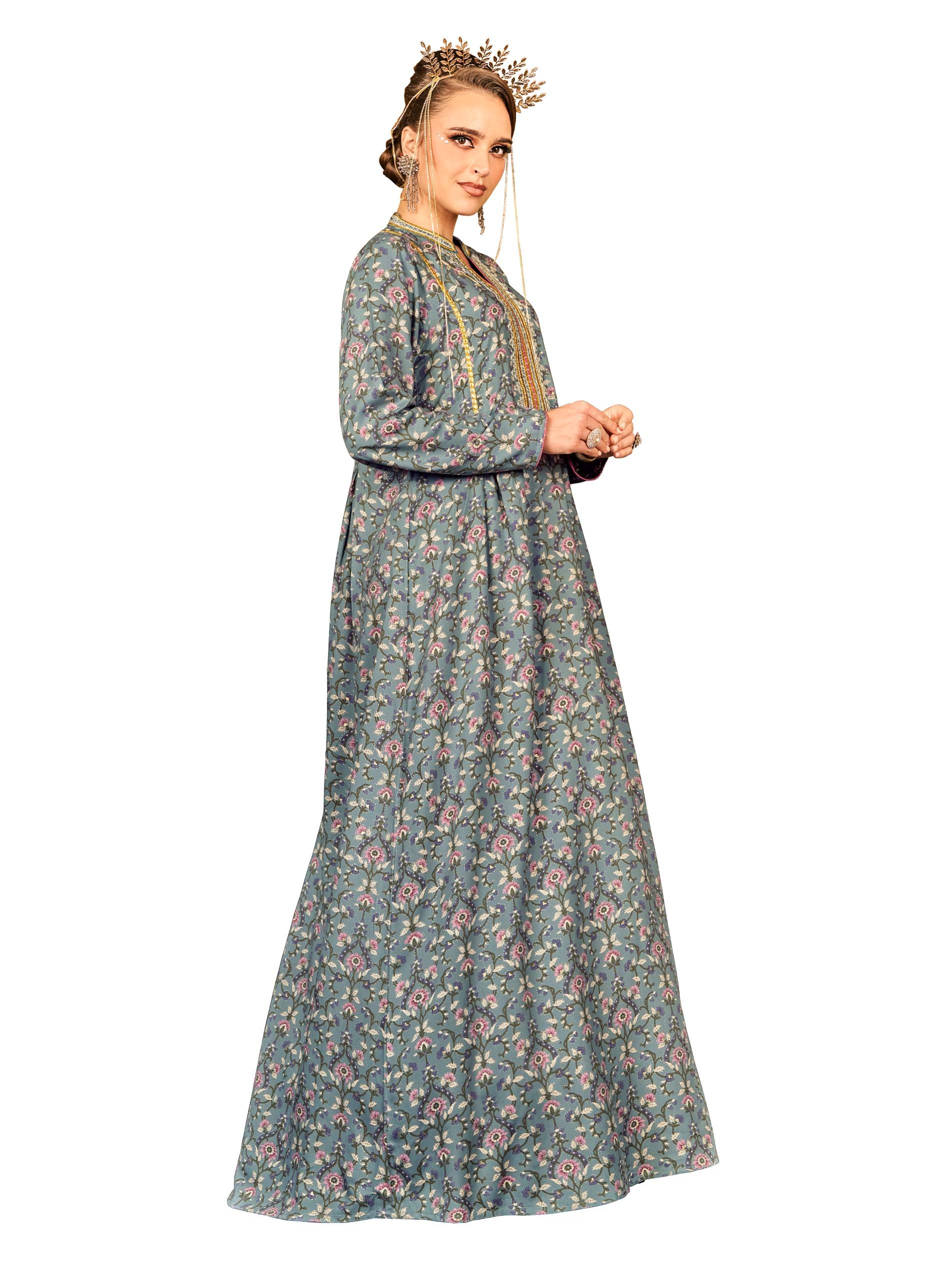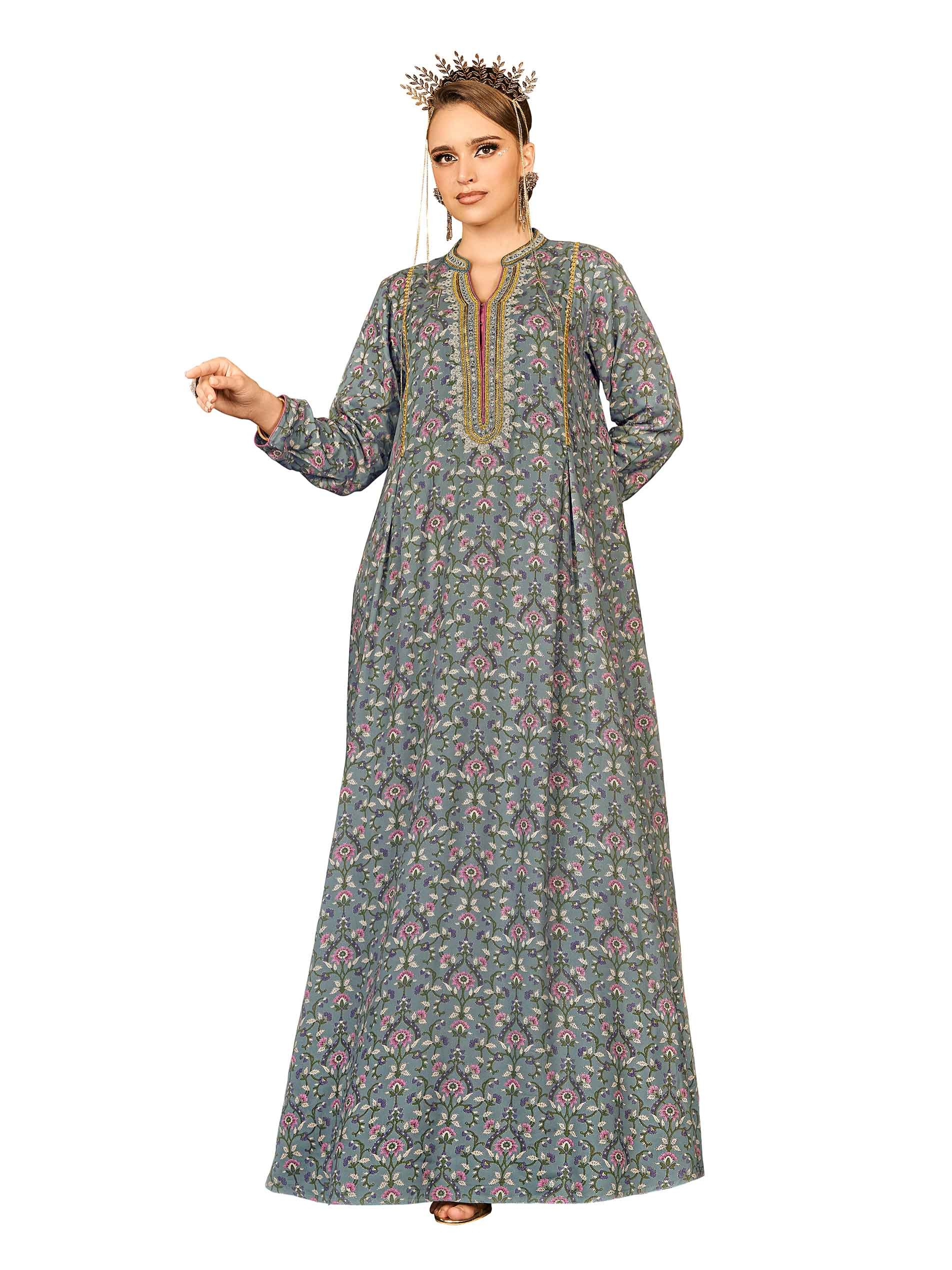 جلابية رمادية اللون مصممة بنقشة الزهور الوردية مع أكمام طويلة وتطريز على الصدر بلمسة ذهبية