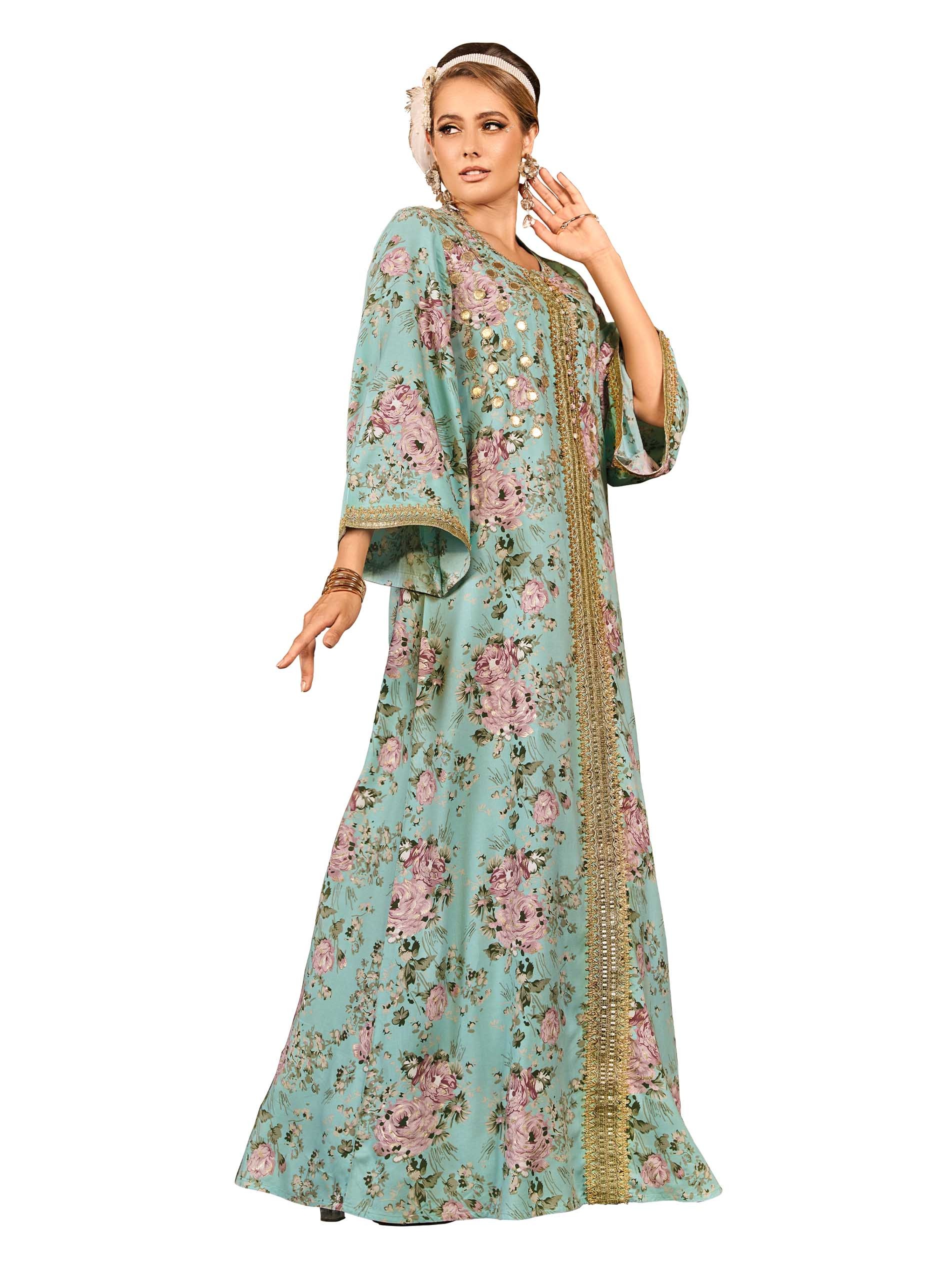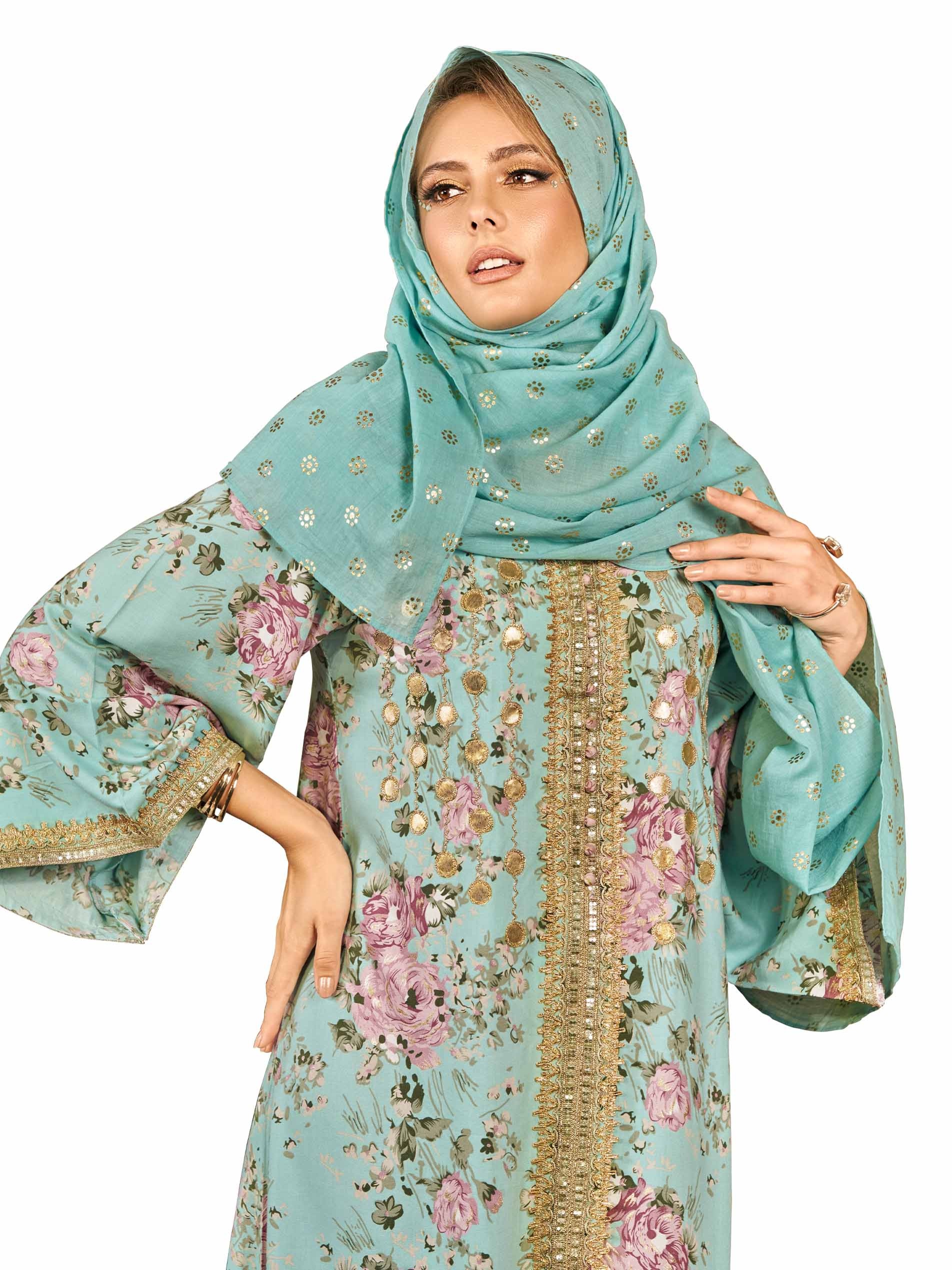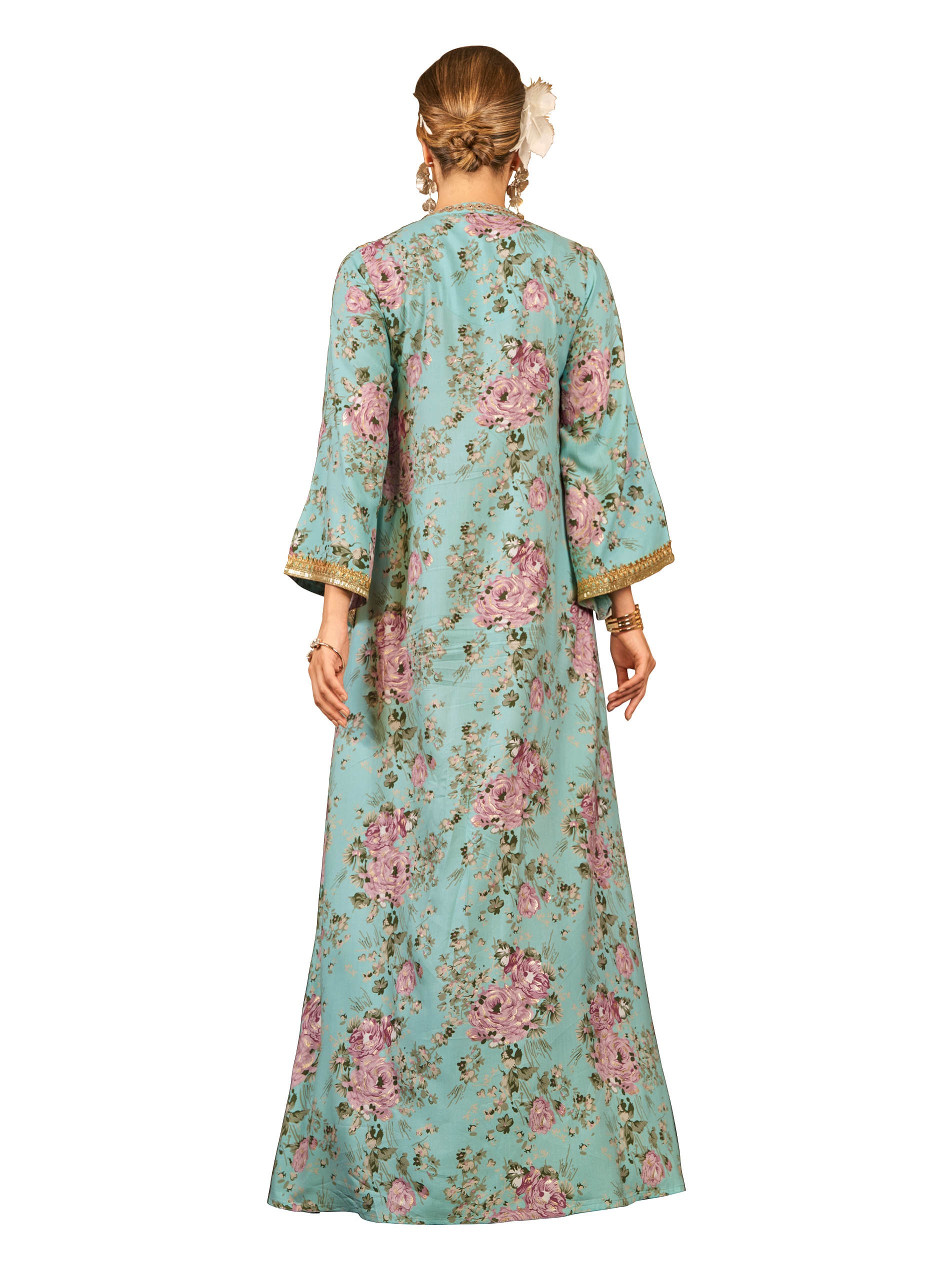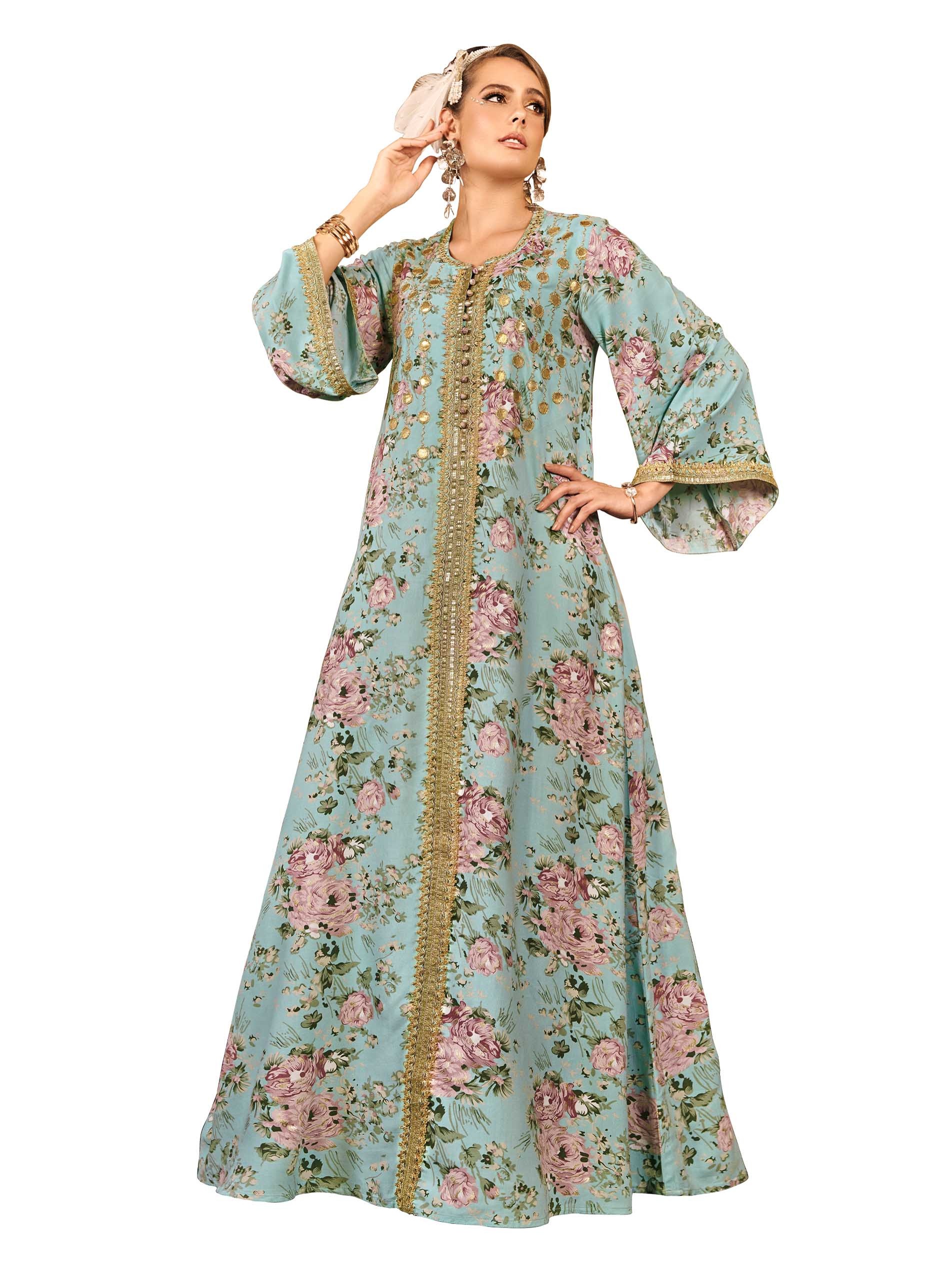 تألقي في جلابية من القطن باللون الأزرق السماوي مزودة بنقشة الزهور الوردية مع أكمام طويلة وتطريز ذهبي اللون يمتد بطول الجلابية لاطلالة ساحرة في المناسبات.