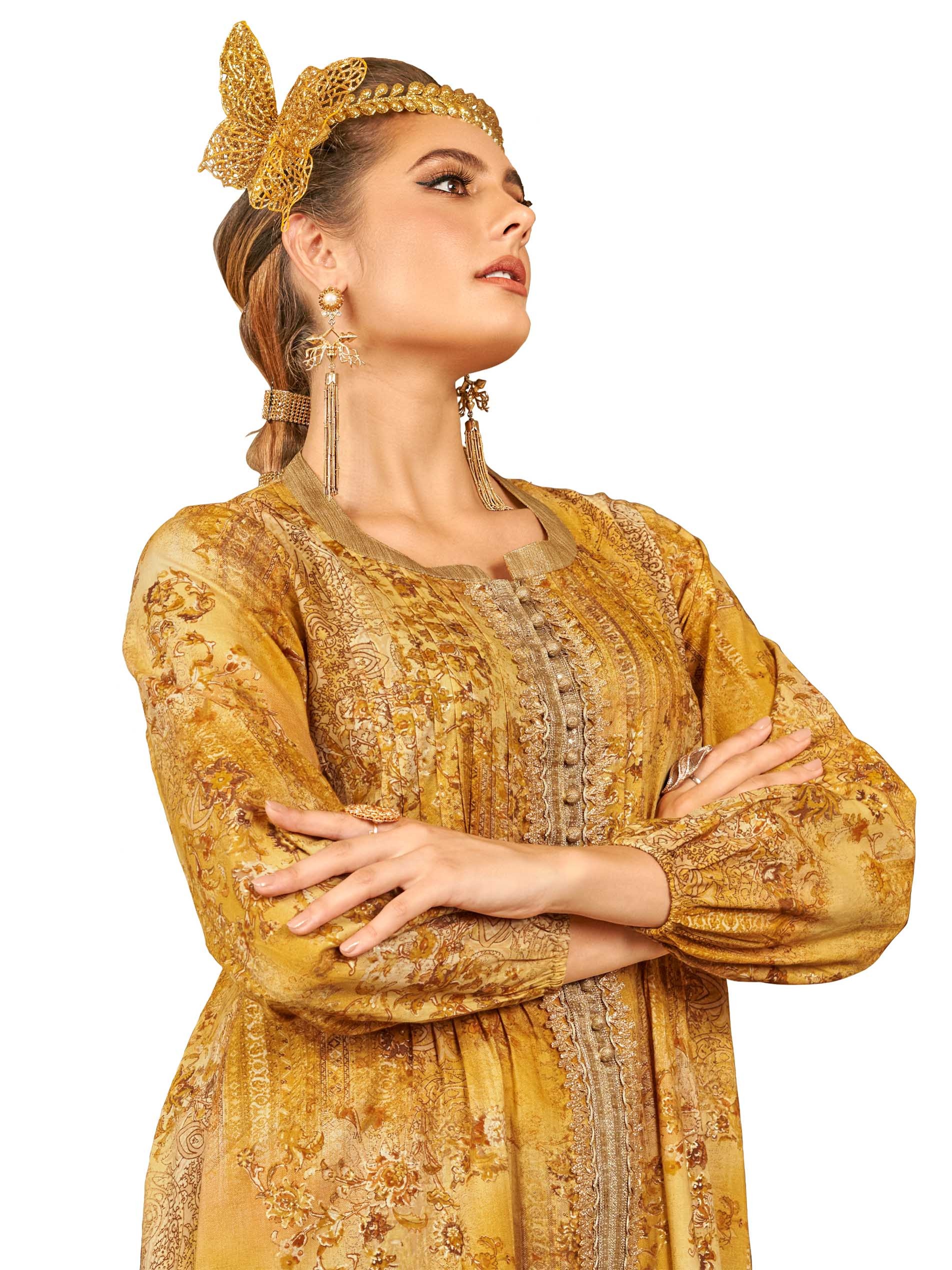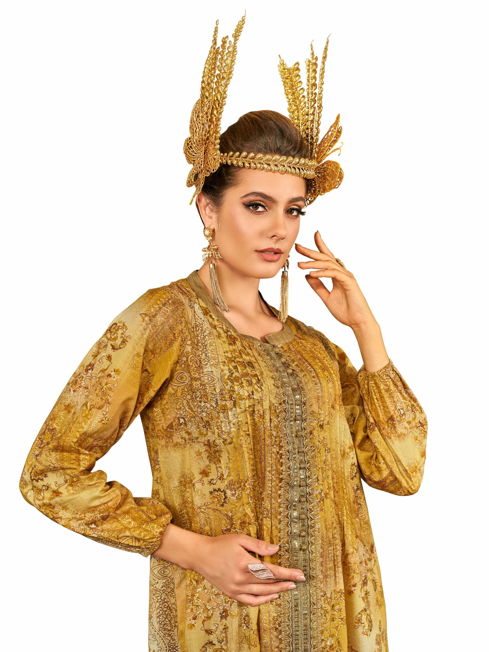 جلابية من القطن صفراء اللون بقصة A-line مصممة بنقوشات مميزة مع أكمام طويلة وفتحة رقبة دائرية باللون الذهبي.