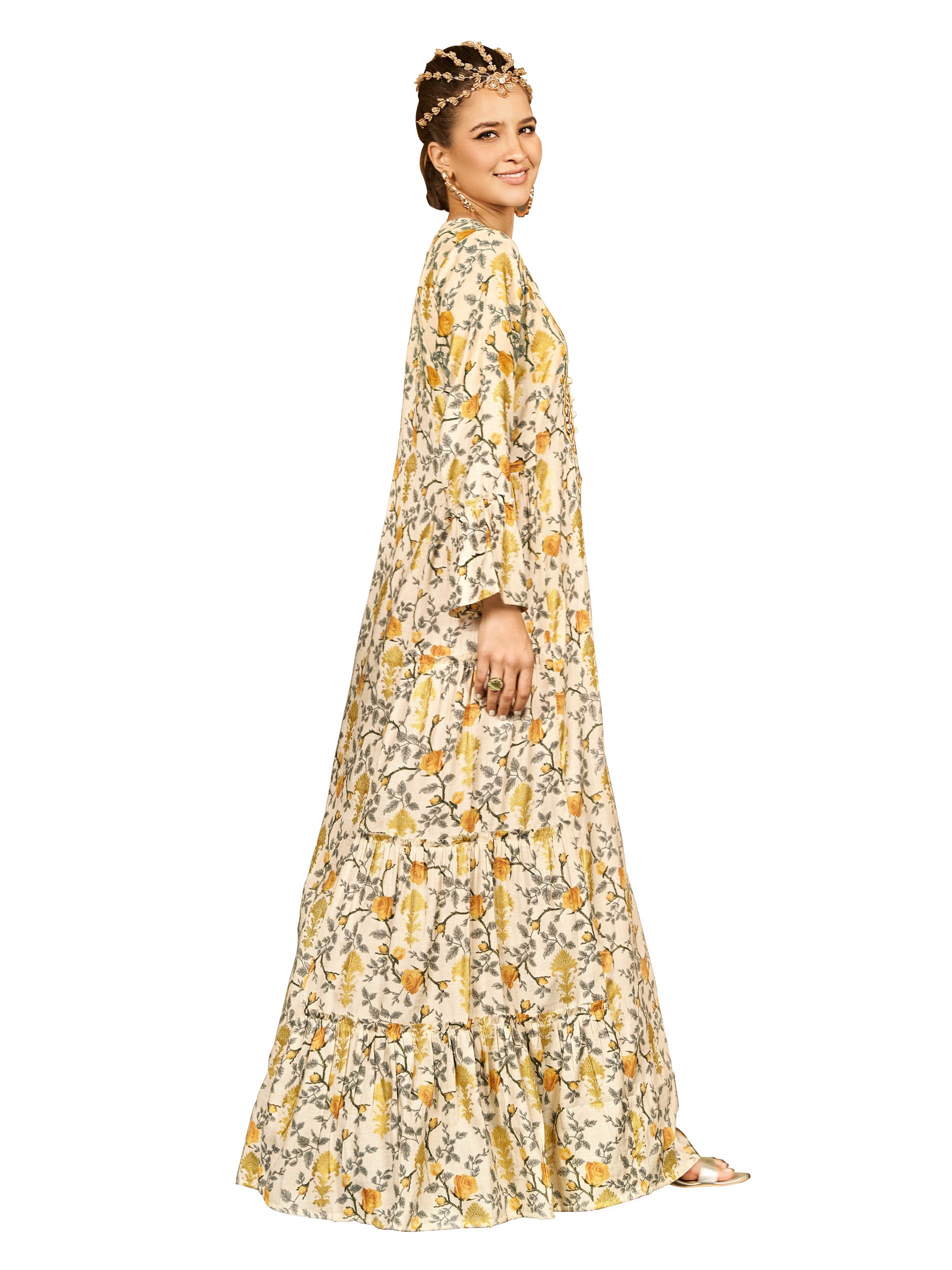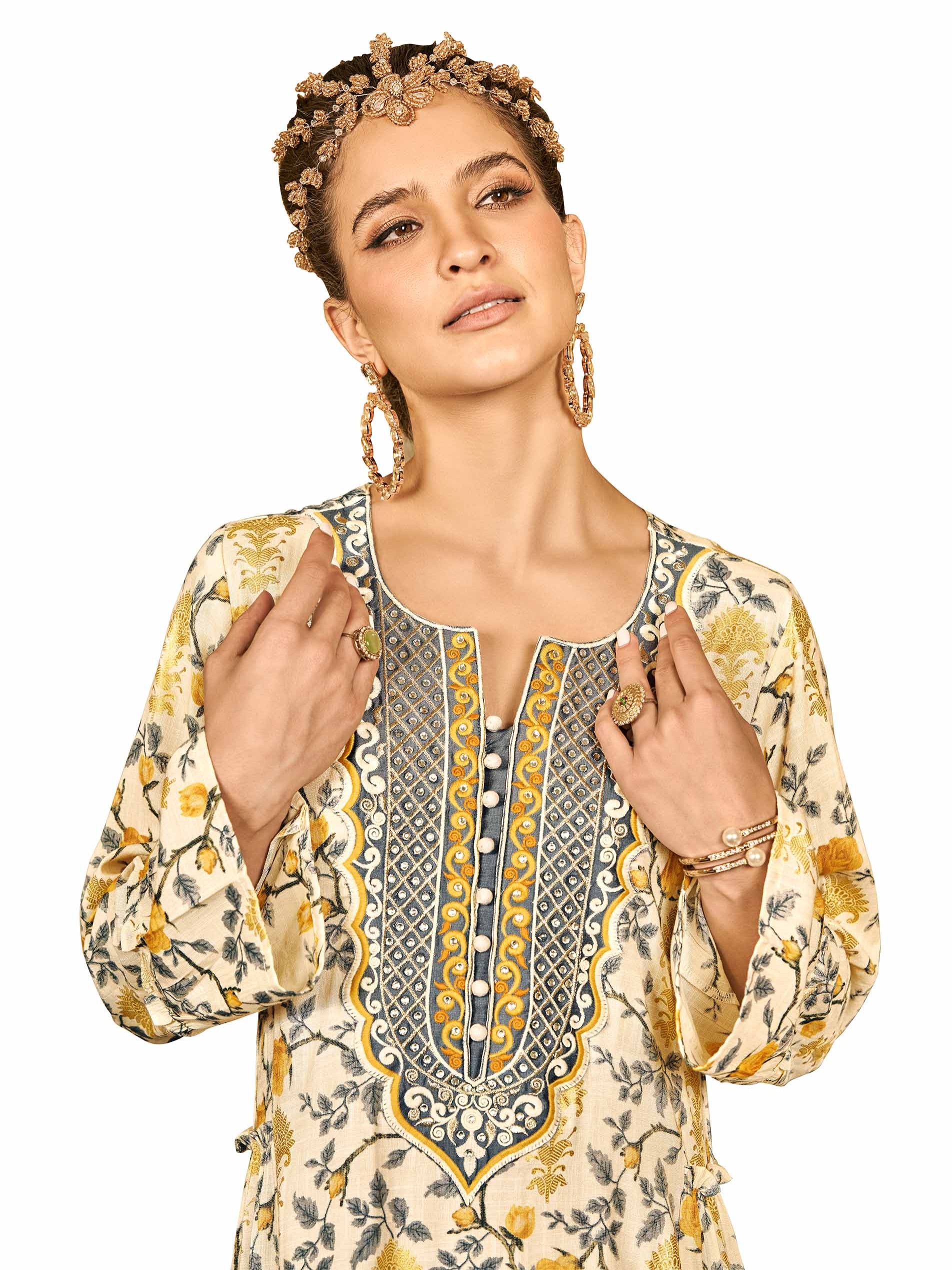 تألقي في جلابية قطنية مصممة بنقوشات الأزهار الصفراء مع أكمام طويلة وتطريز على الصدر باللون الأصفر والرمادي والأبيض لاطلالة رائعة ومبهجة في رمضان.