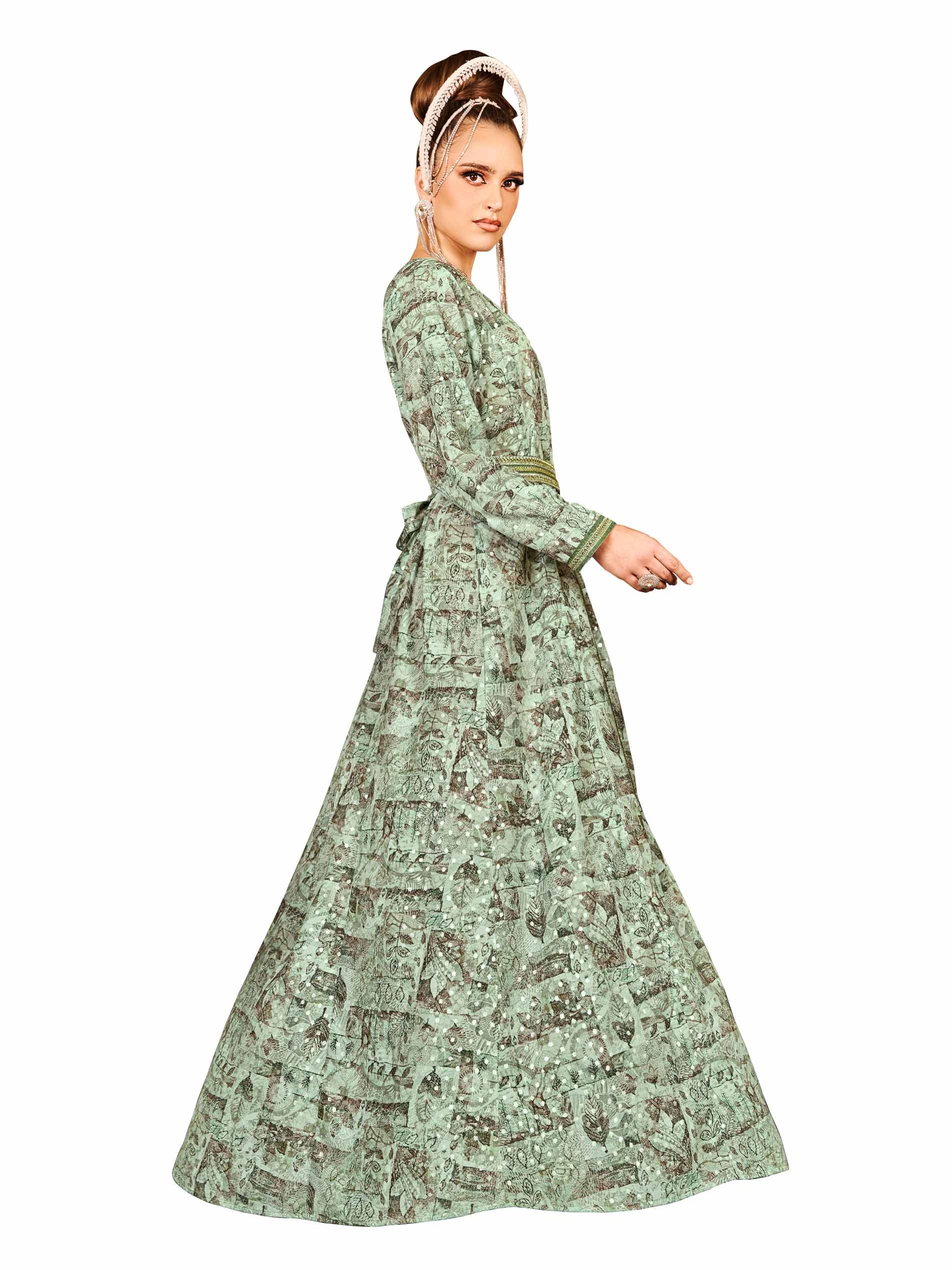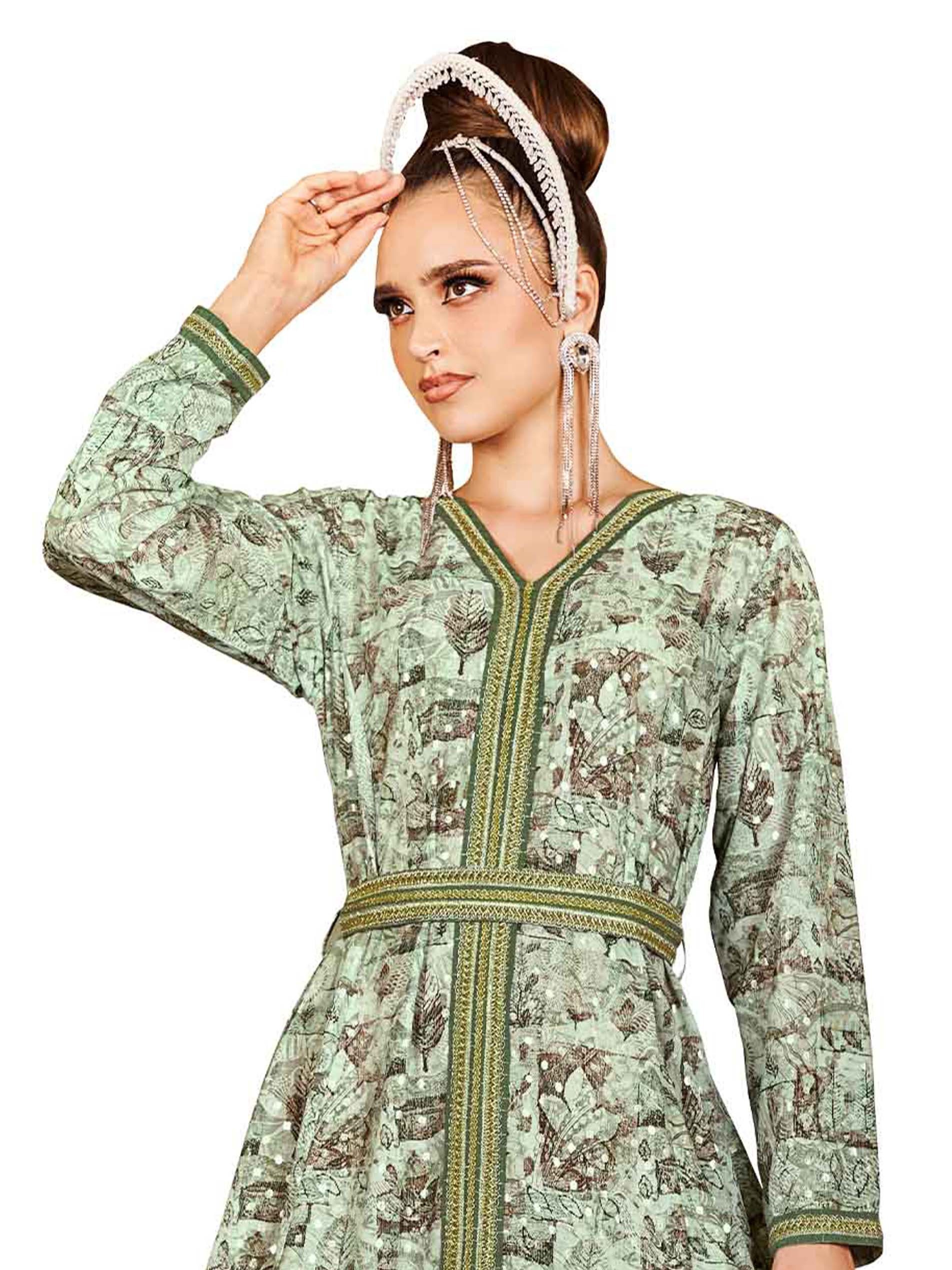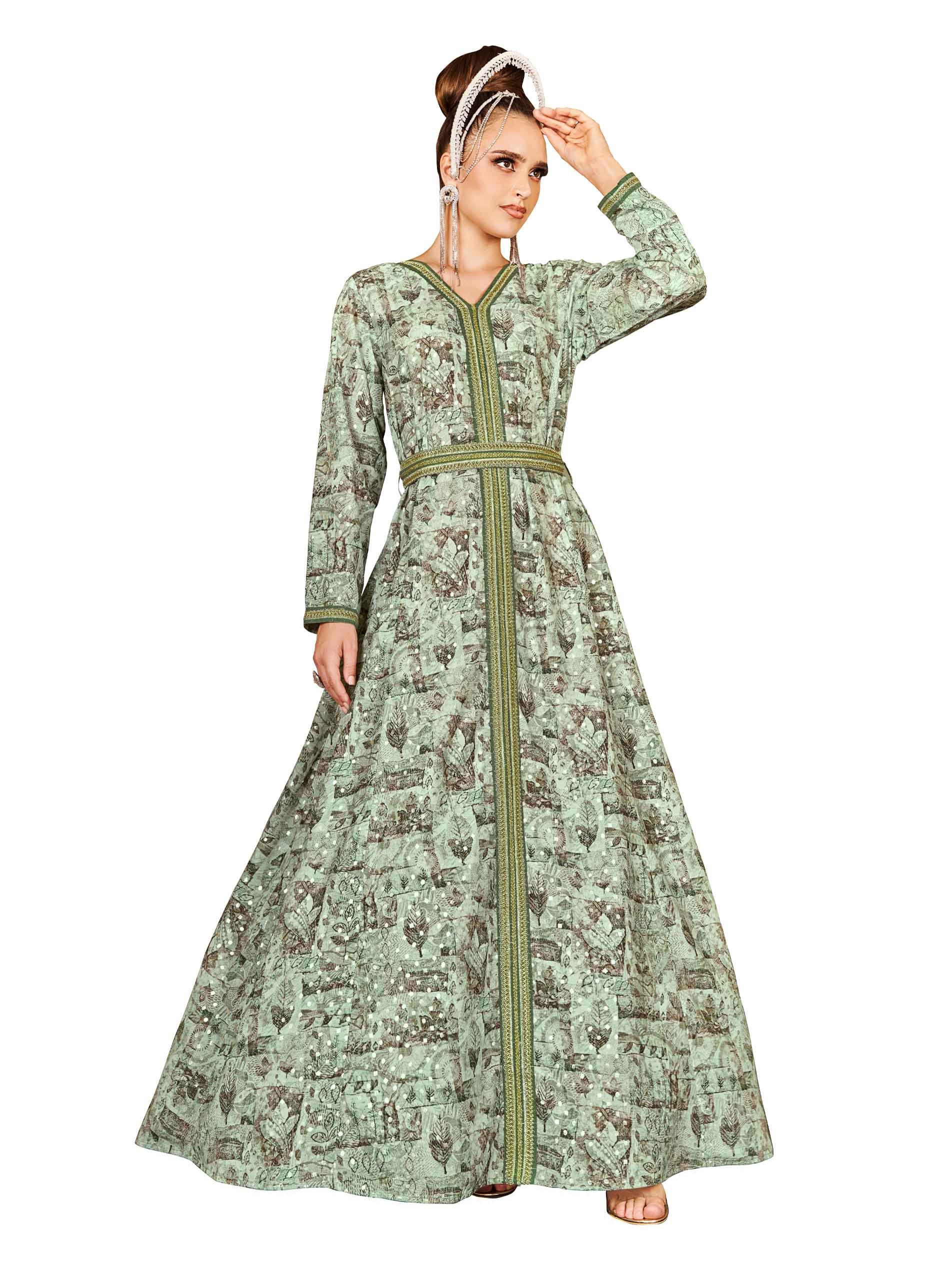 تألقي في قفطان رمضاني باللون الأخضر الرائع مزين بطبعة من أوراق الشجر باللون البني ونقاط البولكا البيضاء. ويكتمل التصميم بتطريز يمتد من فتحة الرقبة بطول القفطان وحزام مطرز على الخصر.