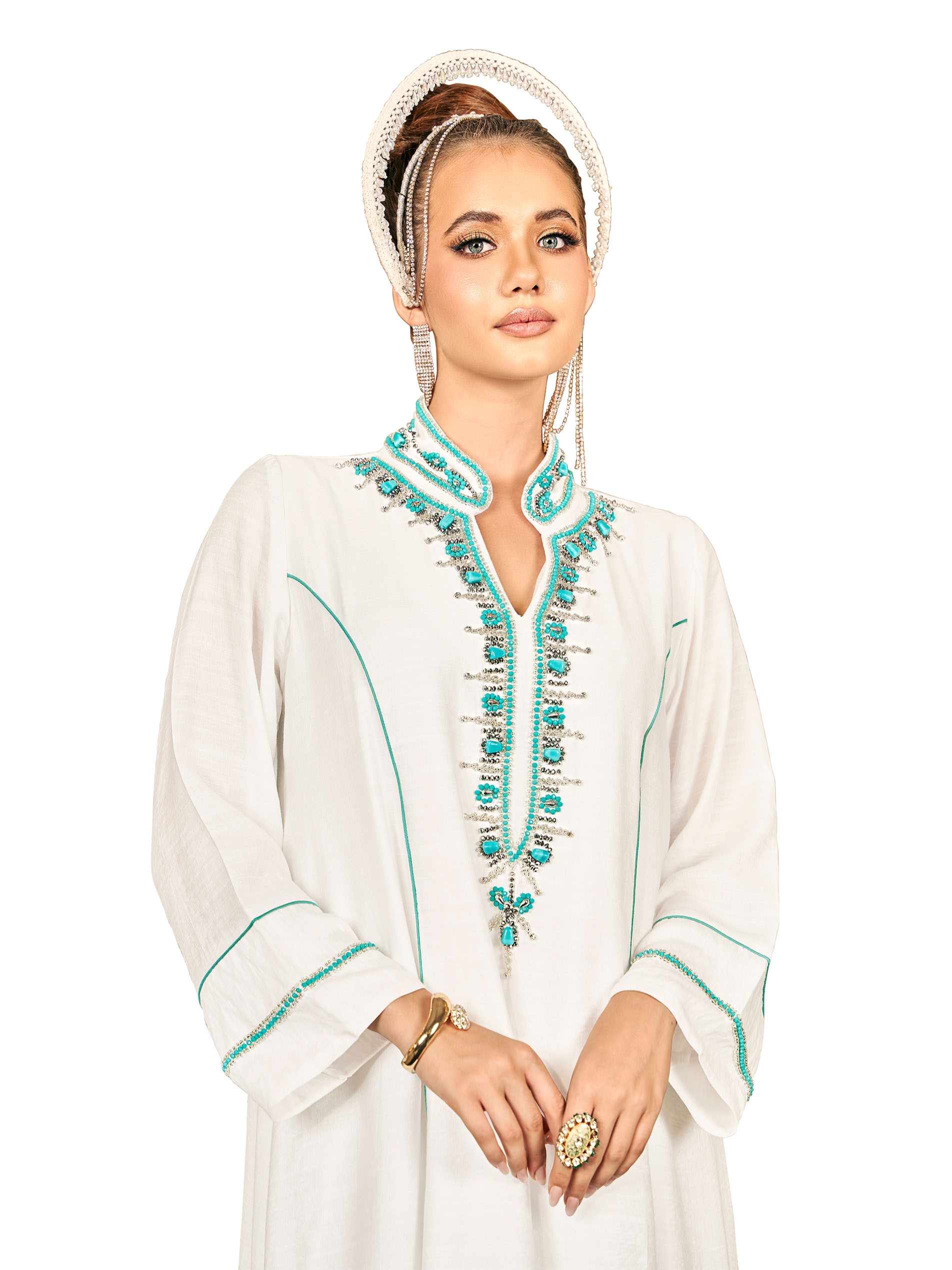 جلابية سادة بيضاء اللون بقصة A-line مع أكمام طويلة وتطريز خرزي على الصدر باللون الأزرق يكمل أناقتك ويزيد من شعورك بالبساطة والجمال.