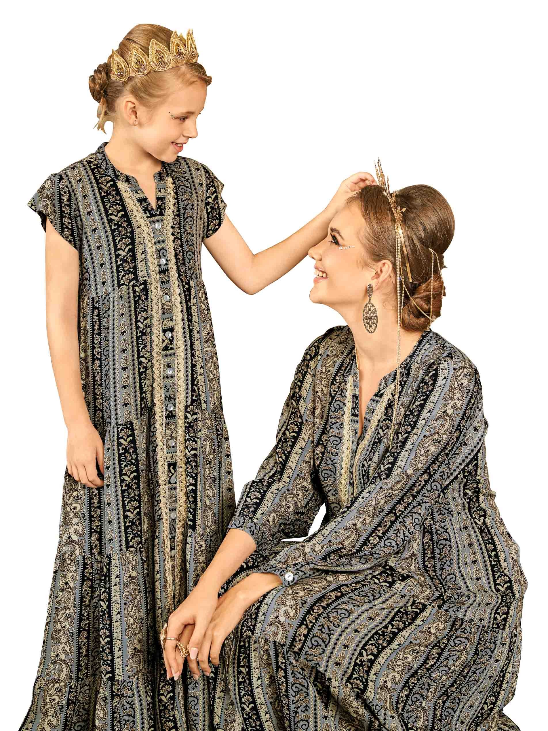 تألقي مع ابنتك بنفس الاطلالة واختاري لها جلابية نصف كم مزخرفة وملونة باللونين الأسود والرمادي. ويكتمل التصميم بتطريز ذهبي من الدانتيل يمتد بطول الجلابية مع أزرار أمامية.