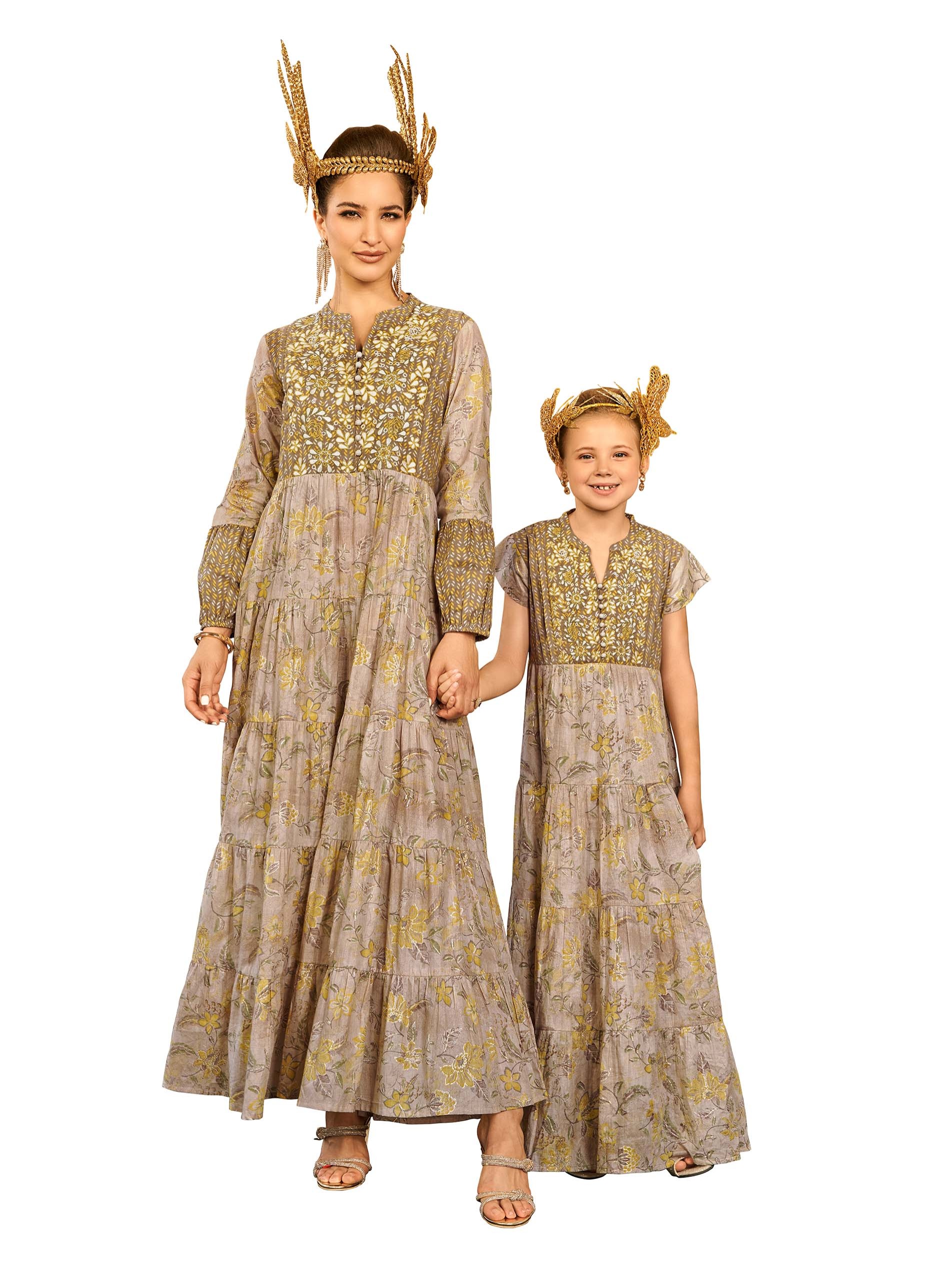 لوك الأم والبنت بجلابية رائعة من القطن مصممة بطبعة الأزهار باللونين البني والذهبي.