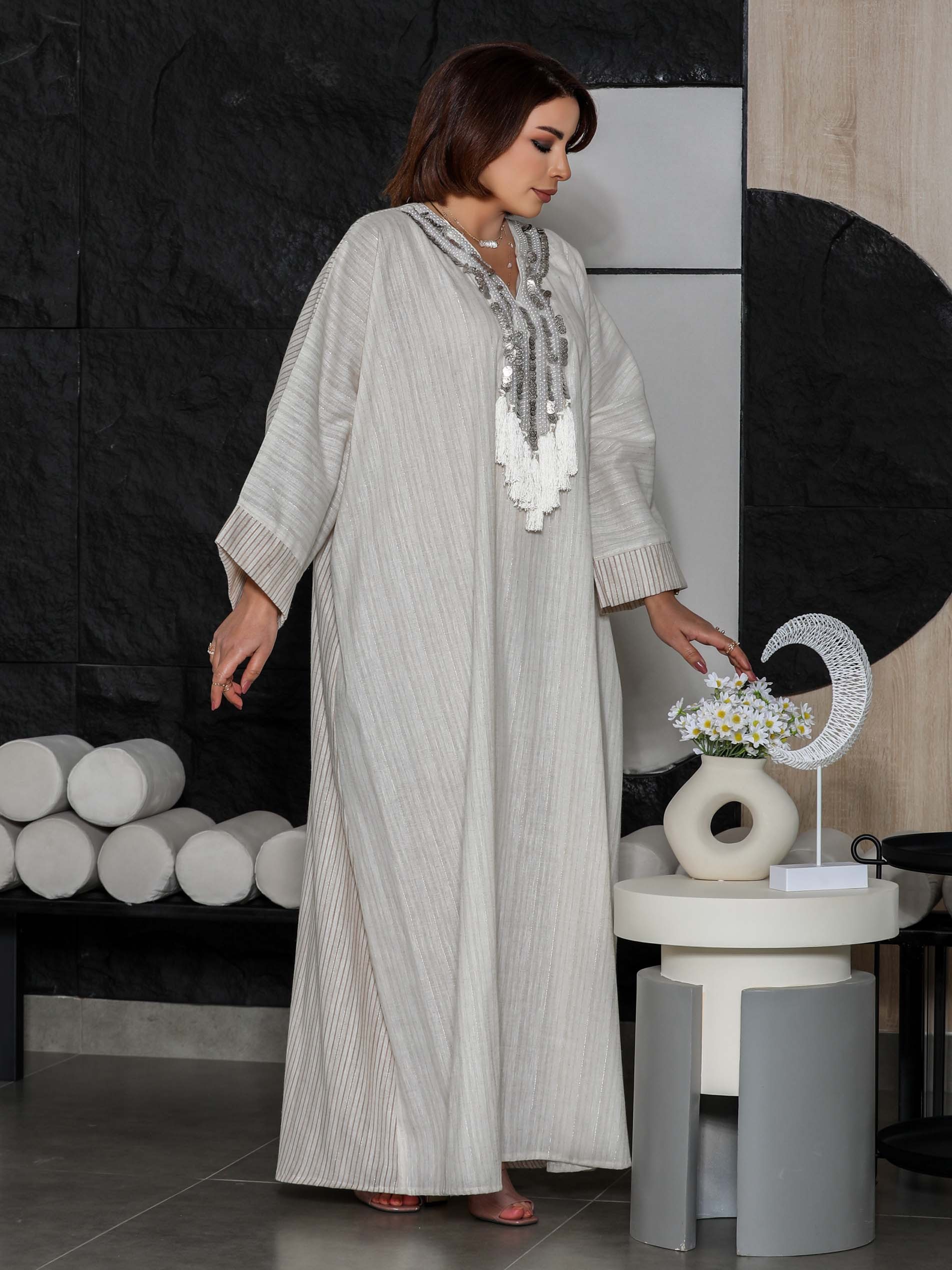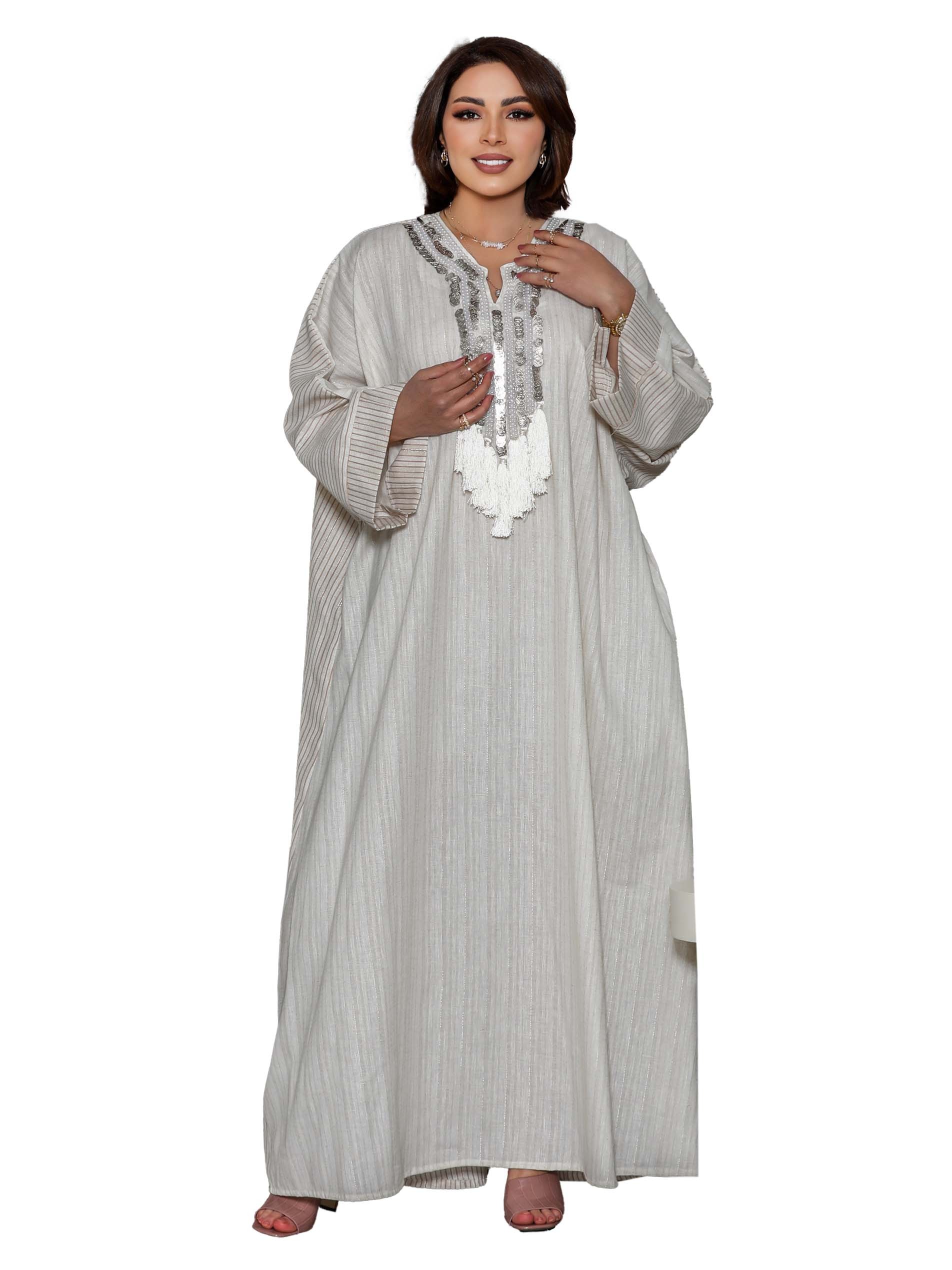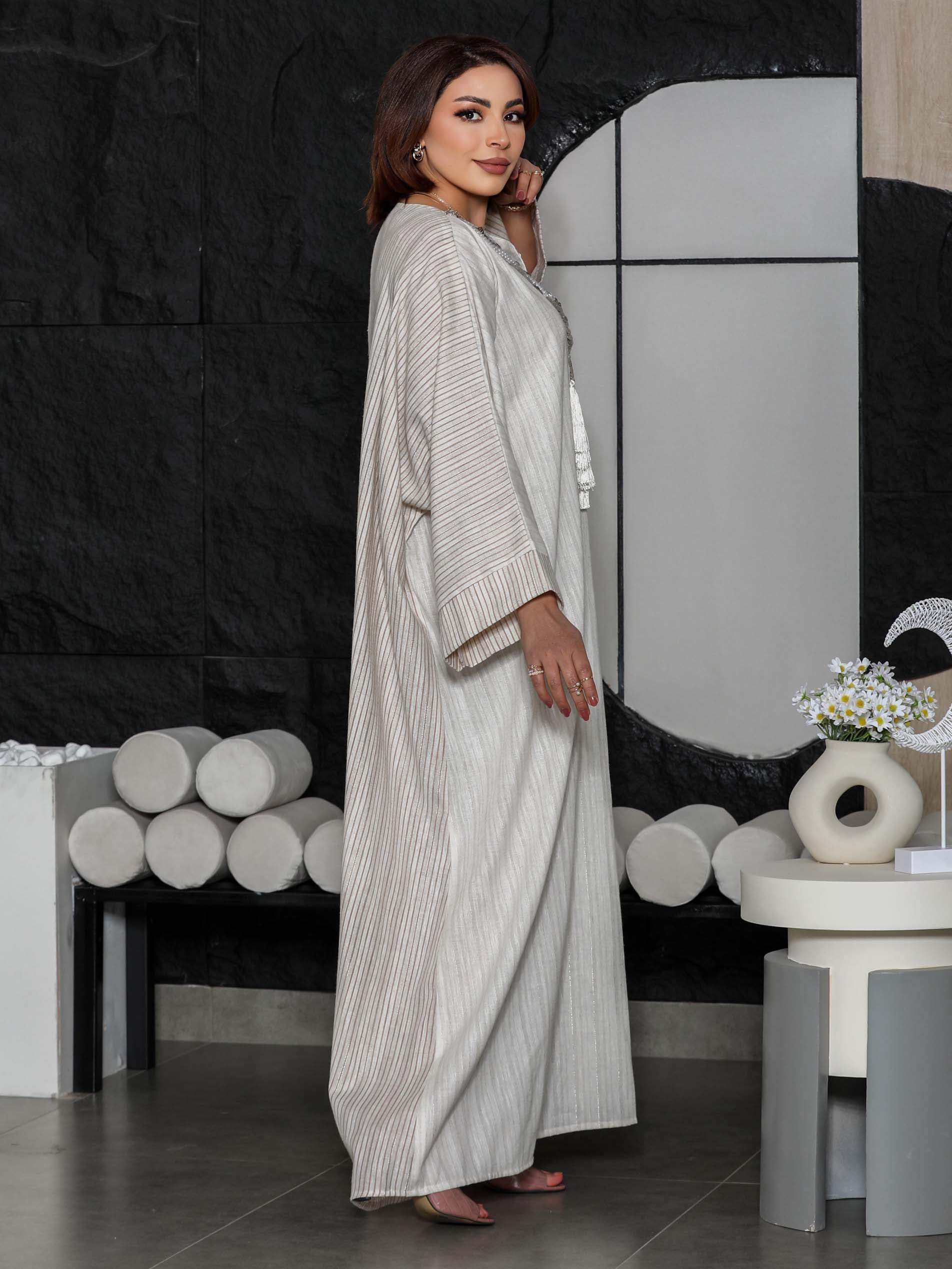 جلابية من القطن بيضاء اللون بتصميم واسع وطويل مع أكمام طويلة وتطريز على الصدر باللون الفضي لاطلالة تخطف الأنظار في رمضان.