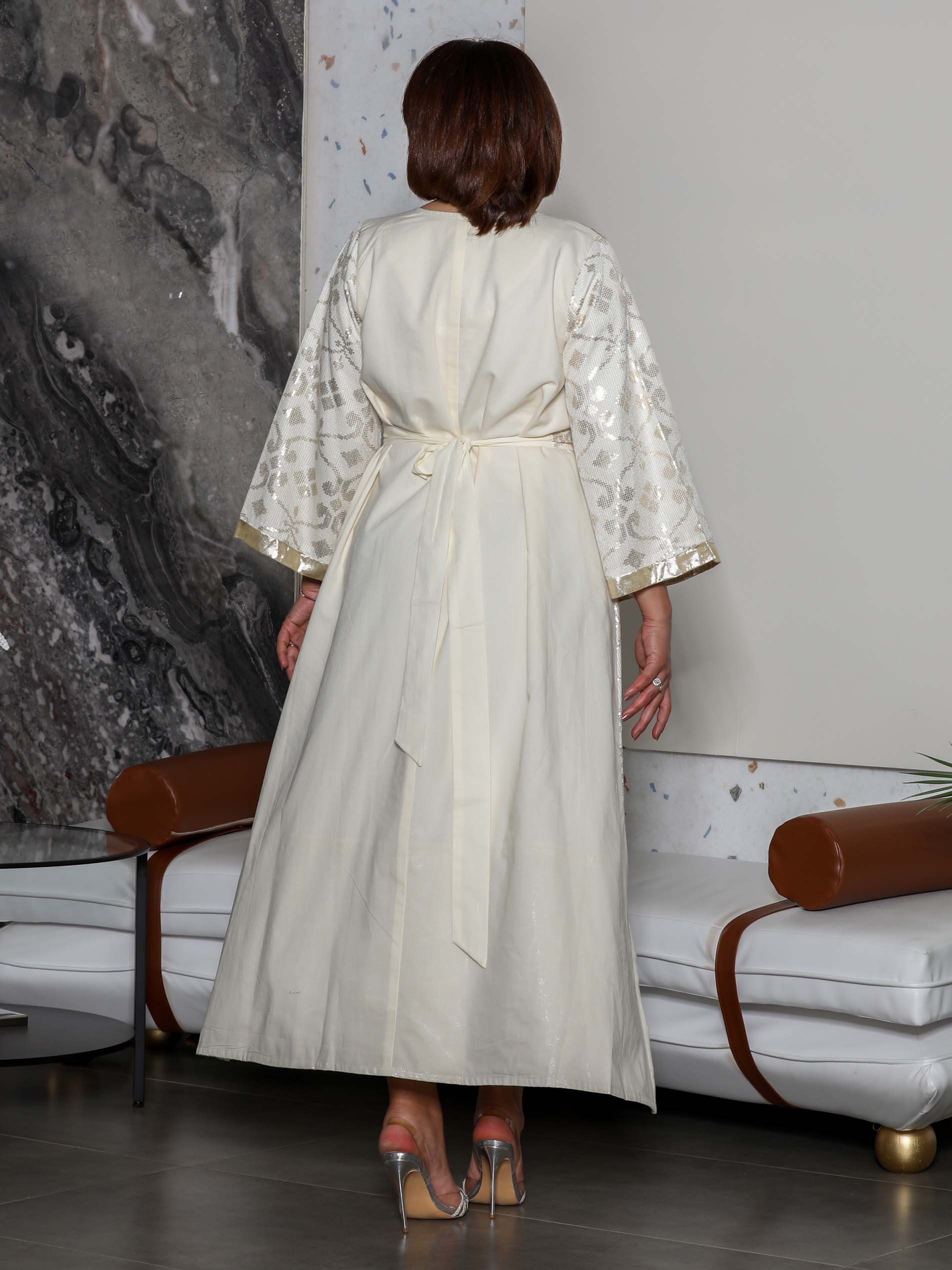 تألقي في جلابية قطنية بيضاء اللون مصممة بنقشة بسيطة مع أكمام طويلة مطرزة وأساور ذهبية
