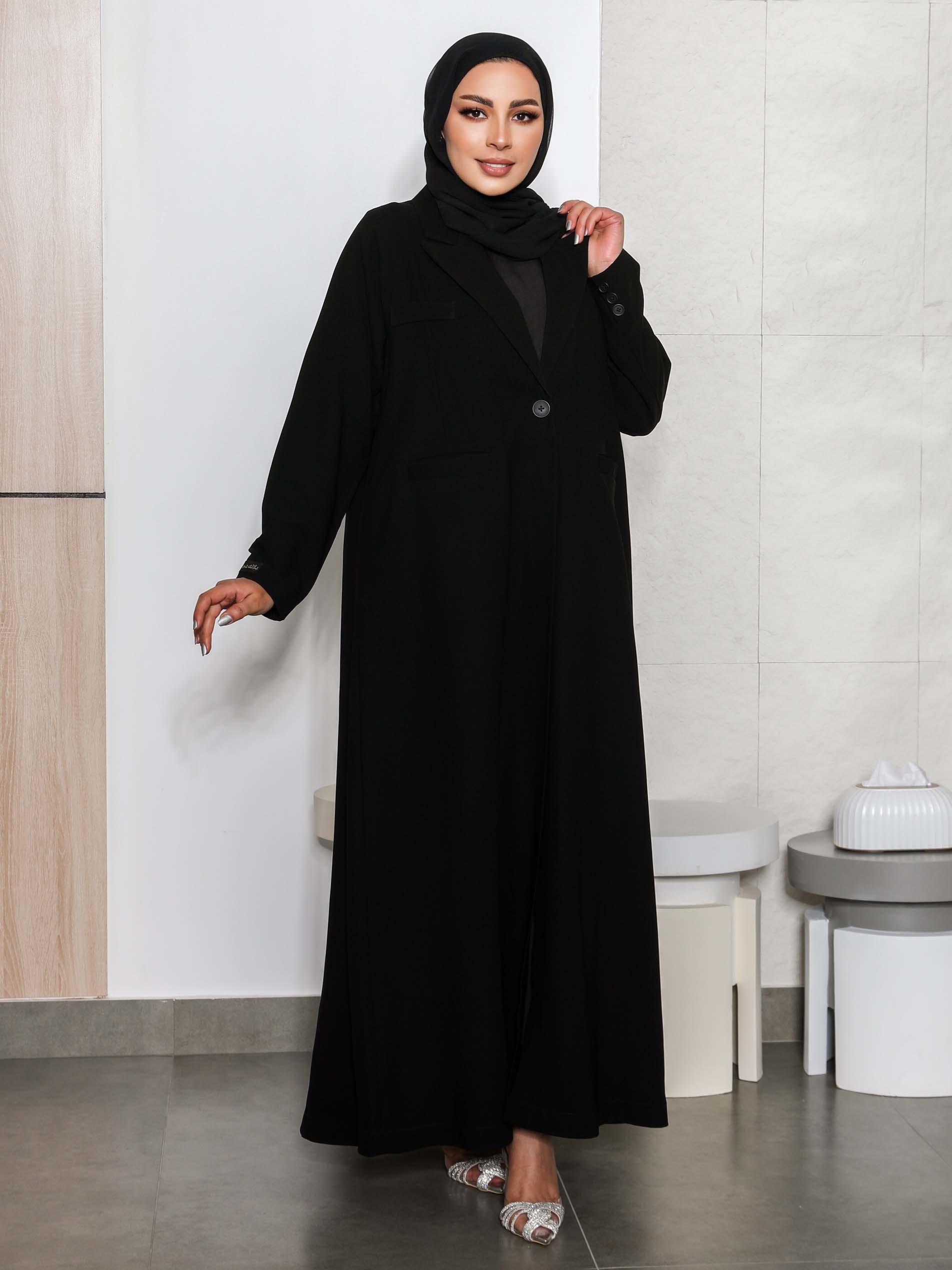 عباية سوداء سادة ومغلقة بقصة A-line، مصممة بأكمام طويلة وأزرار سوداء لإطلالة راقية في رمضان.