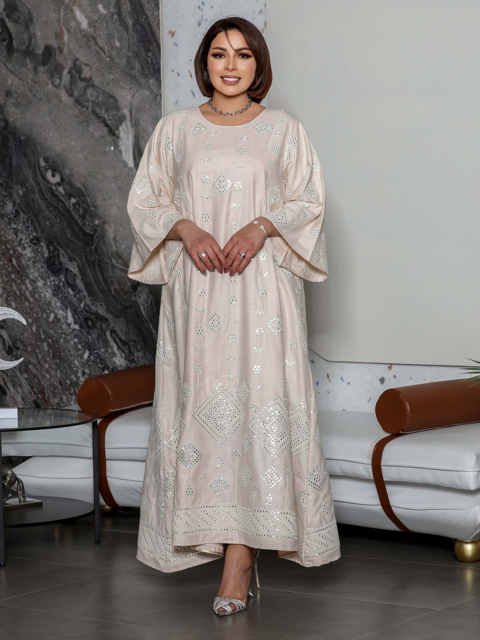 تألقي في جلابية قطنية باللون الأوف وايت مصممة بأنماط متنوعة ومرصعة بقليل من الألماظ لاطلالة تجمع بين البساطة والأناقة في رمضان.