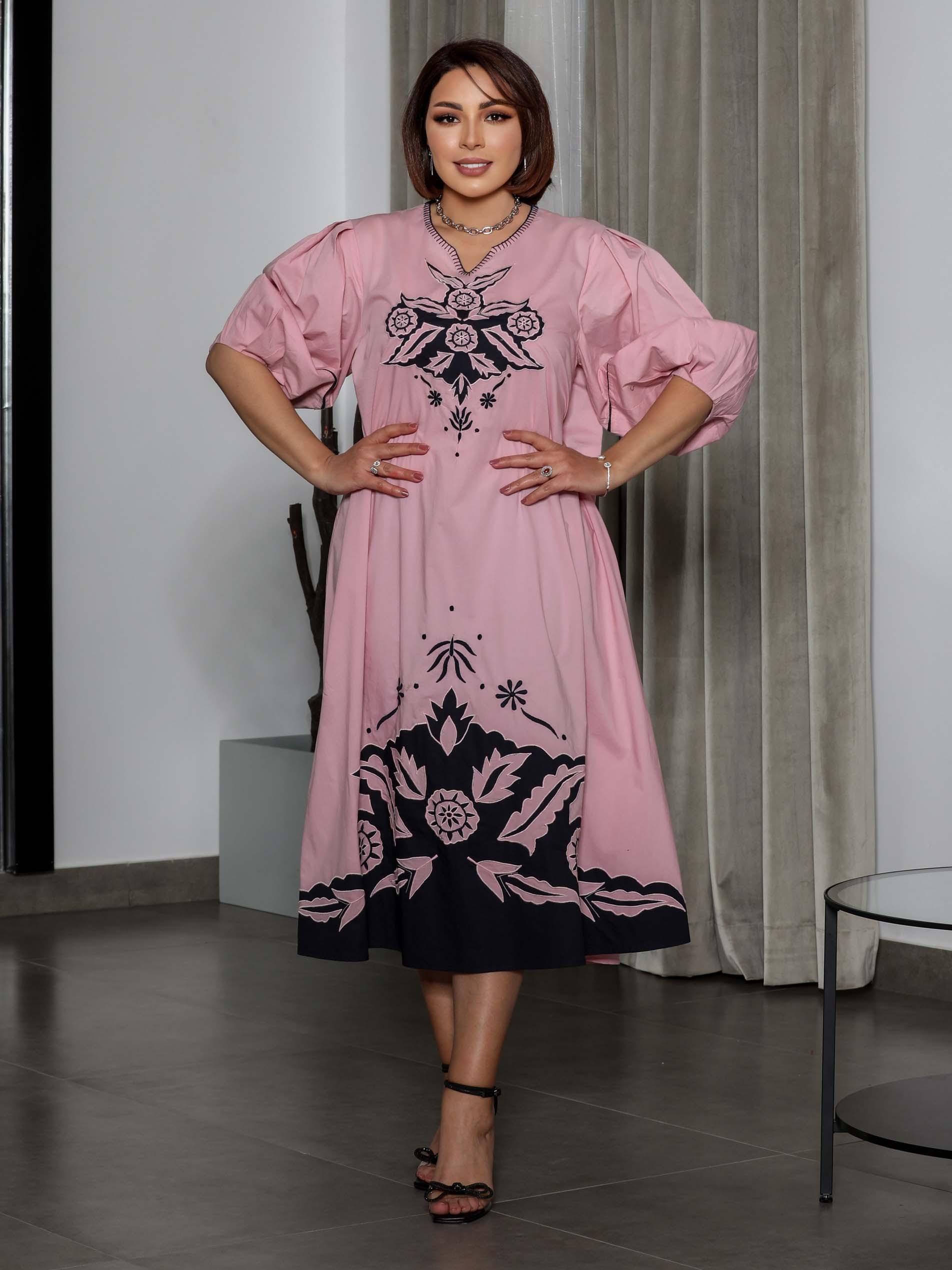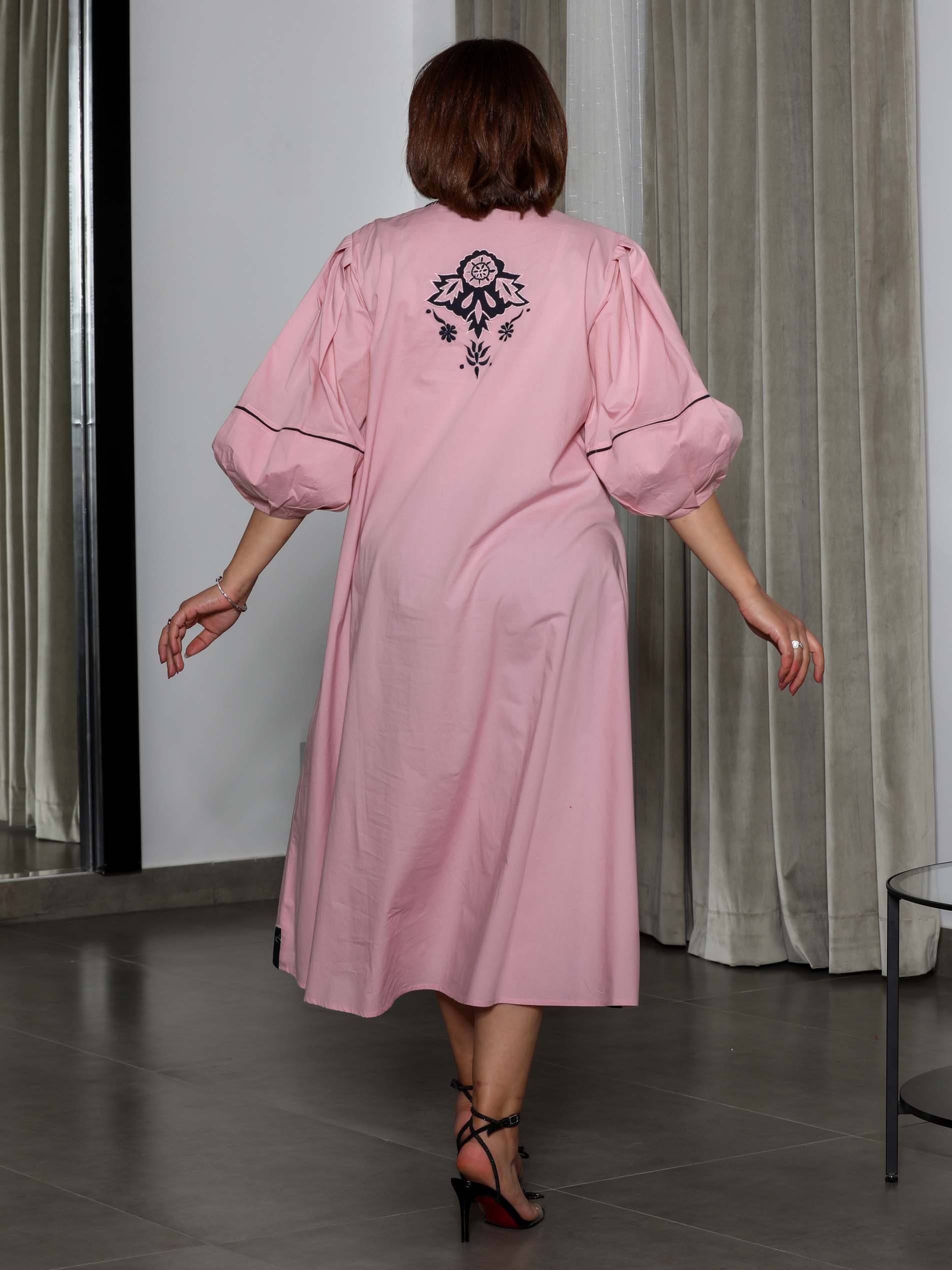 جلابية قطنية ملونة باللون الوردي ومصممة بنقش الزهور السوداء على الصدر وحواف الجلابية.