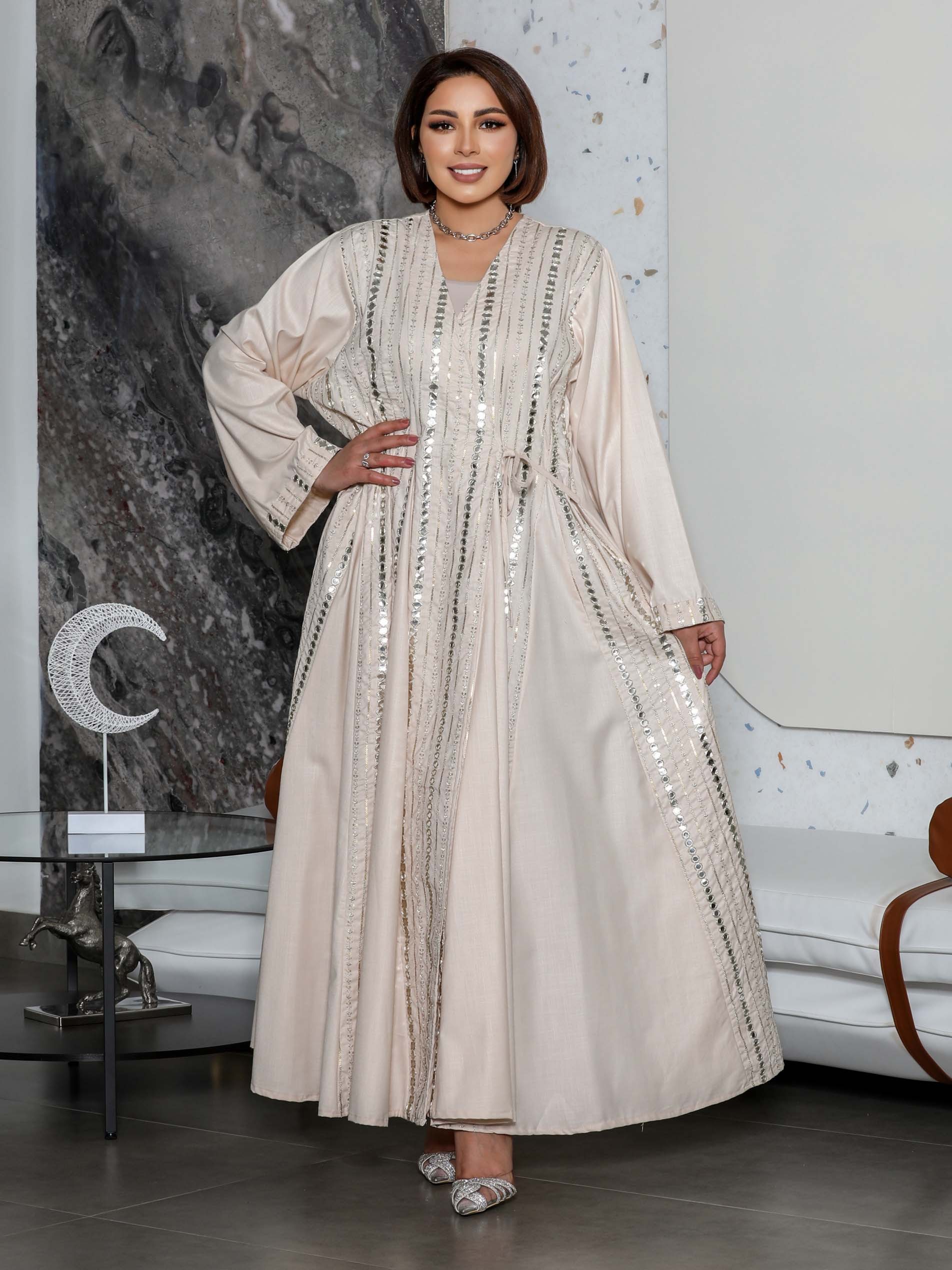 تألقي بجلابية ماكسي قطنية باللون الأبيض الفاتح، مرصعة بفصوص لامعة مع أكمام طويلة لإطلالة مذهلة في رمضان.