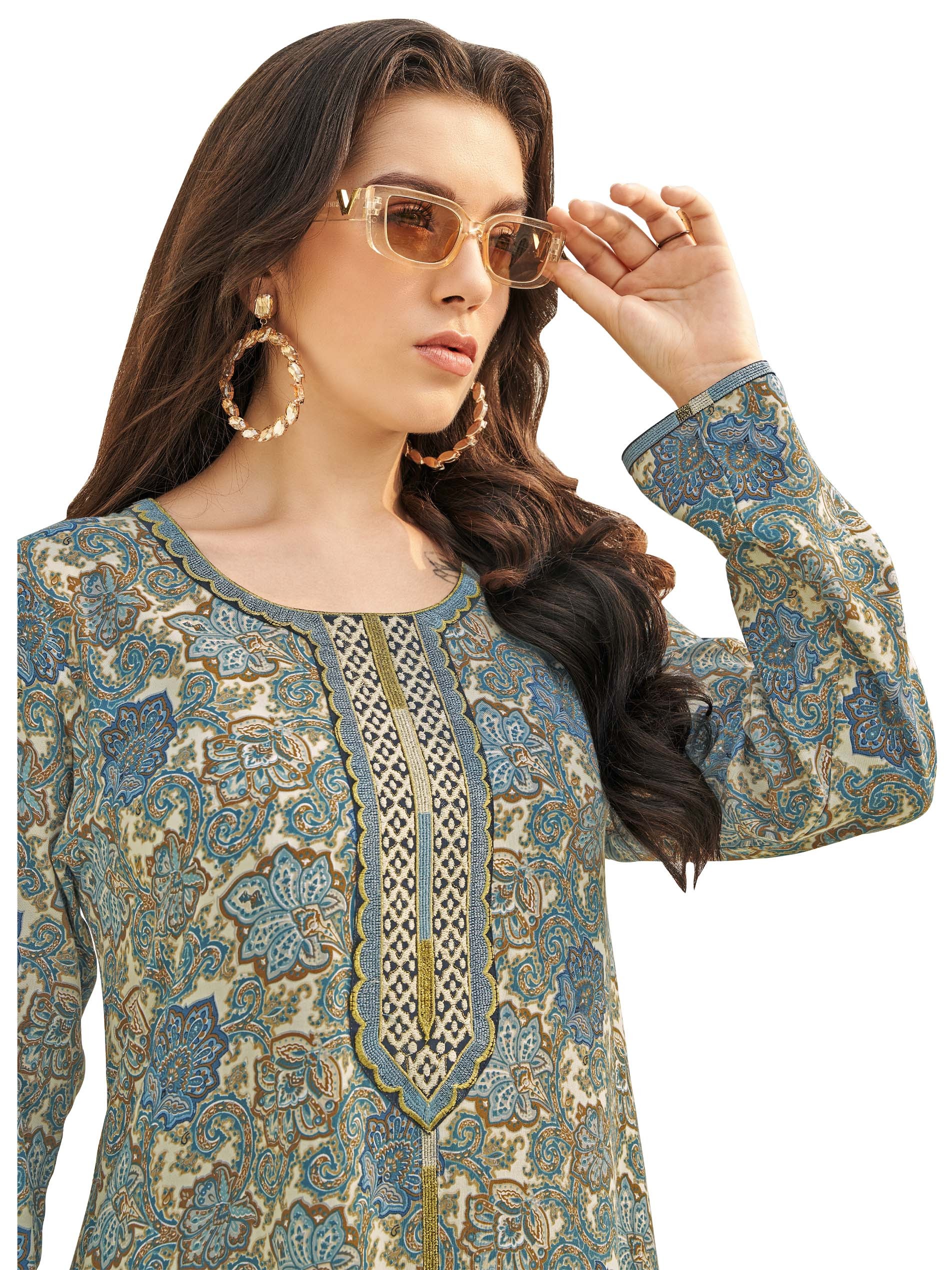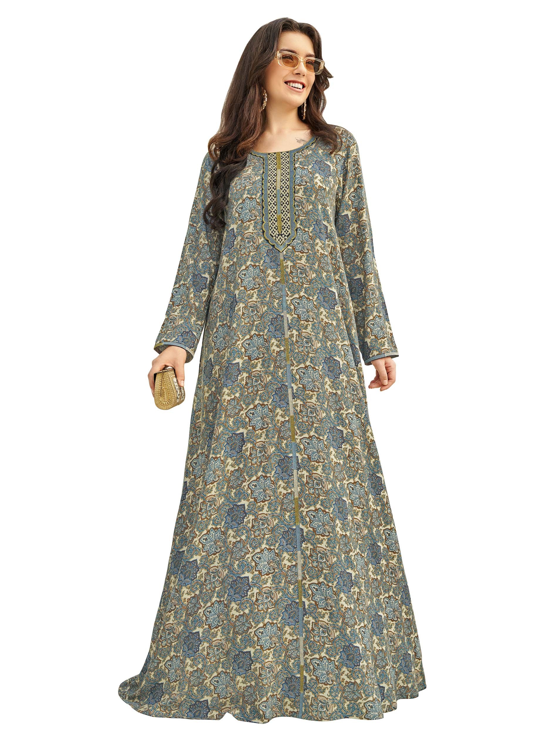 تألقي في الصيف بجلابية من الحرير الصناعي بنقشة الزهور مصممة باللونين الأزرق الفاتح والأبيض مع لمسة من اللون البني والأصفر. ويكتمل التصميم بأكمام طويلة وياقة مطرزة