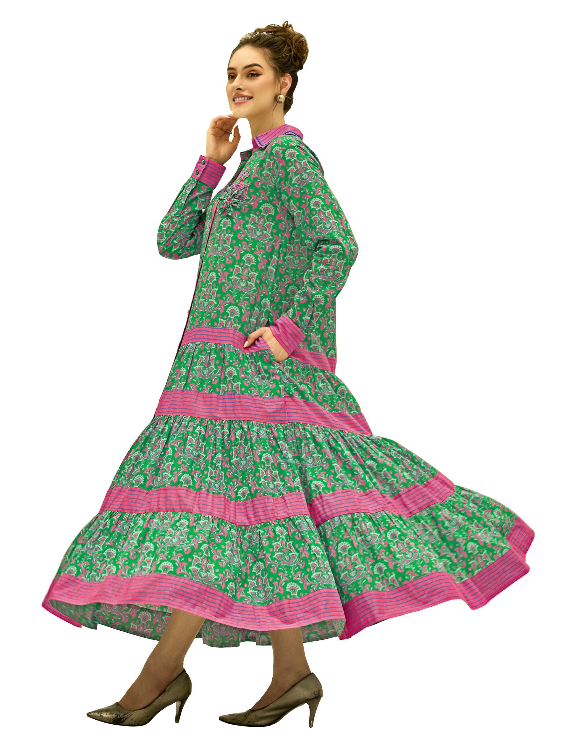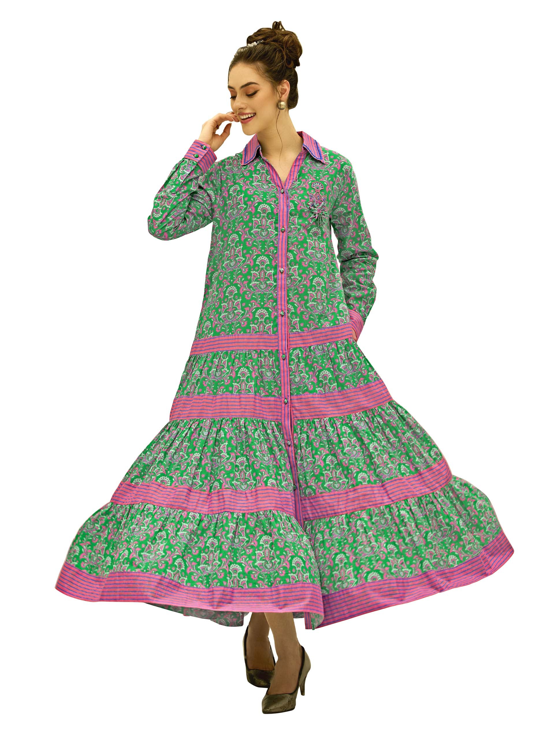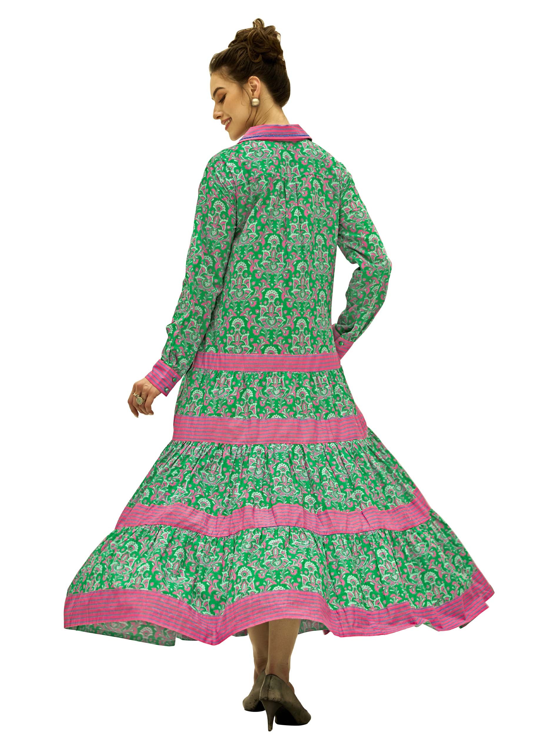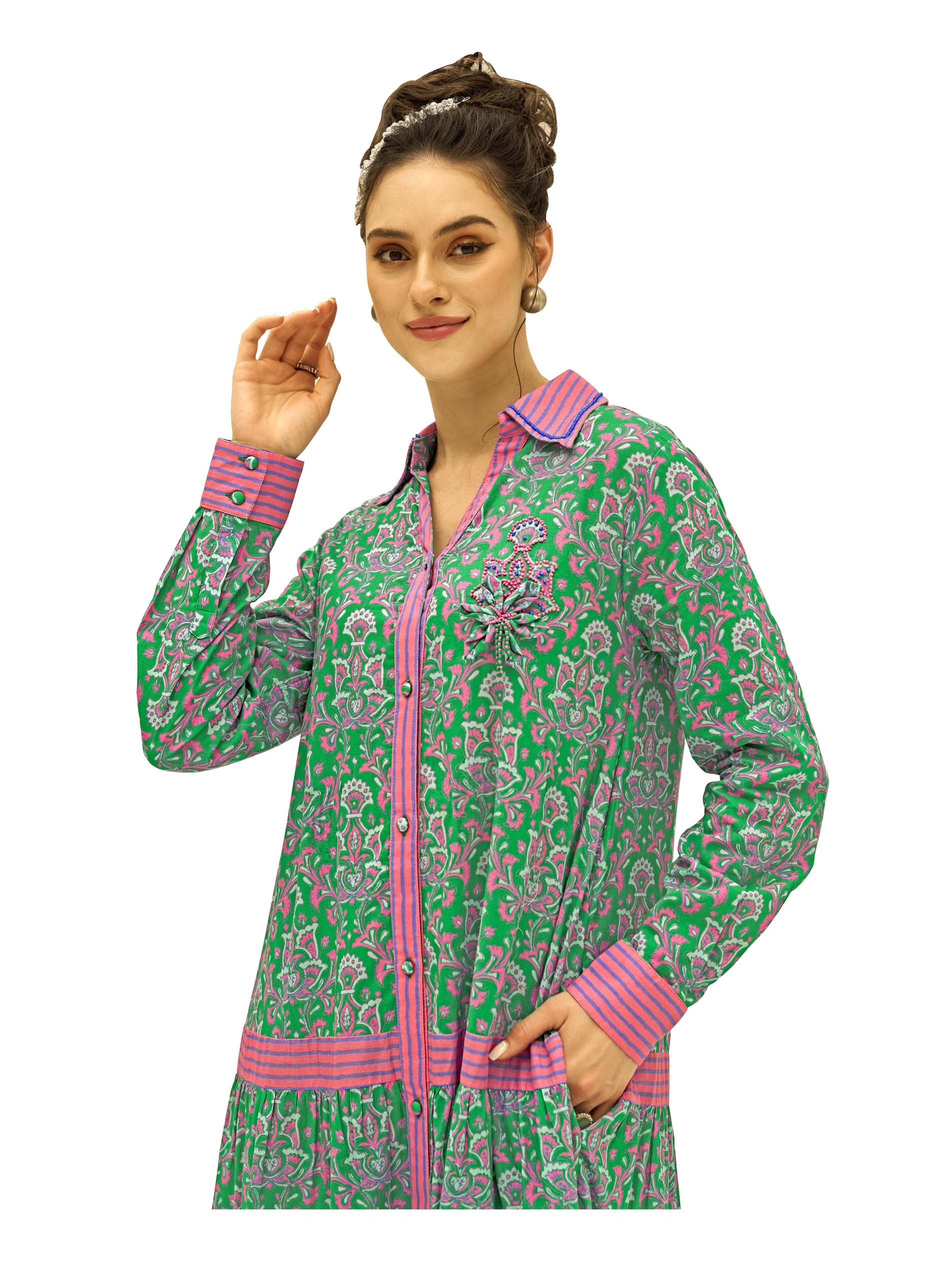 تتميز هذه الجلابية القطنية المطبوعة بتصميم مستوحى من الحدائق مع قاعدة خضراء، وطباعة زهرية، وطبقات متدرجة بخطوط وردية متباينة. تضيف لوحة الأزرار متعددة الطبقات، وقصّة الفلور، وياقة العنق مع تفاصيل الرقع اليدوية لمسة فريدة للفستان. مثالية للارتداء الصيفي غير الرسمي، يجمع هذا الفستان بين الراحة والأناقة بكل سهولة.