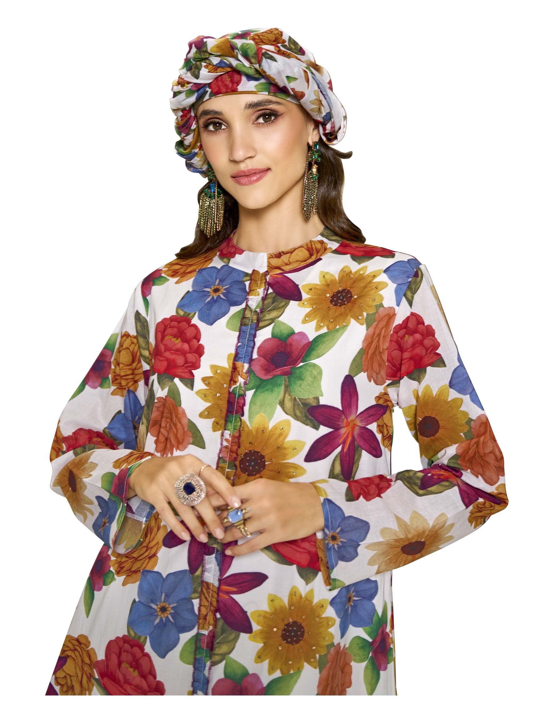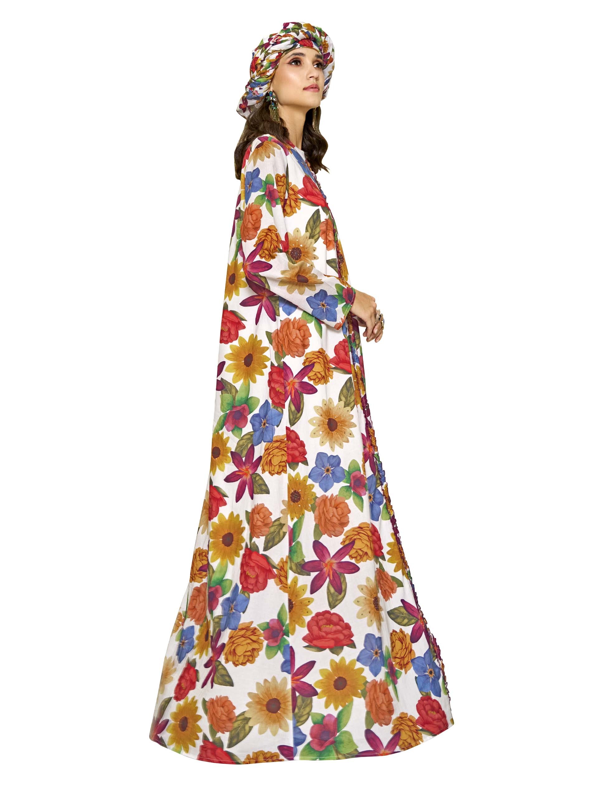 هذه الجلابية ذات القَصّة المُتَوَسِّعة مزينة بطبعة زهور متعددة الألوان التي تنتشر عبر القماش القطني، مما يخلق تصميمًا مفعمًا بالحيوية والجاذبية. تضيف تفاصيل الدانتيل والعمل بالخرز لمسة مرحة، بينما يضمن التصميم المنساب الراحة وسهولة الحركة. مثالية للمناسبات غير الرسمية، تضفي هذه القطعة أجواء صيفية مبهجة على أي خزانة ملابس.