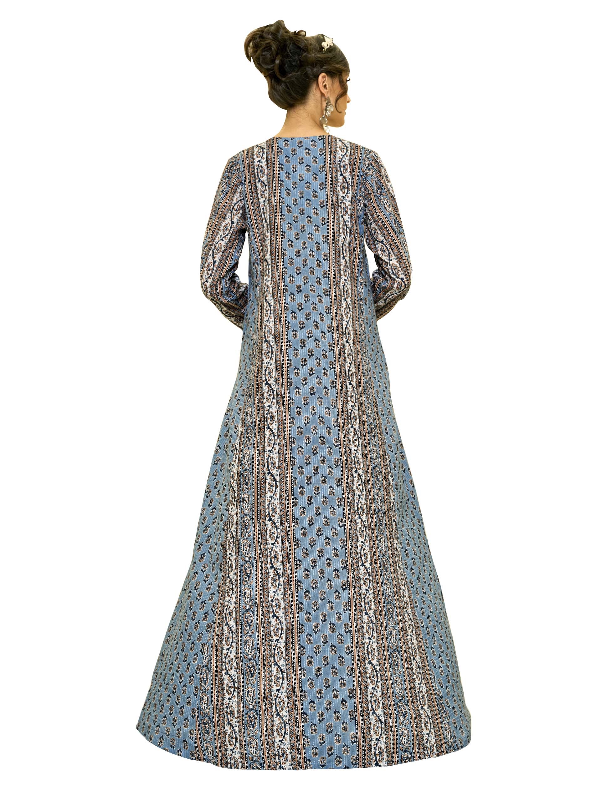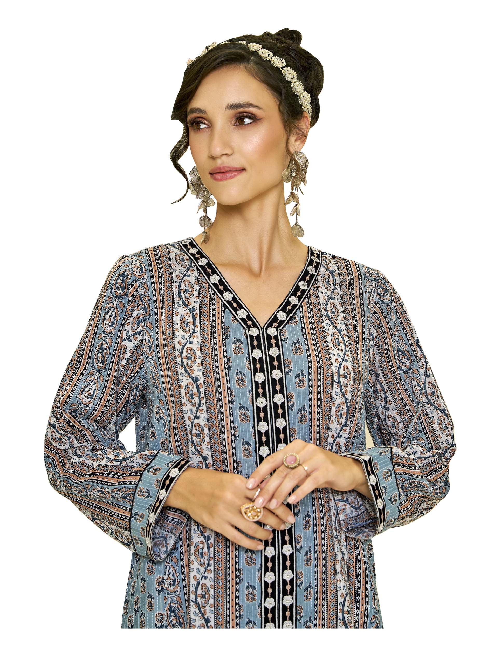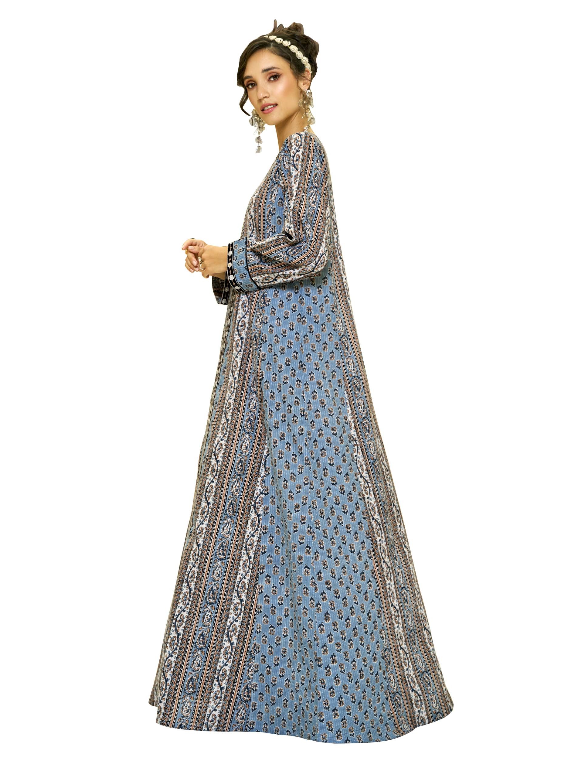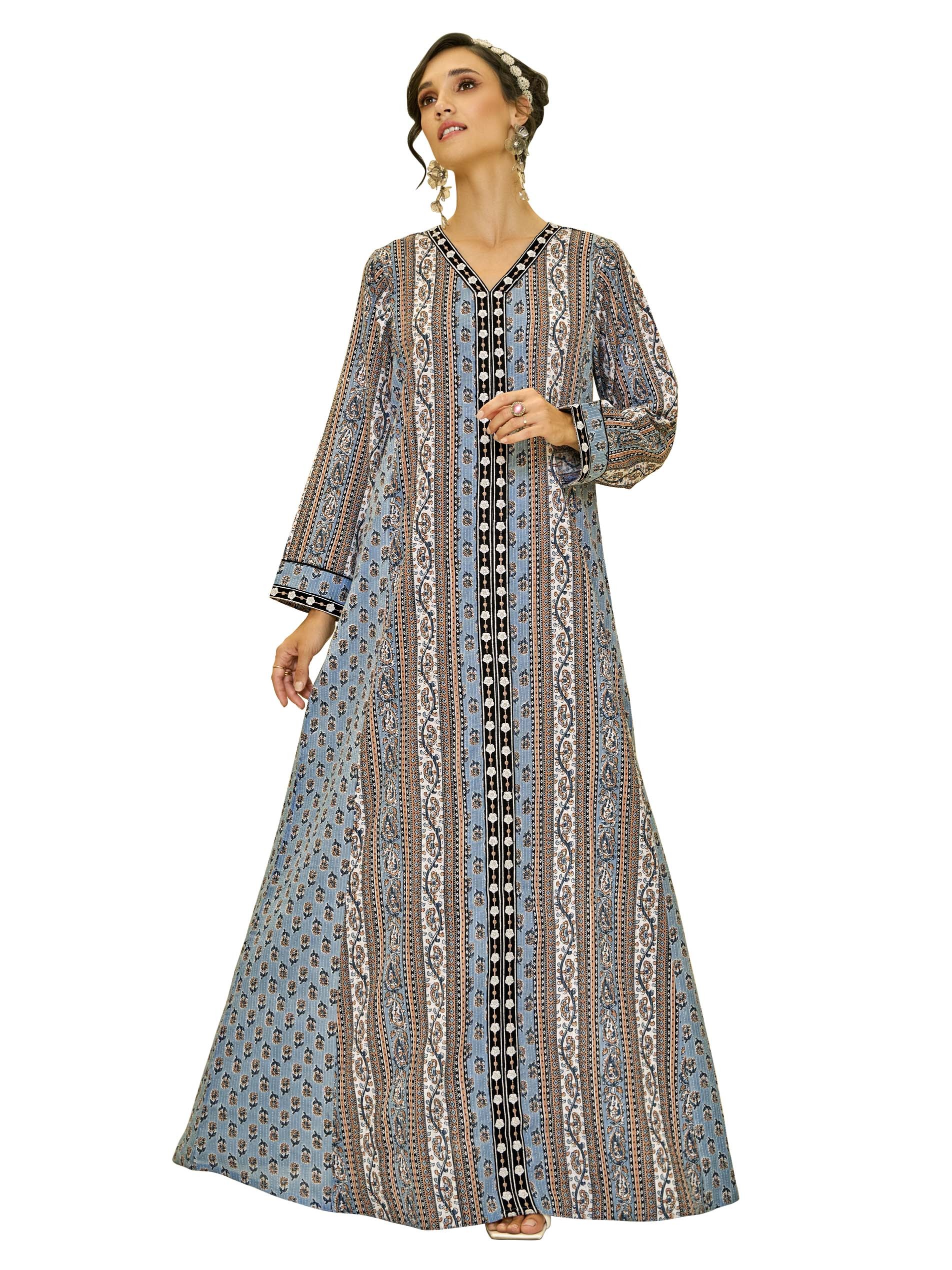 تتميز هذه الجلابية الأنيقة ذات القَصّة المُتَوَسِّعة المصنوعة من القطن القابل للتنفس بالراحة والنعومة للمناسبات الصيفية. تجمع بين الزخارف الزهرية والشرائط الهندسية بألوان الأزرق، والرمادي، والأبيض، والبني، مما يخلق مزيجًا من الأنماط الحيوية مع لمسة من الرقي. يضيف لوح التطريز لمسة إضافية من التفاصيل، مما يجعلها خيارًا مثاليًا للارتداء غير الرسمي مع لمسة من الأناقة.