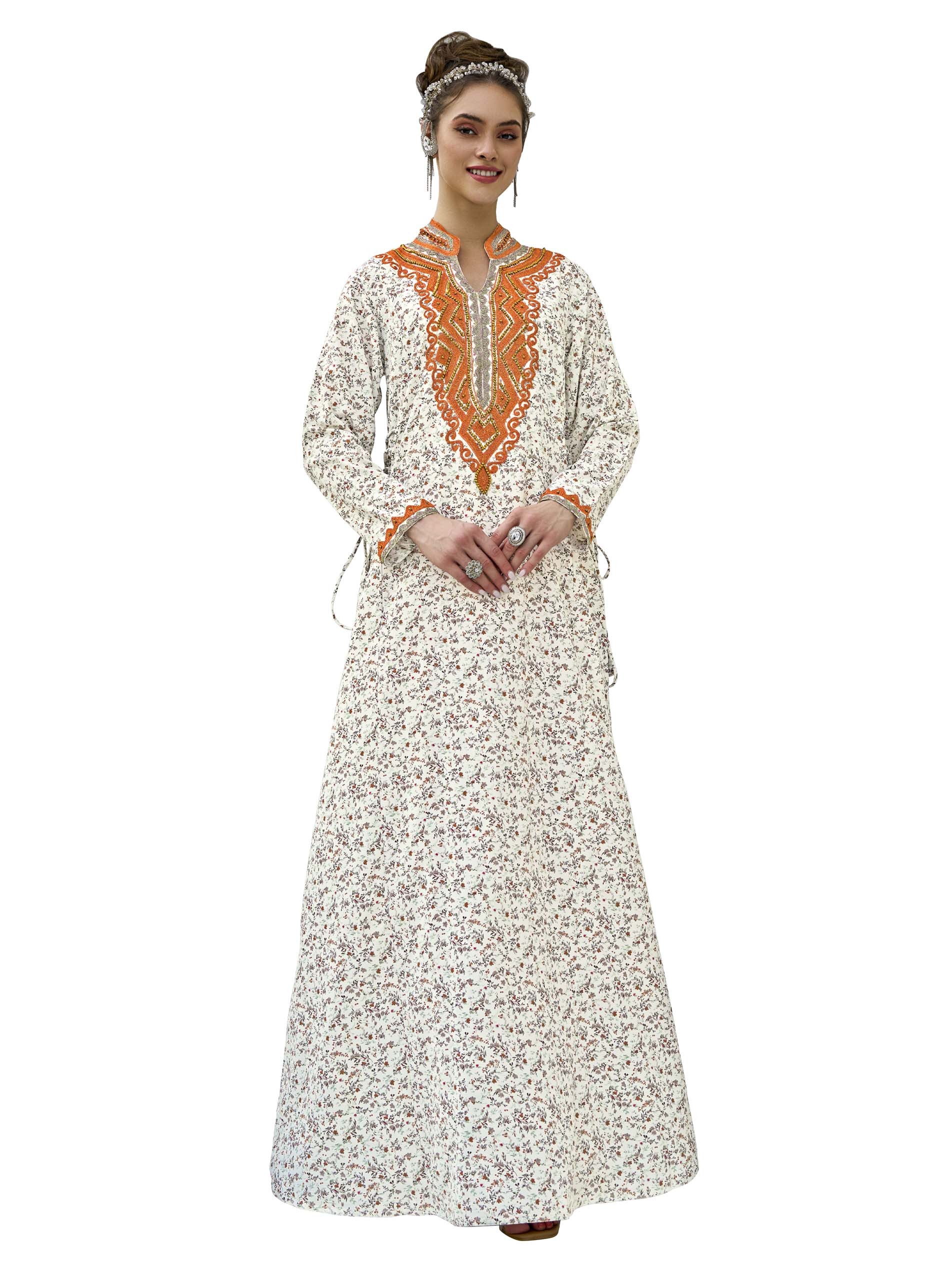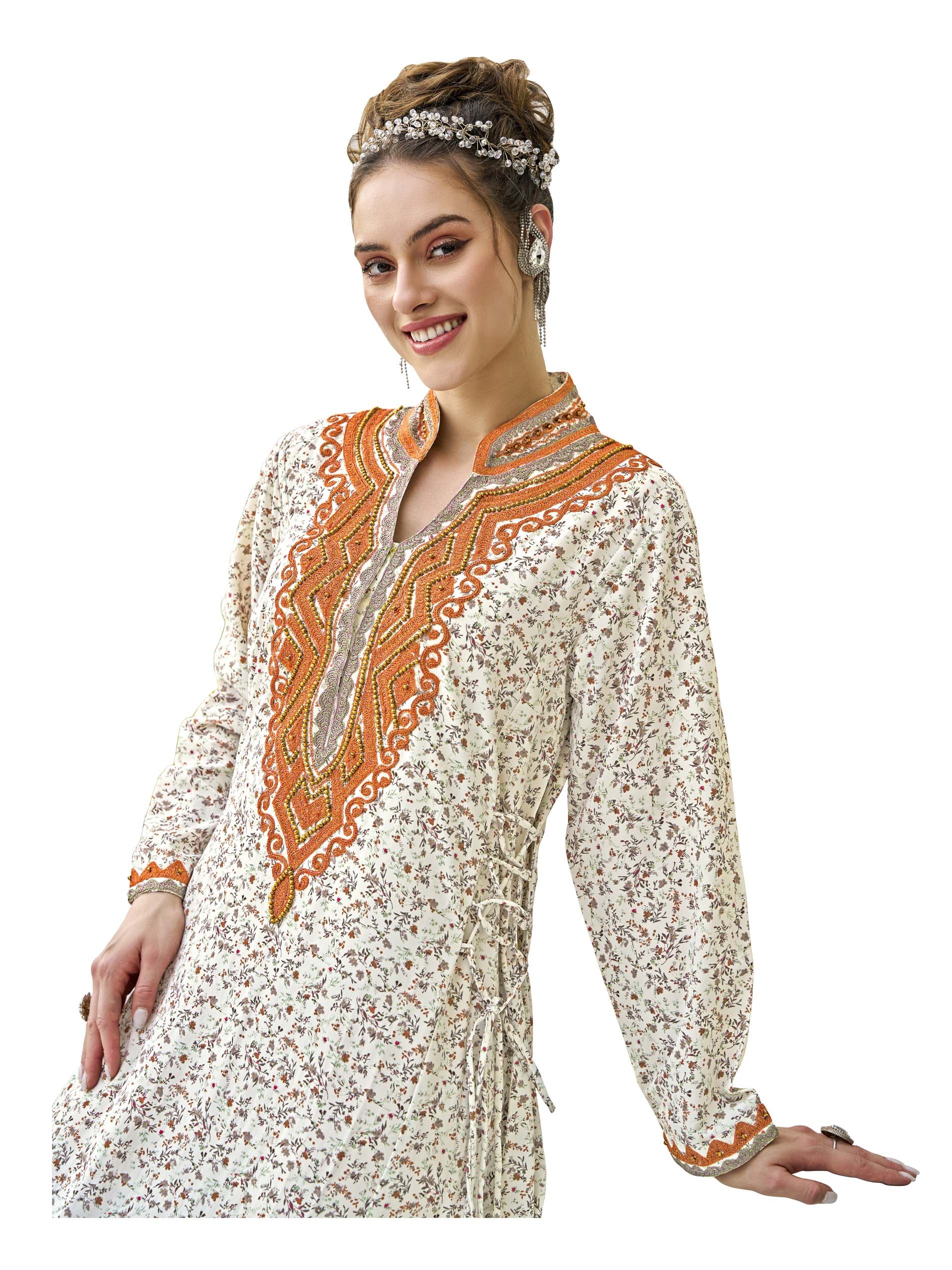 هذه الجلابية بقصّة متوسعة، المصنوعة من القطن القابل للتنفس، تتميز بطباعة زهور رقيقة، مثالية للمناسبات الصيفية غير الرسمية. يضيف التطريز المعقد والعمل اليدوي حول الياقة لمسة من الأناقة، بينما يضمن رباط الخصر ajuste مناسبًا ومريحًا. مثالية للأيام المريحة، تجمع هذه التصميم بين الأناقة والراحة بسلاسة.