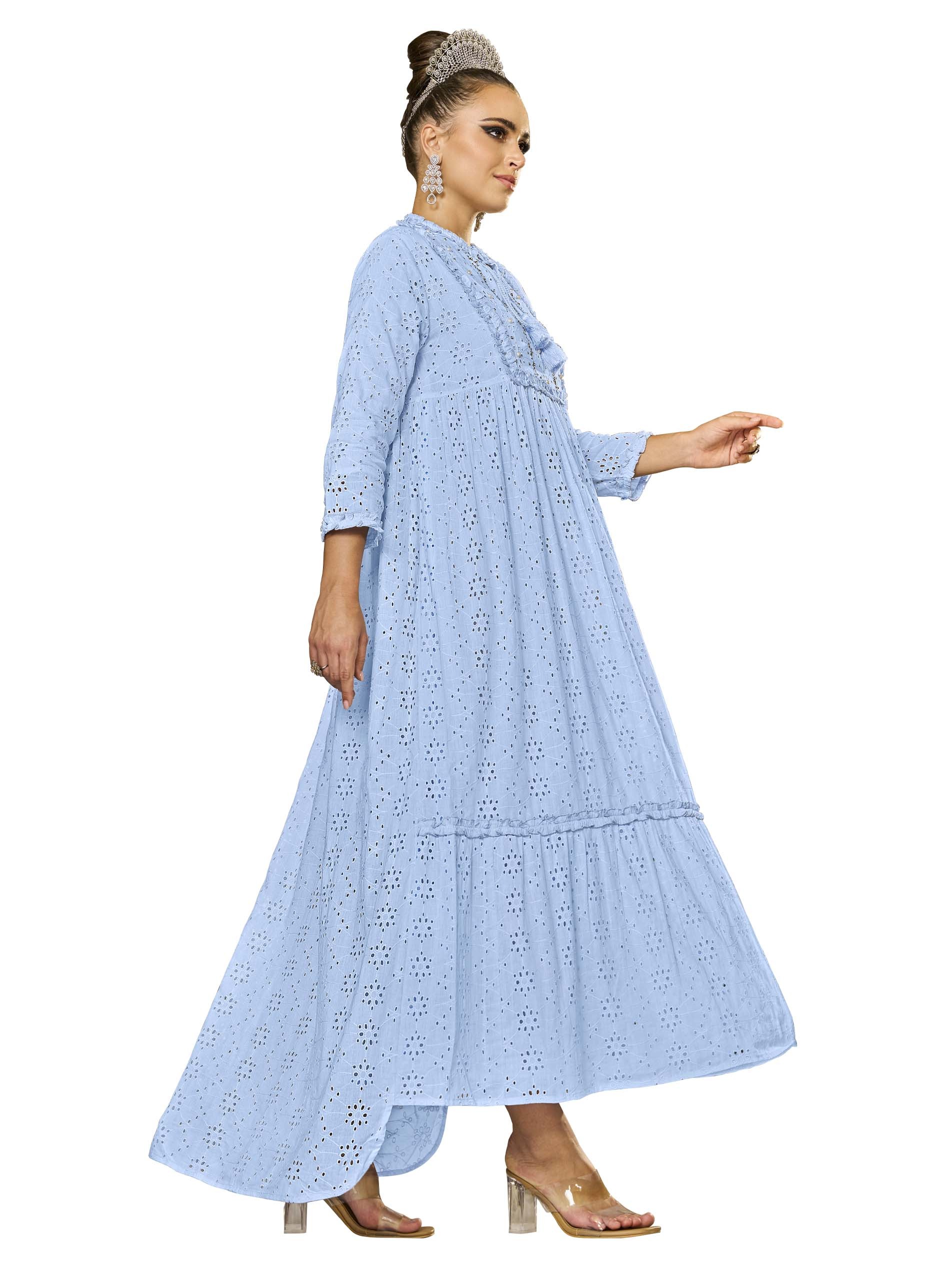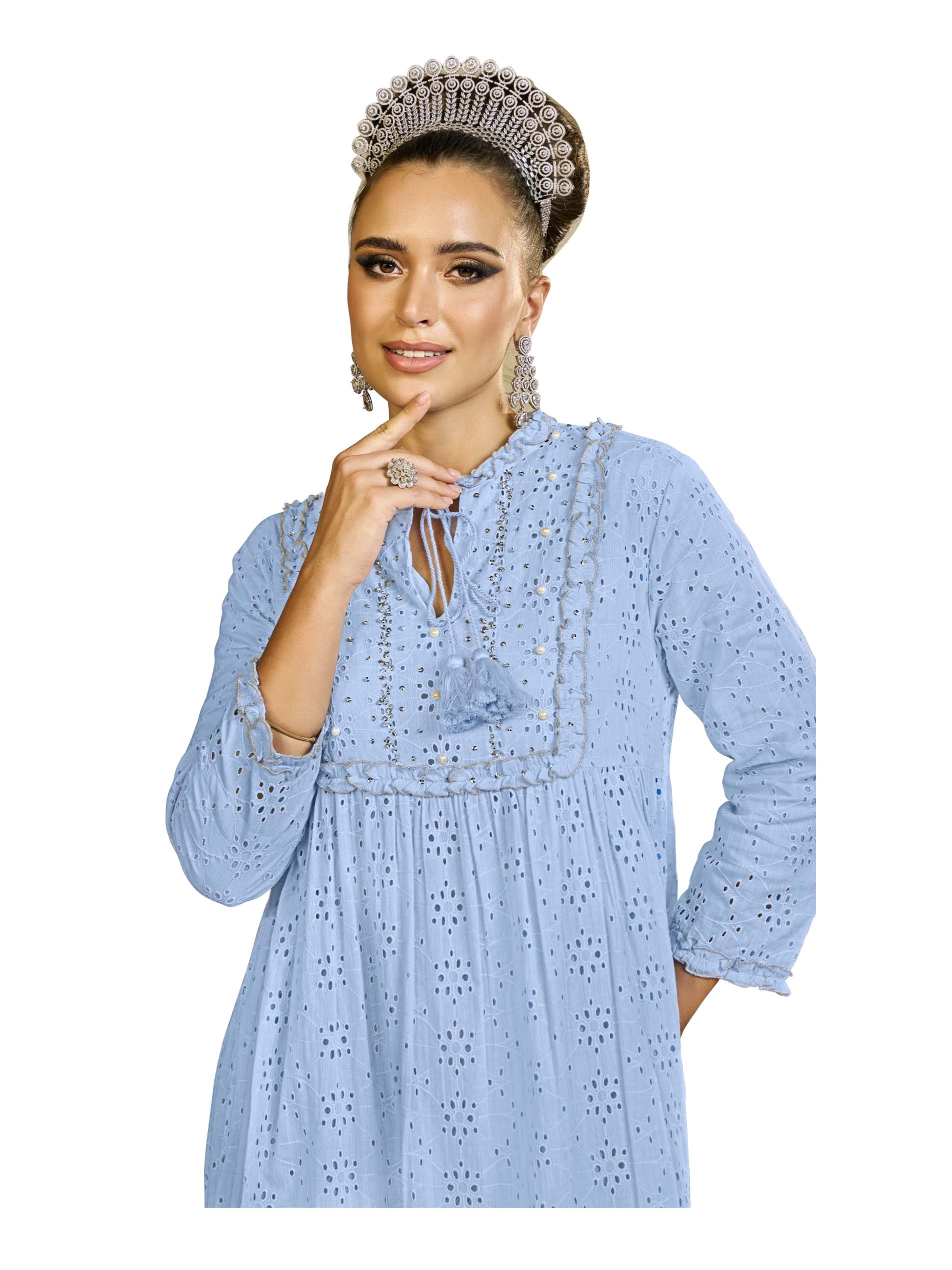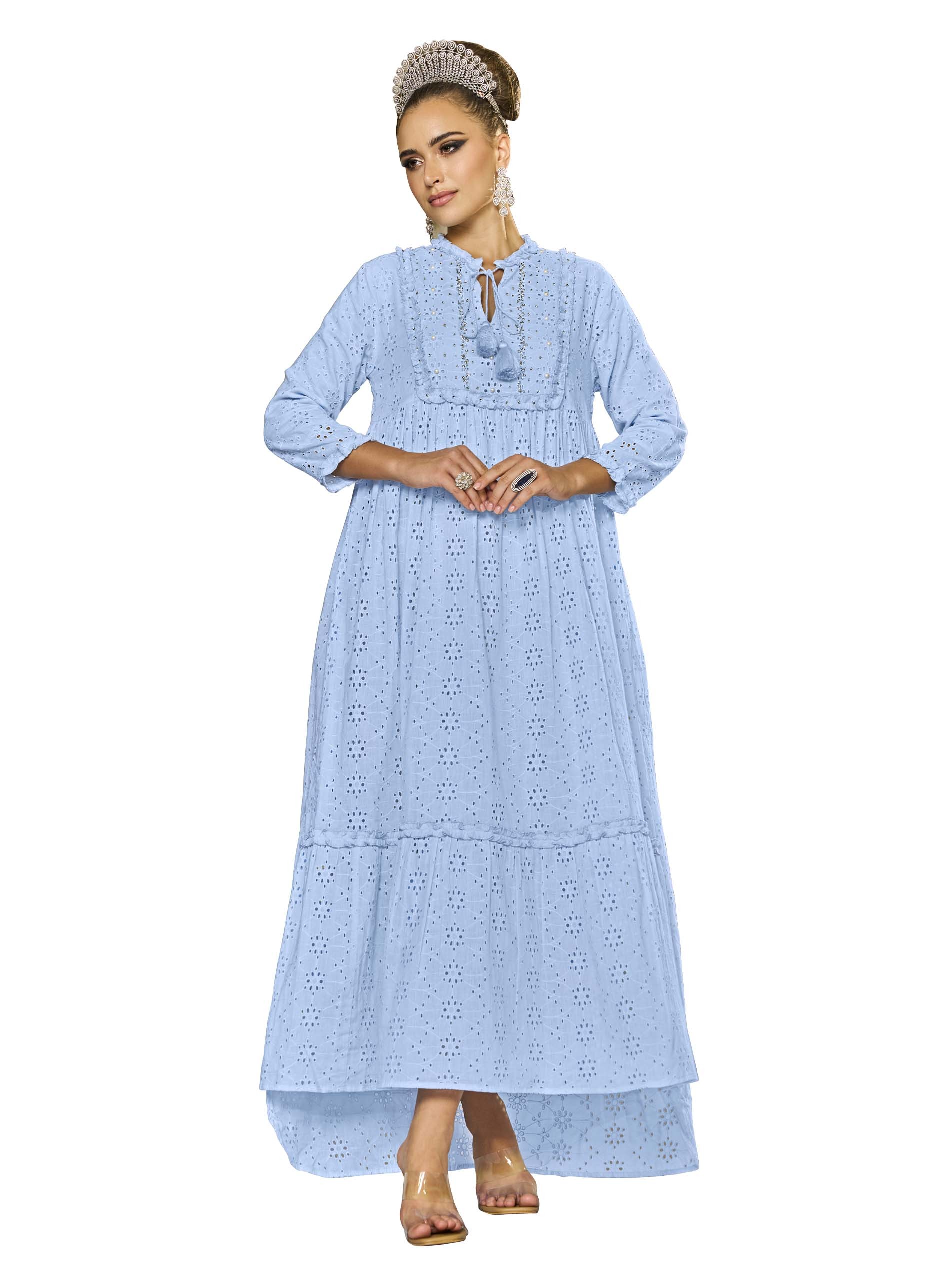هذه الجلابية القطنية الزرقاء الناعمة تتميز بأشكال الزهور المنتشرة في جميع أنحاء القماش، مع تفاصيل ربط ساحرة وخرزات في منطقة العنق لإضفاء لمسة فنية. يخلق القص نصف ونصف تناسقاً أنيقاً، بينما يضيف التصميم المتدرج عمقاً للقطع. مثالية لموسم رمضان، فهي أنيقة ومريحة في حرارة الصيف.