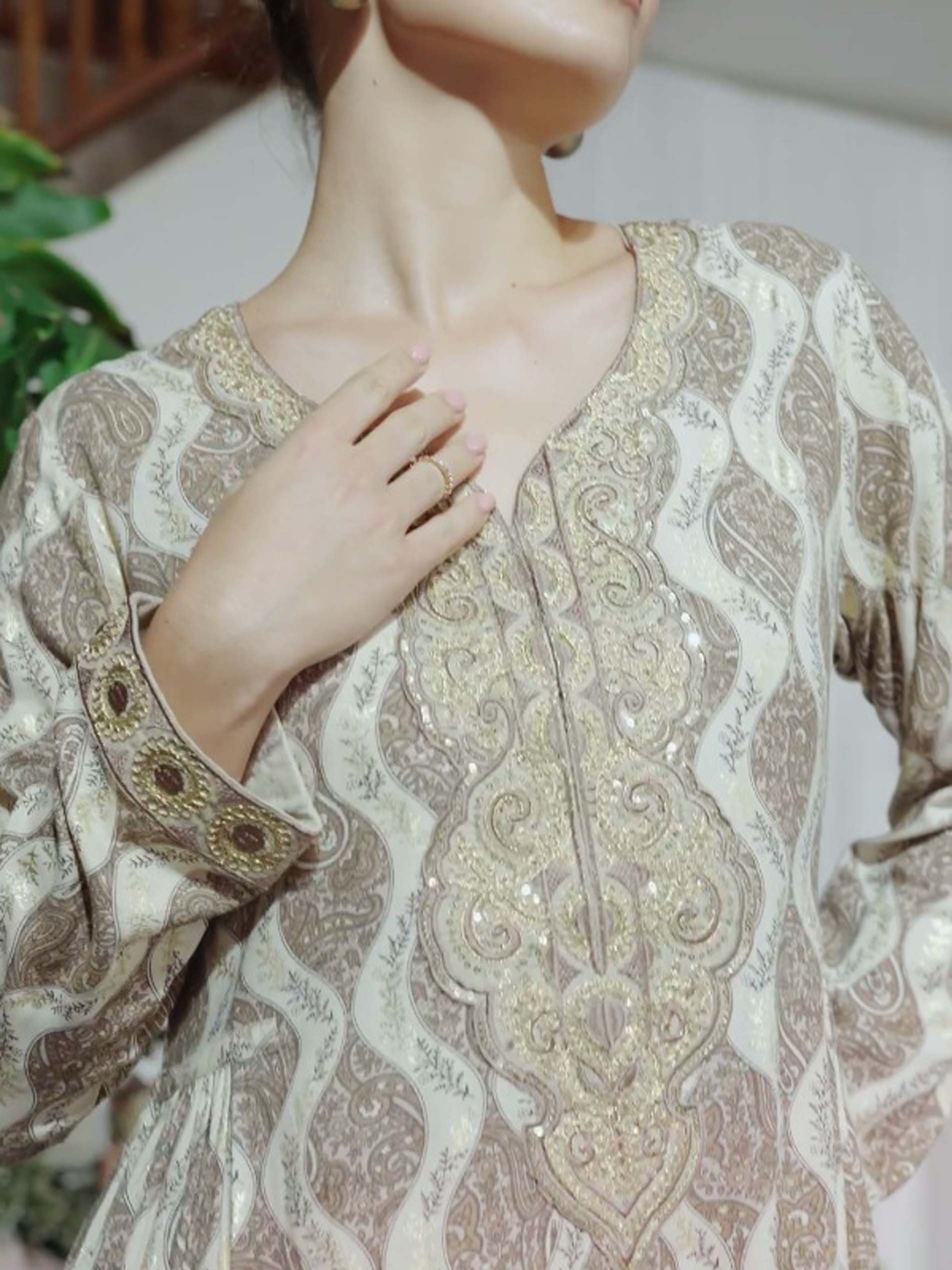 تتميز هذه الجلابية بالقَصّة المُتَوَسِّعة المصنوعة من القطن بطبعة فويل داماسك جذابة بألوان دافئة وترابية من البني والبيج، مع تطريز دقيق. يضيف تفصيل التجميع الجانبي لمسة من الجمال على القَصّة، مما يخلق تدفقًا أنيقًا ويضيف لمسة بصرية. مصنوعة من القماش القابل للتنفس، تجمع بين الراحة والأناقة، مما يجعلها مثالية للصيف واحتفالات رمضان.