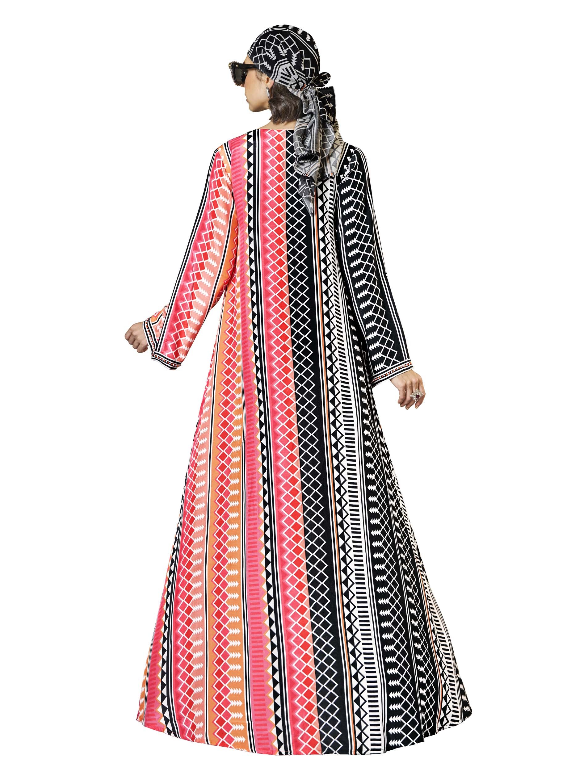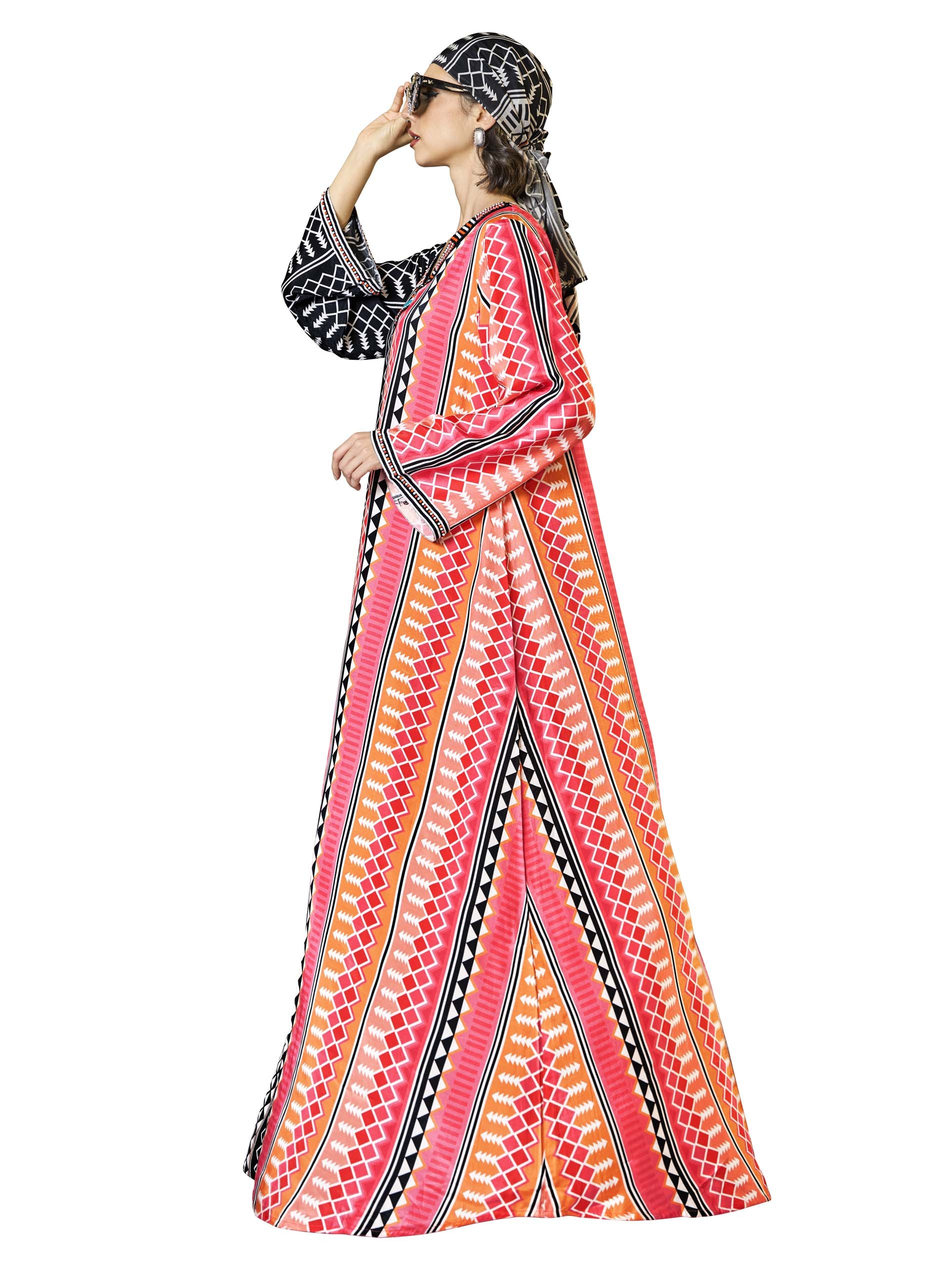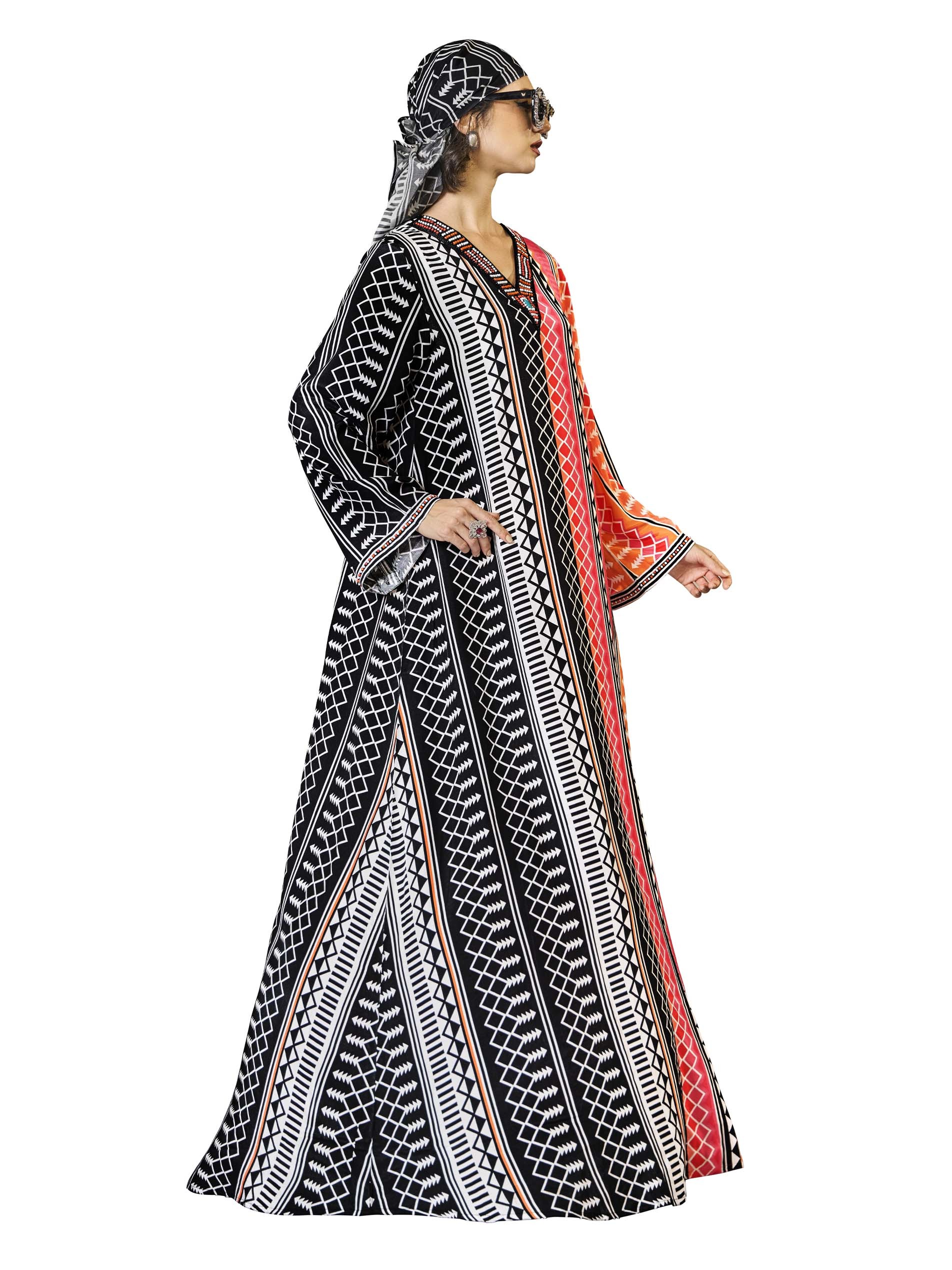 تتميز هذه الجلابية ذات القَصّة المُتَوَسِّعة، المصنوعة من القطن القابل للتنفس، بطباعة هندسية لافتة بالألوان الأسود والأبيض والأحمر والبرتقالي، مما يضيف عمقًا وجاذبية بصرية. كما أن العمل اليدوي بالخيوط المكررة على الياقة يعزز من جاذبيتها الأنيقة، مما يجعلها خيارًا مثاليًا لأي حفلة صيفية.