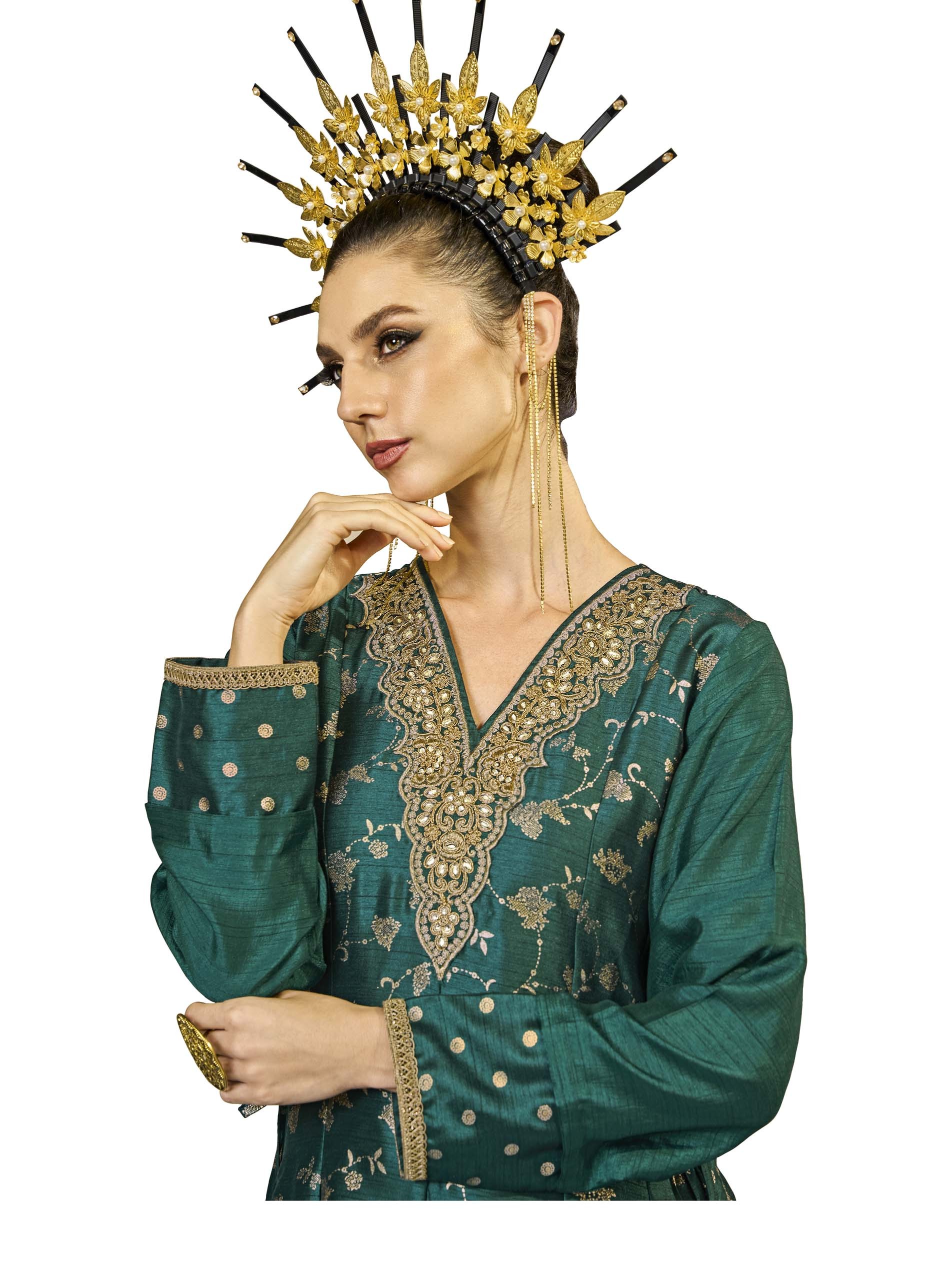 هذه الجلابية القطنية الأنيقة باللون الأخضر الزمردي الغني تتميز بقَصّة مُتَوَسِّعة تكمل القوام بأناقة. مزينة بتطريز زهور معقد ونقوش من النقاط الذهبية الدقيقة، تجمع بين التقليد والرقي. مثالية لاحتفالات رمضان، فهي توفر الأناقة والراحة لموسم الصيف.